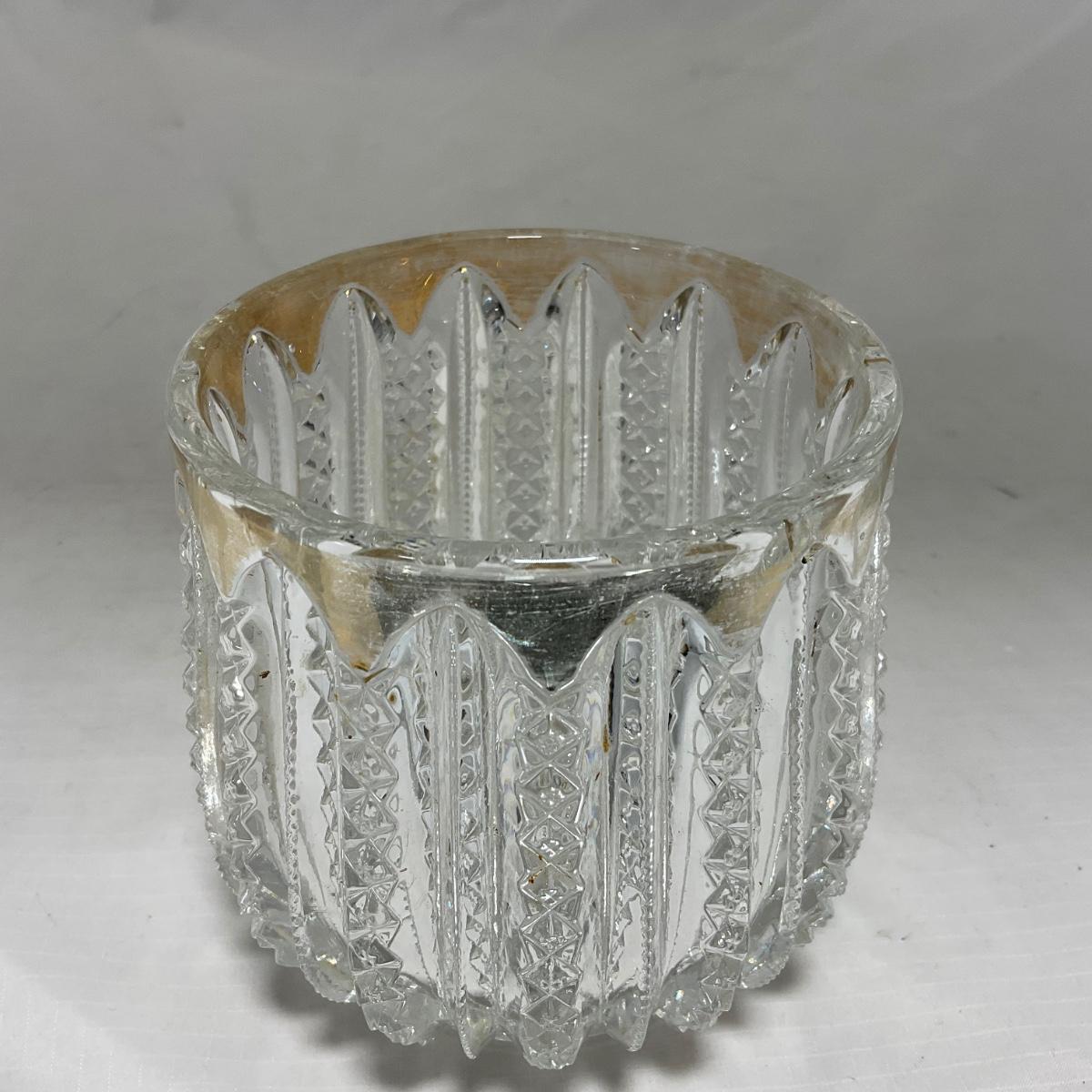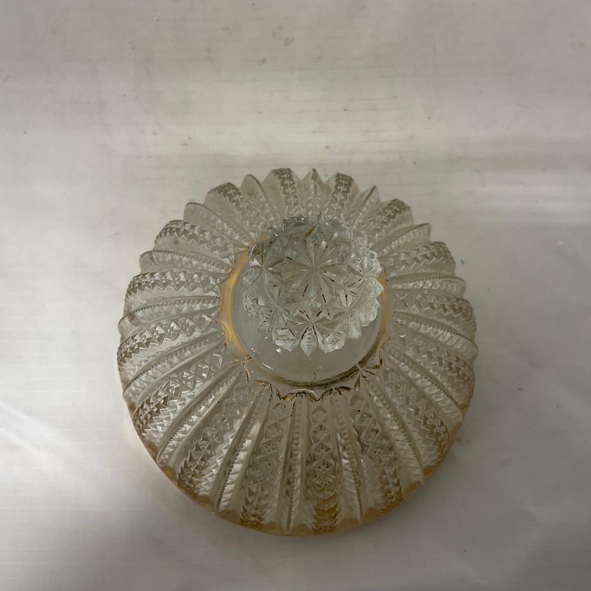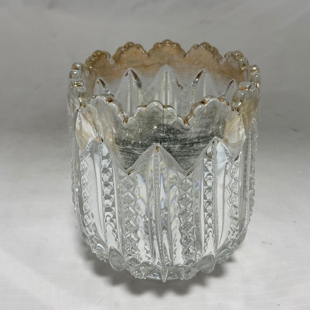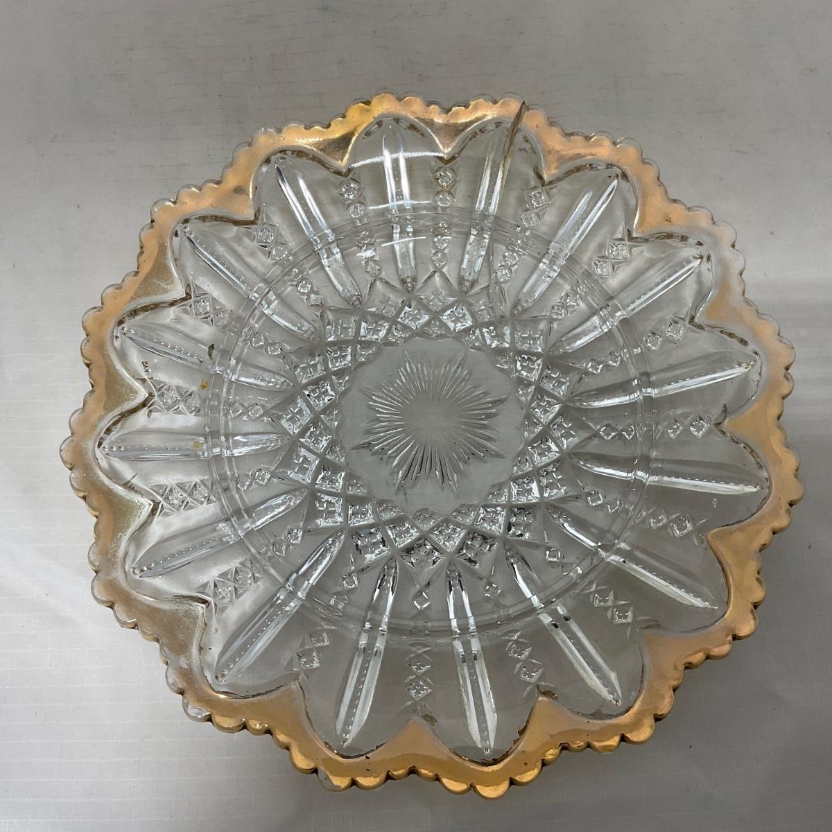 Clear glass with gold accents set. With gold accents and a cross checked type pattern this set has a classic elegant look. Set includes covered butter dish, lidded jar, creamer and sugar set. Please see photos for details and condition. ::: Shipping is available on this lot. If you require shipping you must let us know at the close of the auction. We will coordinate with you after the item has been won. Shipping fees will include insurance up to or exceeding the value of all items being mailed. If you have any questions regarding this lot please contact the auctioneer either via this website, by direct email or by phone. PICK UP TIMES and other important information can be found in the TERMS and DESCRIPTION of the auction. Please take a look for pertinent information. Thanks!