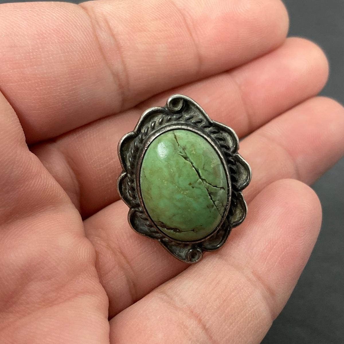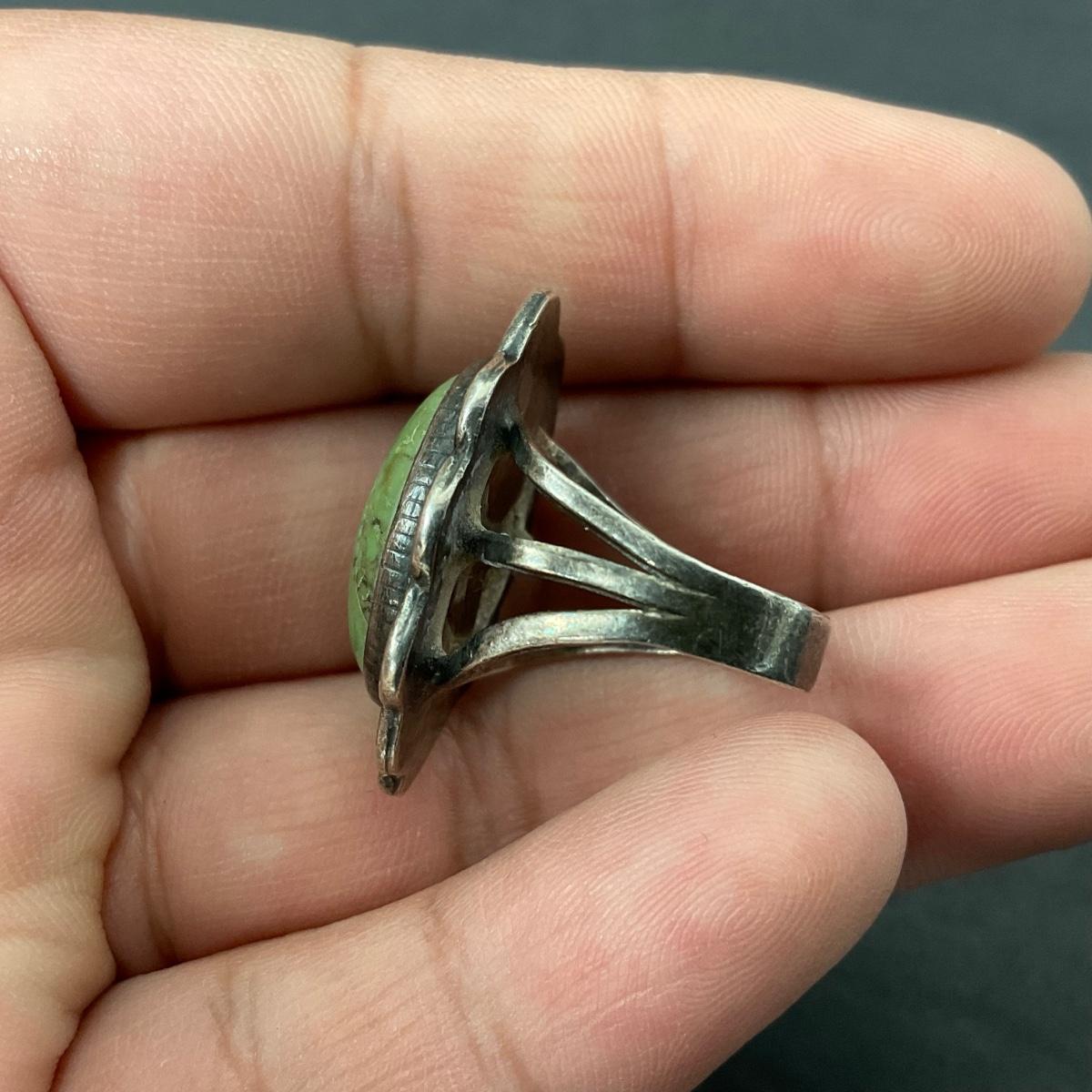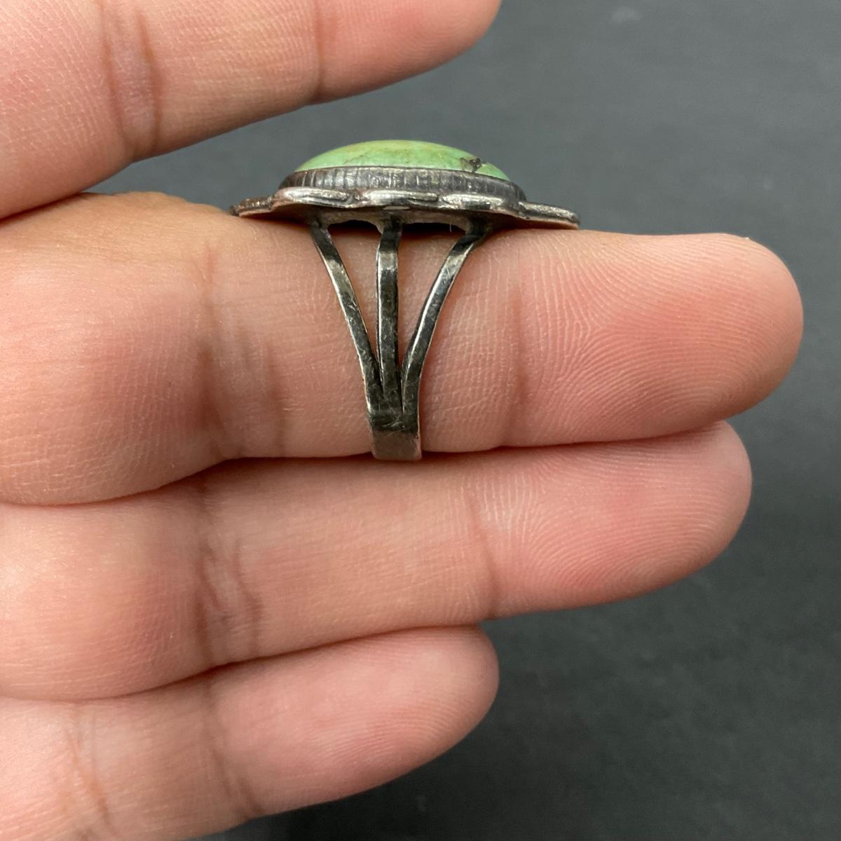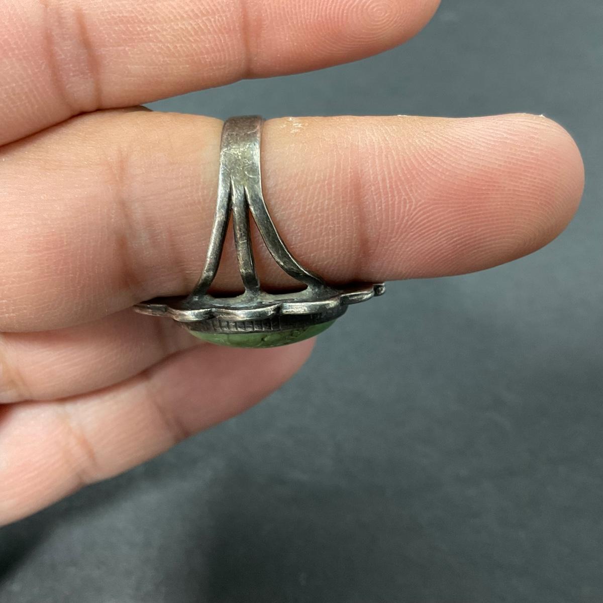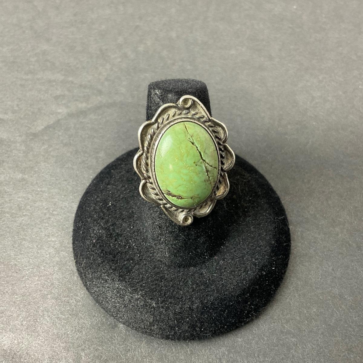 One oval in shape polished stone ring. This ring does have a crack running though the stone but otherwise appears to be in good shape. This ring is a size . Please see photos for details and condition. Any condition statement is given as a courtesy to a client, is an opinion, and should not be treated as a statement of fact. Reference to condition written, oral or within a condition report shall not be regarded as a full account of condition and may not include all defects, alterations, or restorations. Absence of a condition report does not imply a lot is flawless or lacking imperfections or damage. Katherine’s Auction & Appraisal Service shall have no responsibility for any error or omission. Returns shall not be accepted on the basis of condition. ::: Shipping is available on this lot. If you require shipping you must let us know at the close of the auction. We will coordinate with you after the item has been won. Shipping fees will include insurance up to or exceeding the value of all items being mailed. If you have any questions regarding this lot please contact the auctioneer either via this website, by direct email or by phone. PICK UP TIMES and other important information can be found in the TERMS and DESCRIPTION of the auction. Please take a look for pertinent information. Thanks!