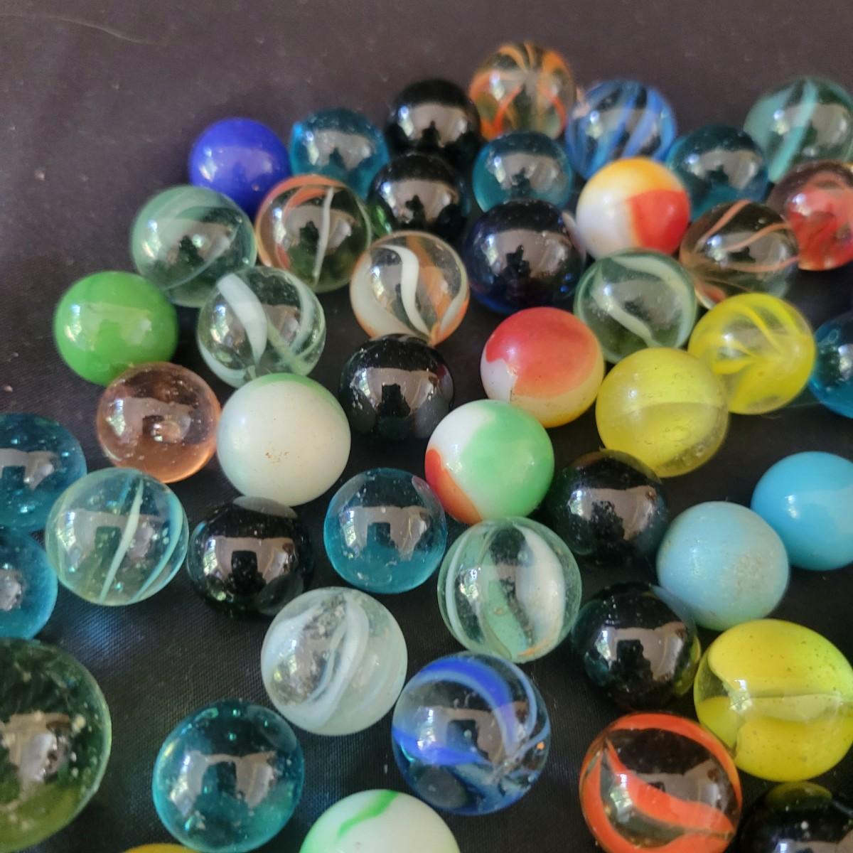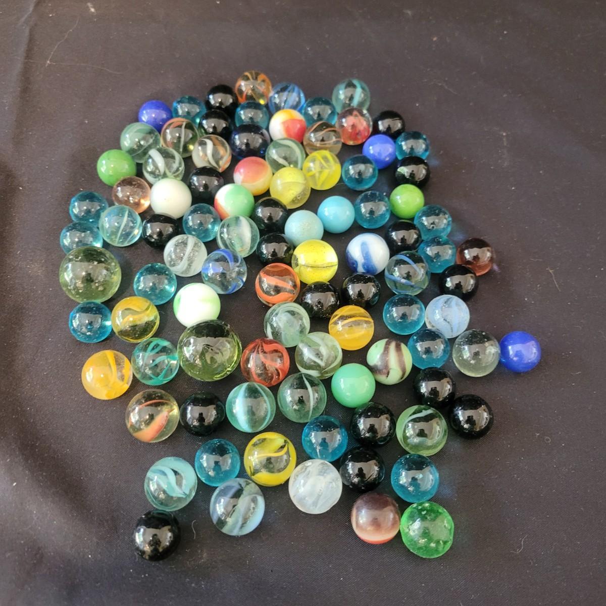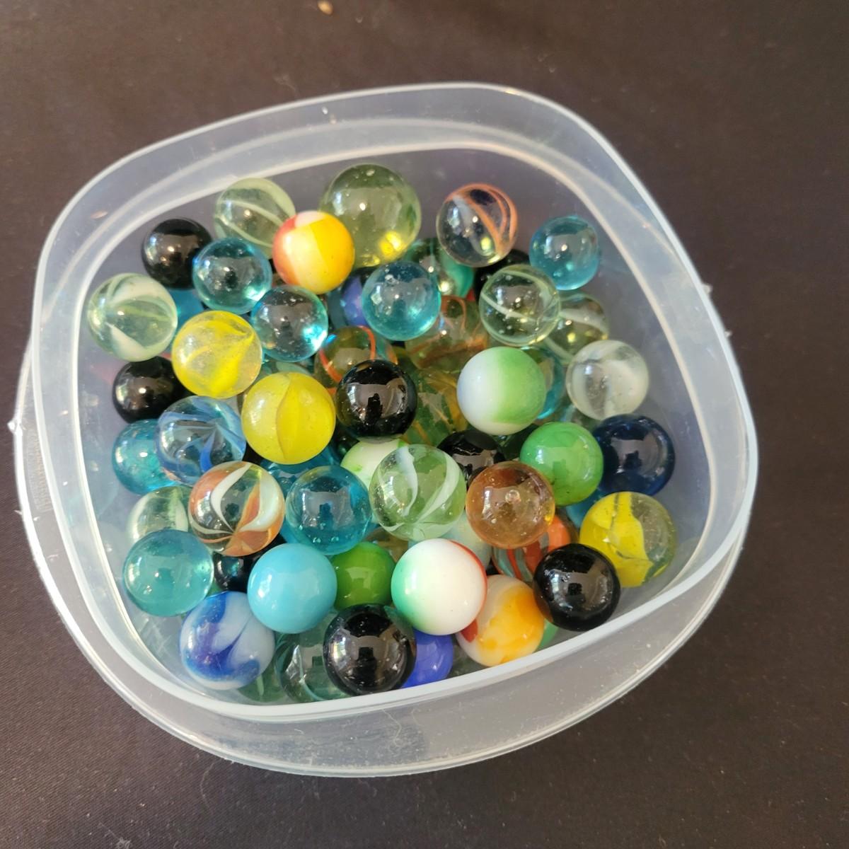 An assortment of approximately 94 marbles in different sizes and colors. All are glass. Includes a plastic container to keep them contained. Shipping available