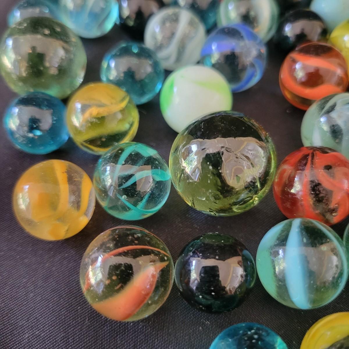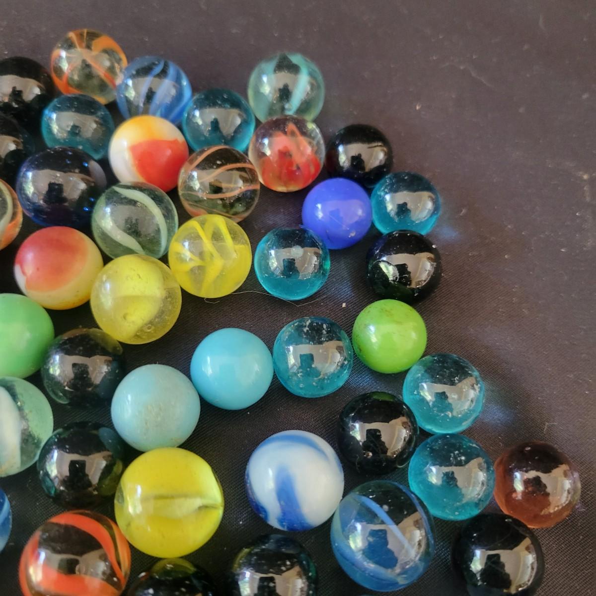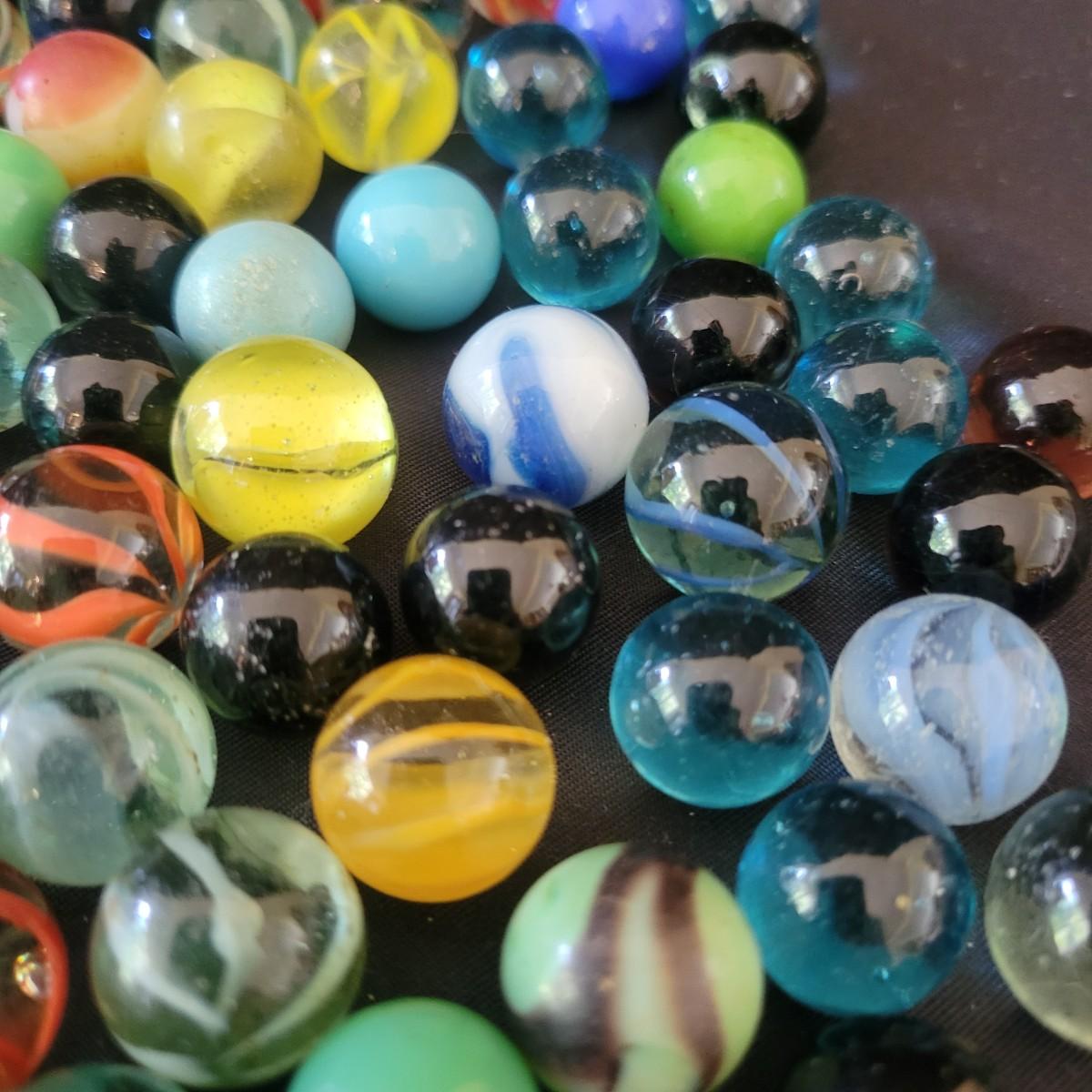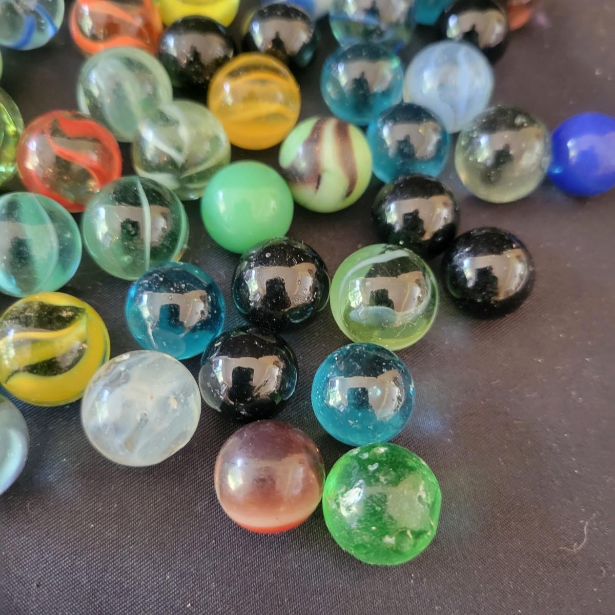 An assortment of approximately 94 marbles in different sizes and colors. All are glass. Includes a plastic container to keep them contained. Shipping available