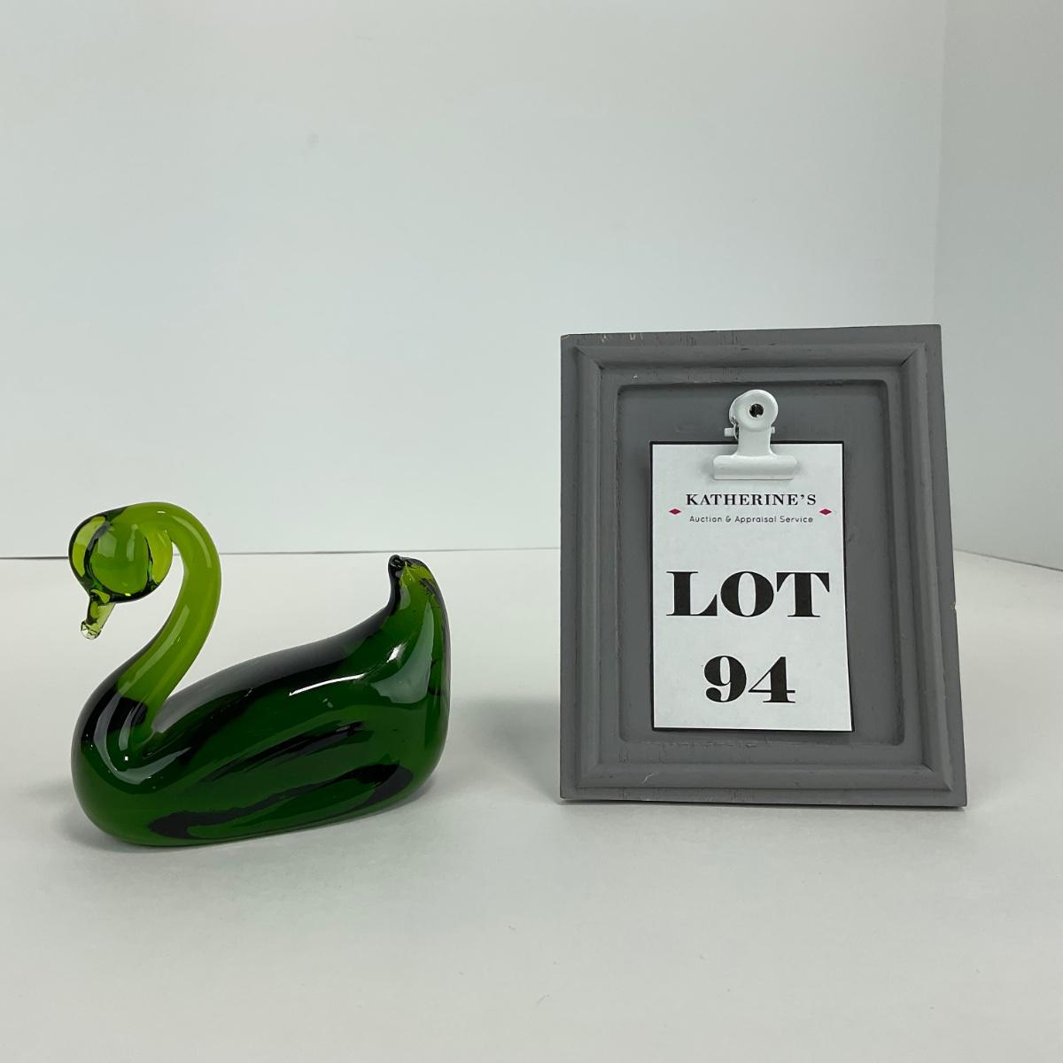 One green Pilgrim swan paperweight. Has a few scratches and minor scrapes on the bottom but otherwise appears to be in good shape. Please see photos for details and condition. Any condition statement is given as a courtesy to a client, is an opinion, and should not be treated as a statement of fact. Reference to condition written, oral or within a condition report shall not be regarded as a full account of condition and may not include all defects, alterations, or restorations. Absence of a condition report does not imply a lot is flawless or lacking imperfections or damage. Katherine’s Auction & Appraisal Service shall have no responsibility for any error or omission. Returns shall not be accepted on the basis of condition. ::: Shipping is available on this lot. If you require shipping you must let us know at the close of the auction. We will coordinate with you after the item has been won. Shipping fees will include insurance up to or exceeding the value of all items being mailed. If you have any questions regarding this lot please contact the auctioneer either via this website, by direct email or by phone. PICK UP TIMES and other important information can be found in the TERMS and DESCRIPTION of the auction. Please take a look for pertinent information. Thanks!