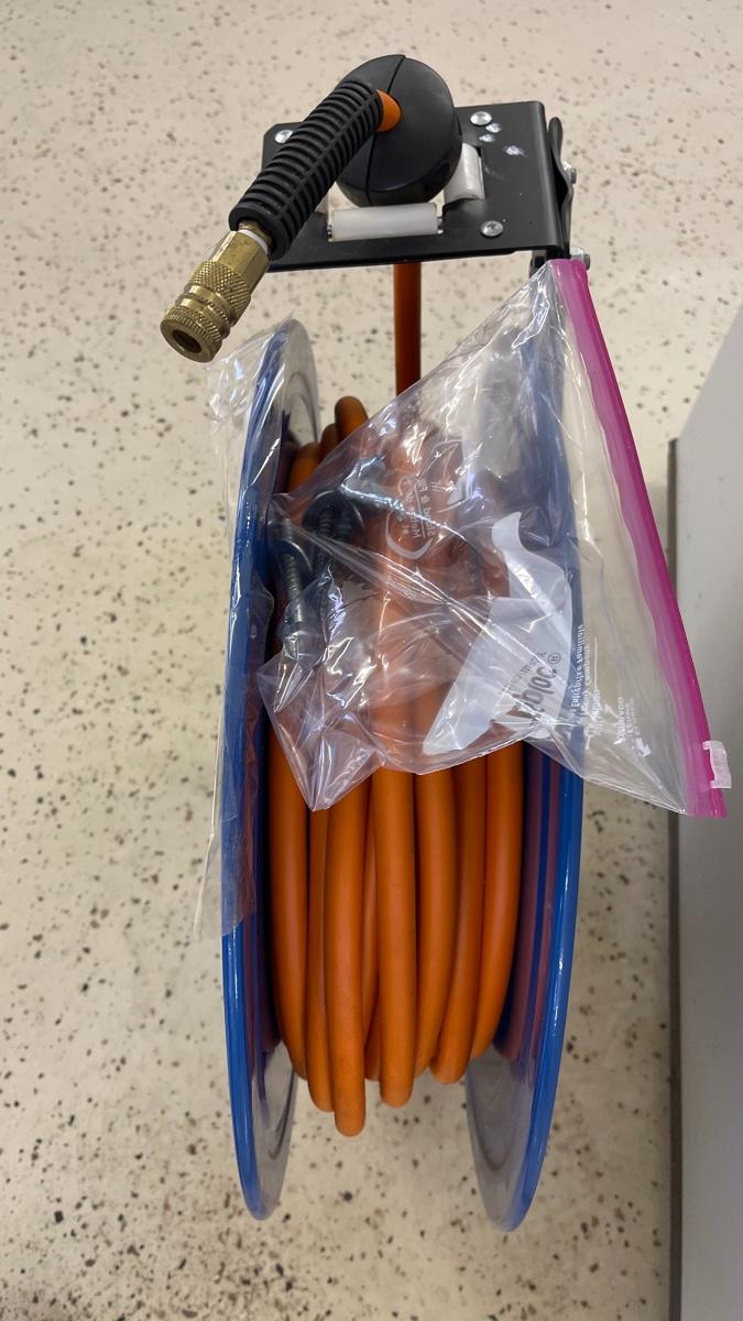 Can be mounted on a wall or ceiling. Comes w/mounting screws used when mounted to garage wall wooden studs on-site. Hose reel has been uninstalled. aAir hose and reel are in great shape. Different mounting screws may be required based on type of mounting surface and/or area. Hose length: 50’-0” x 3/8” diameter