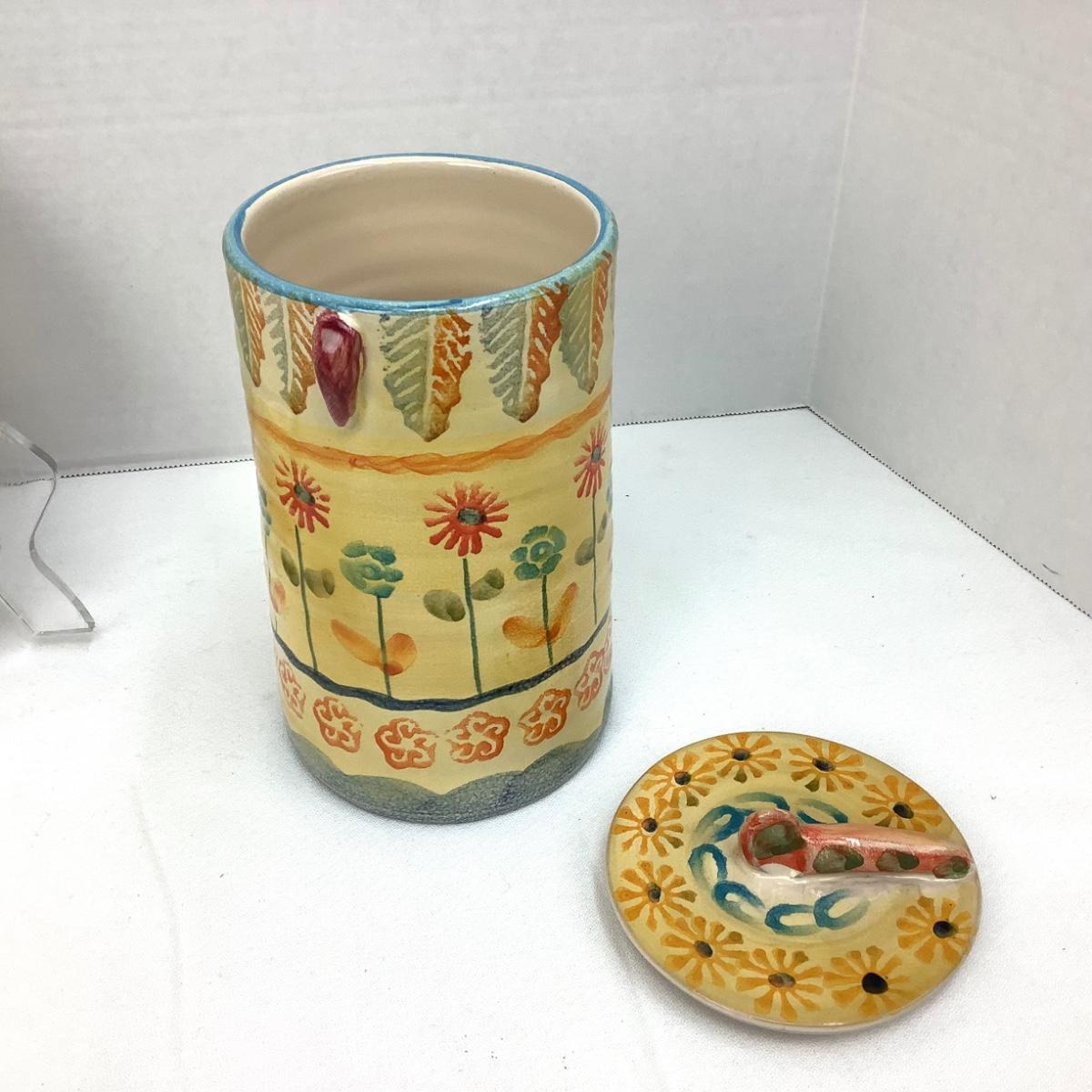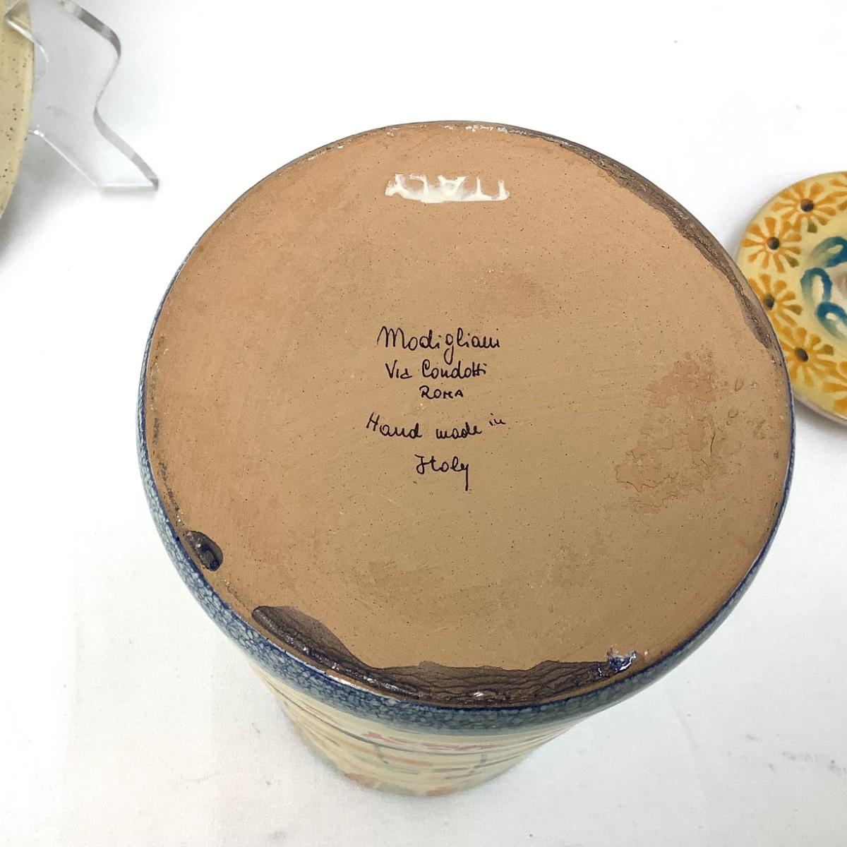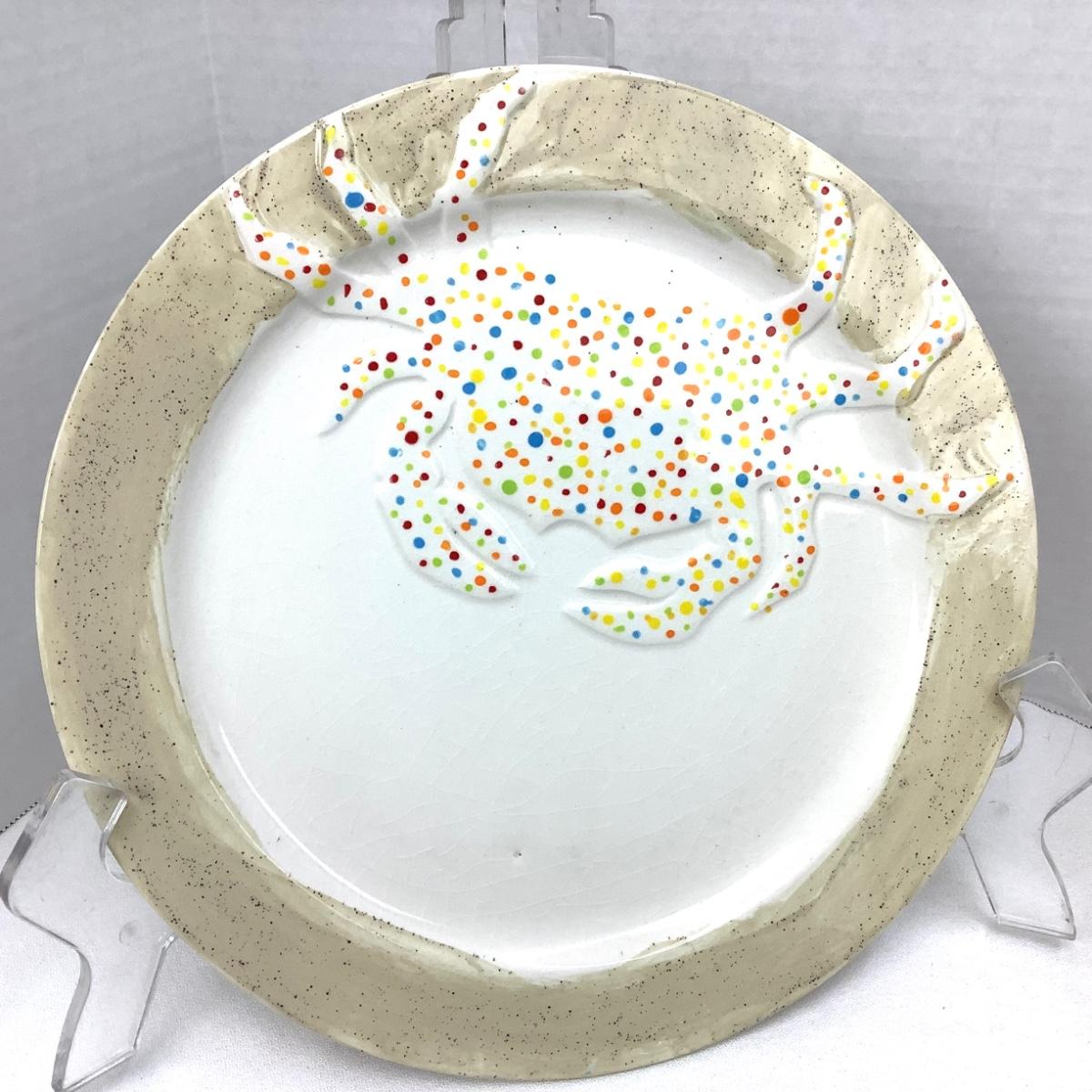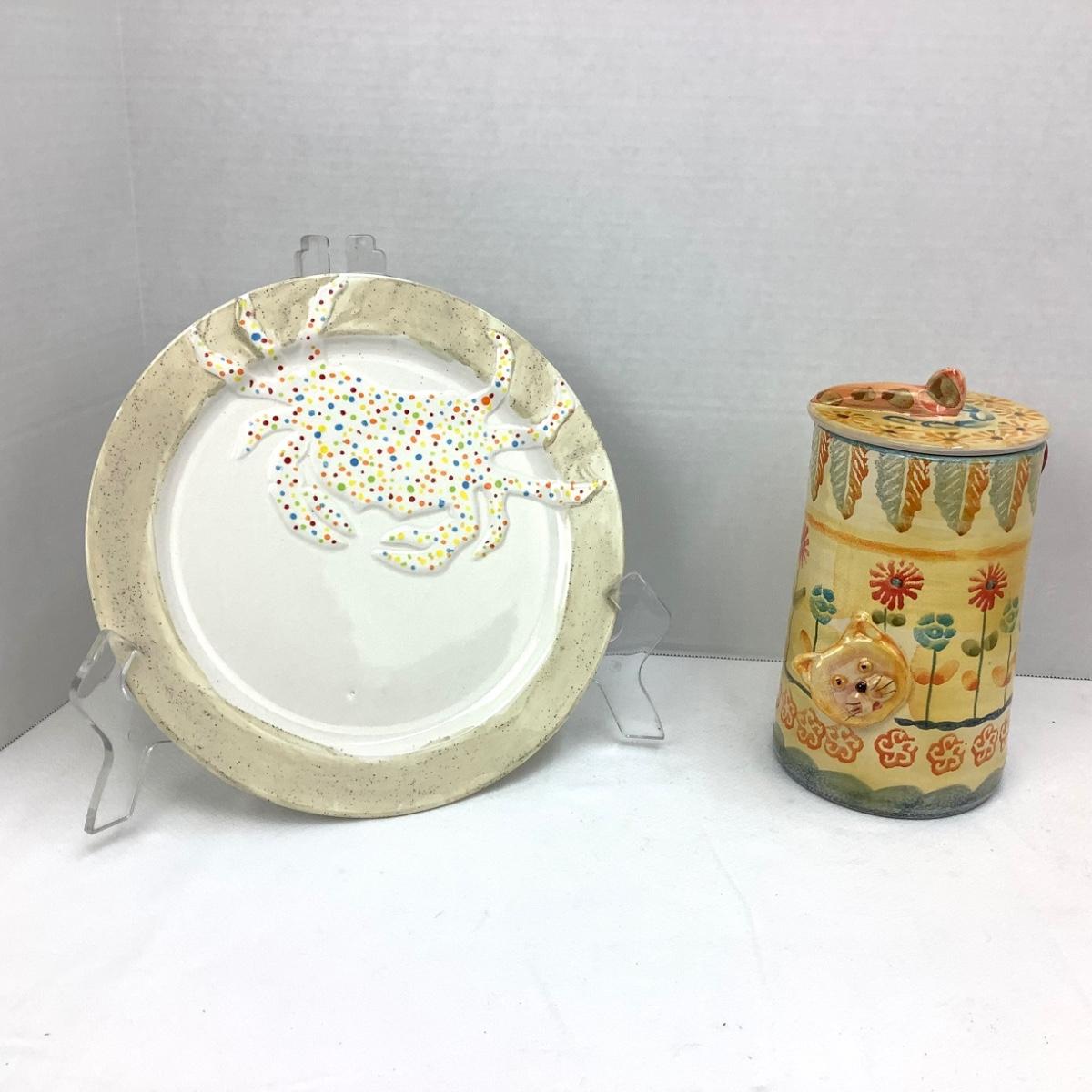The pottery canister with lid is 7.5" tall and 4" in diameter and artisan signed and made in Italy. The crab plate is hand painted and is 10" in diameter. (Crazing on the crab plate).