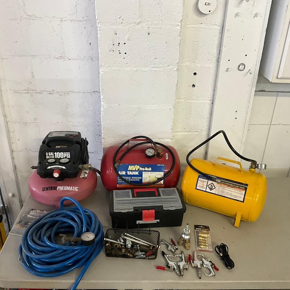 944 Central Pneumatic Three Gallon AIr Compressor With Air Tanks And Hose