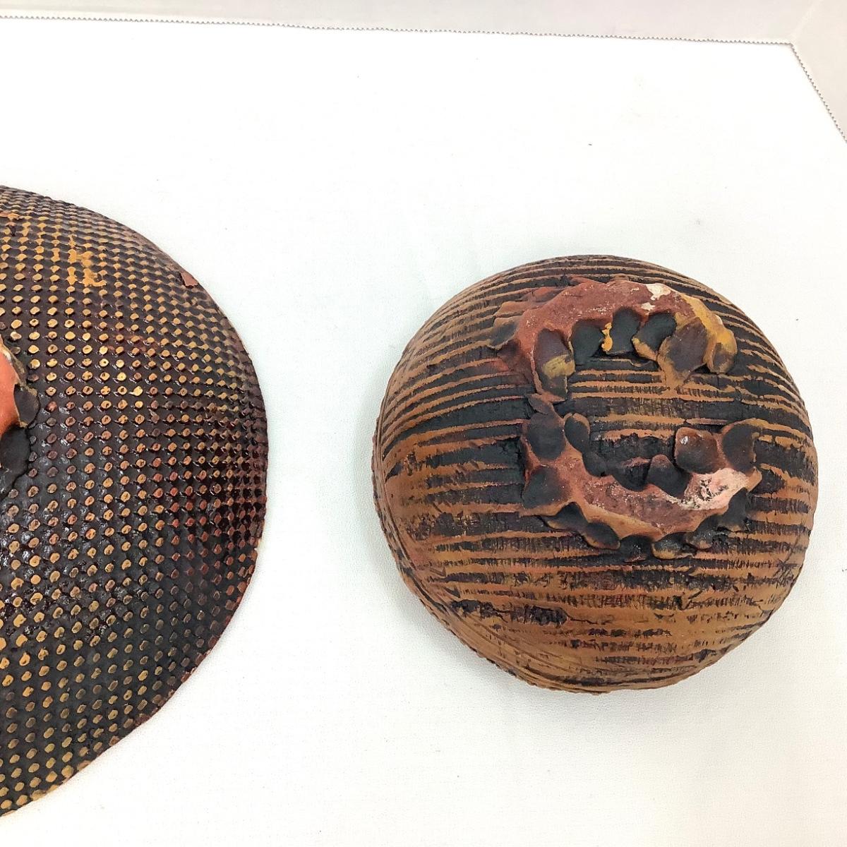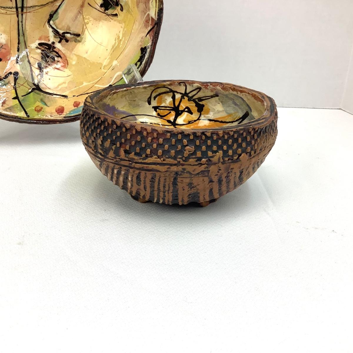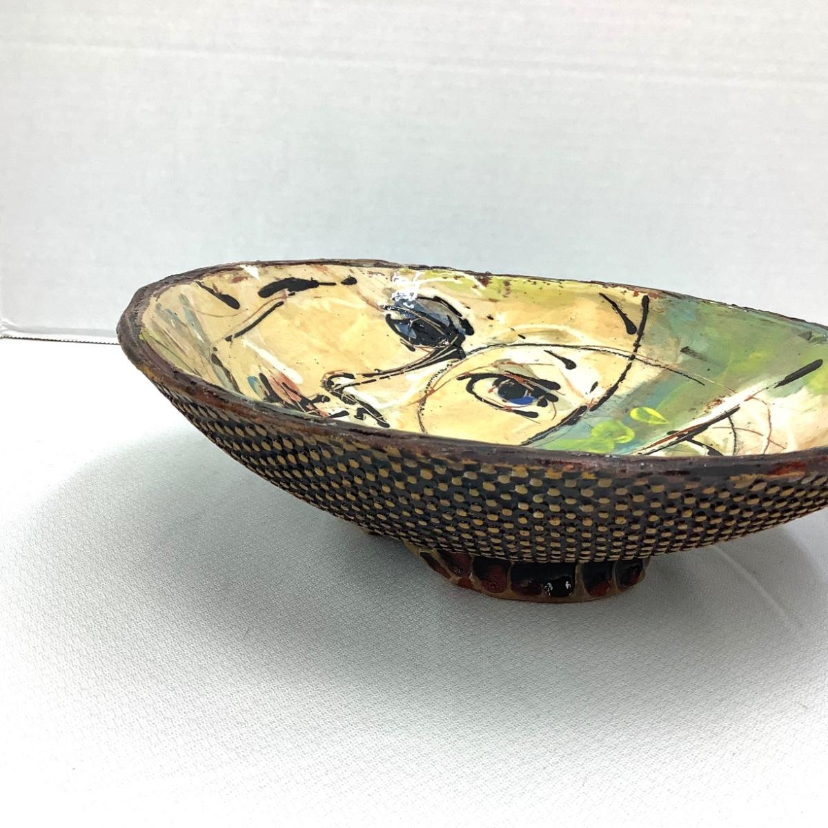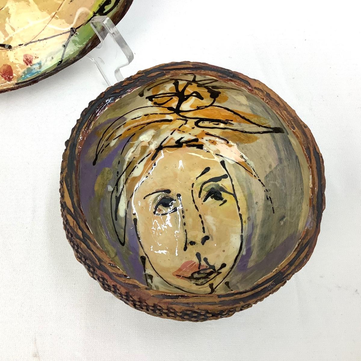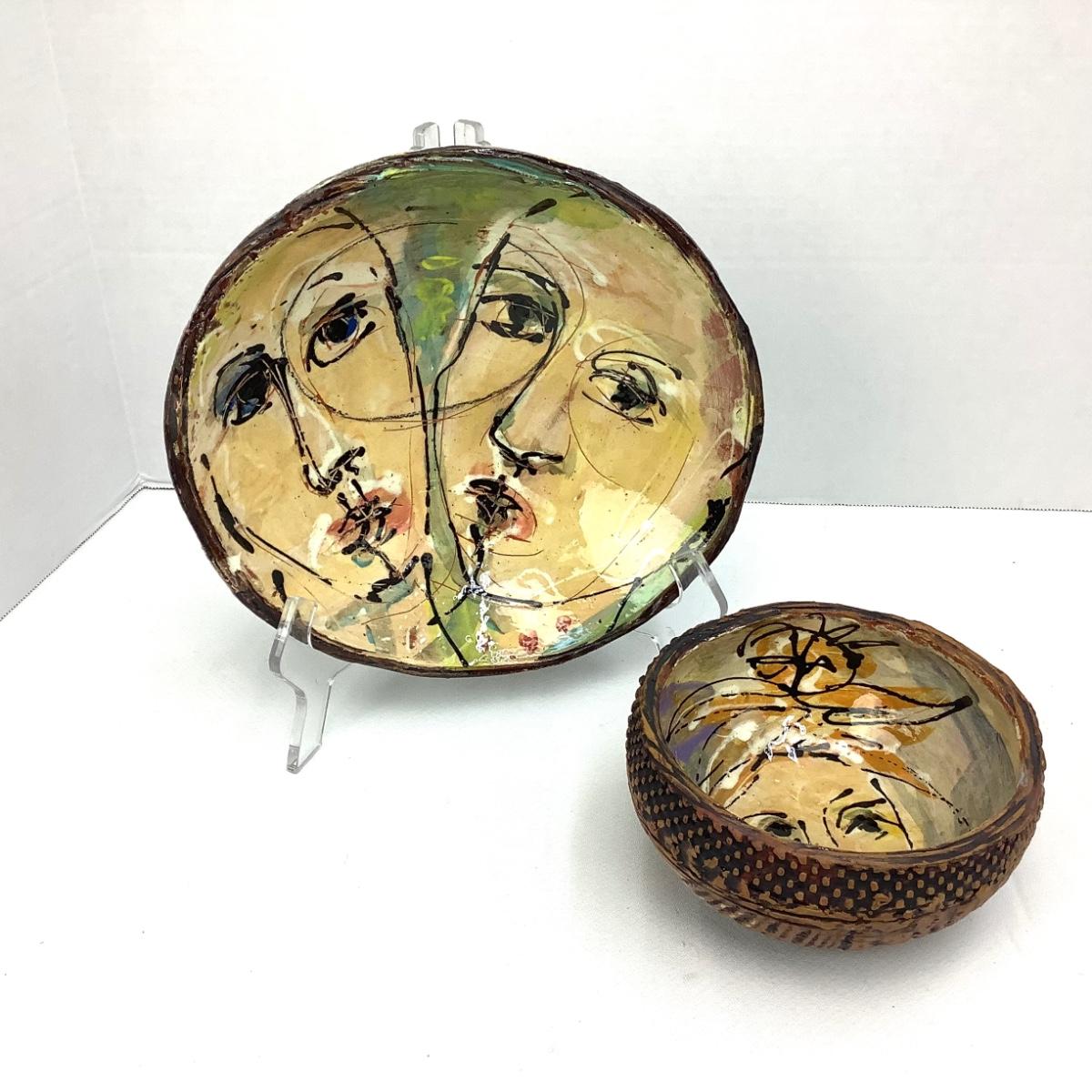 There are 2 bowls in this lot, both with faces on them, glazed and signed. The larger is 10" in diameter and 3" tall, the smaller is 6" in diameter and 3.25" tall.