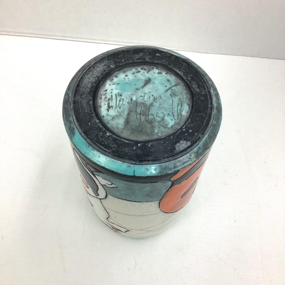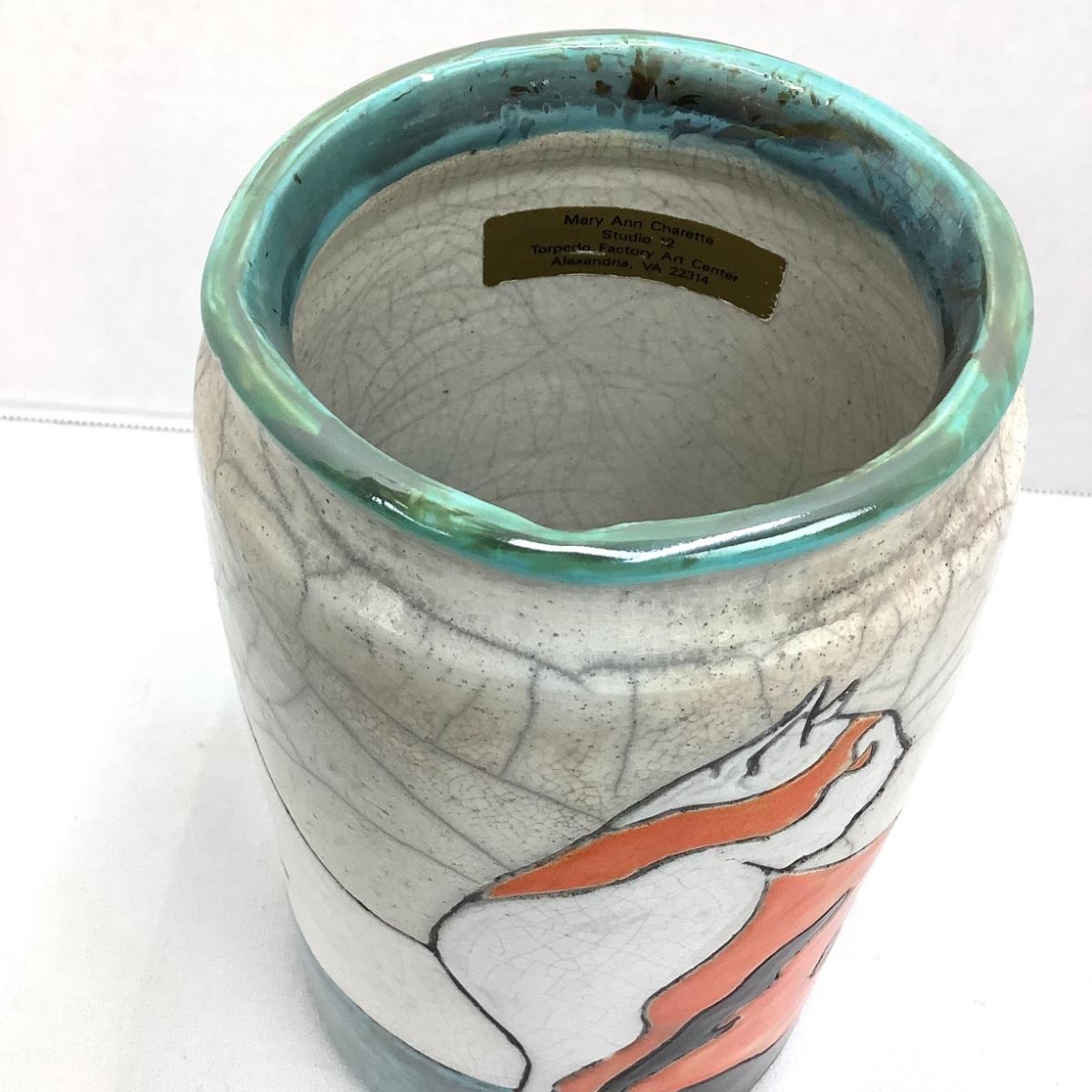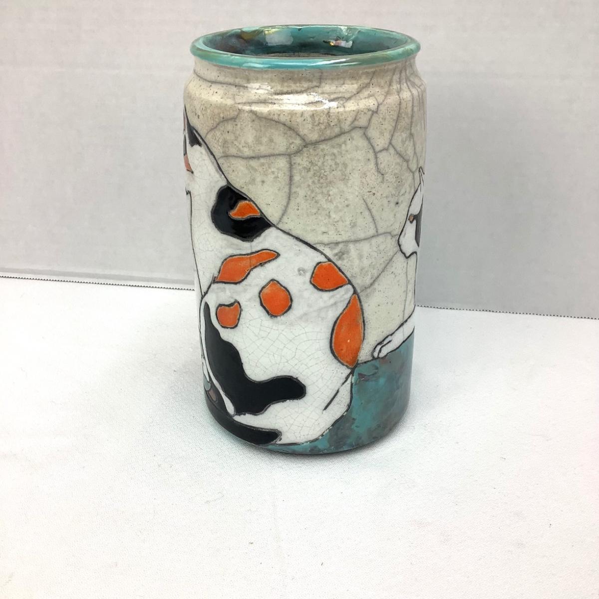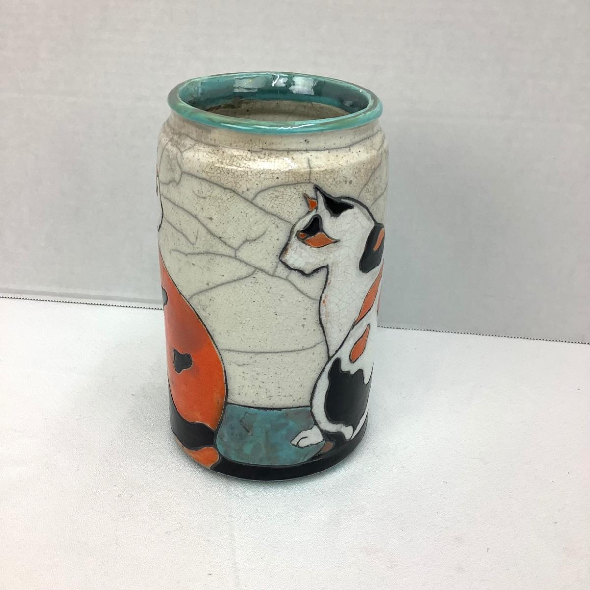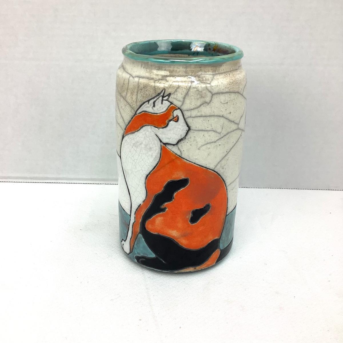 The cat vase is artisan made by Mary Ann Charette and measures 7.5" tall and 3.75" in diameter. The artist is from Alexandria, Virginia.