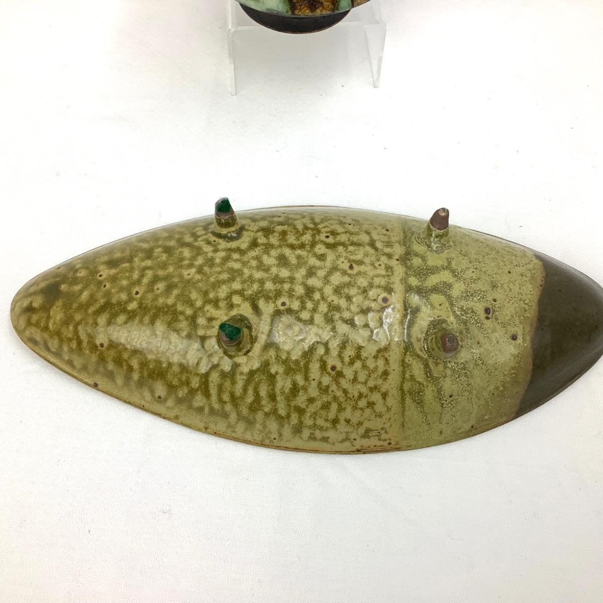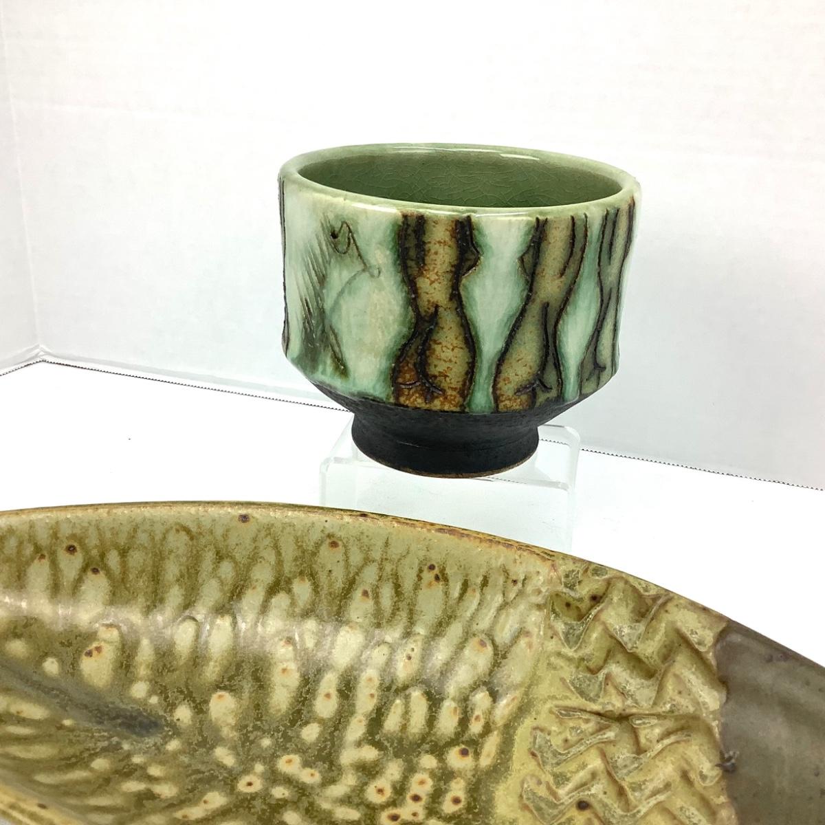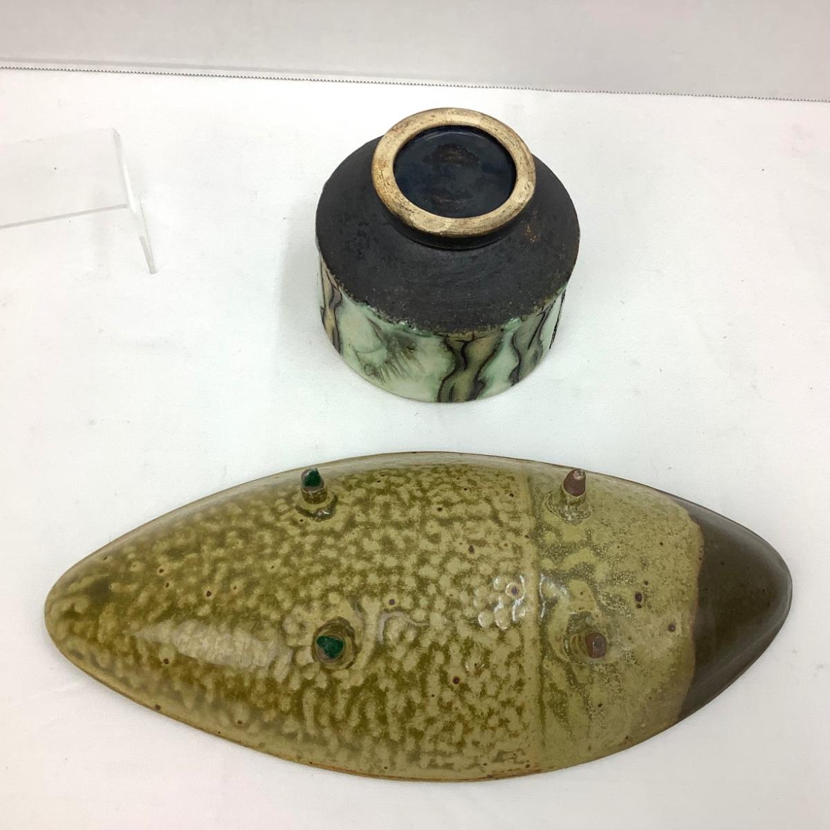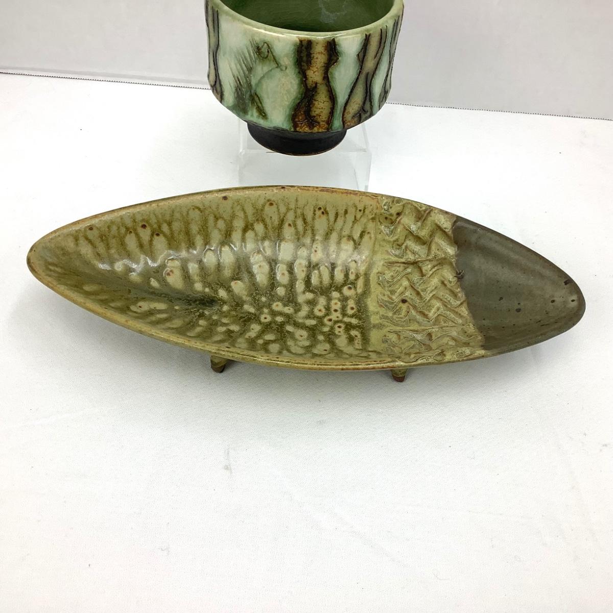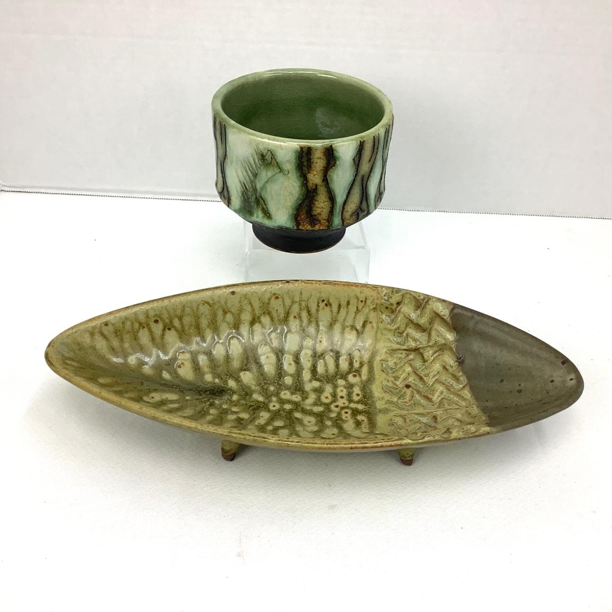 The lot contains an oval bowl/tray with ball feet and measures 13" x 6" x 2". The pedestal bowl is artisan made with nude figural design measures 4" tall and 5" in diameter.