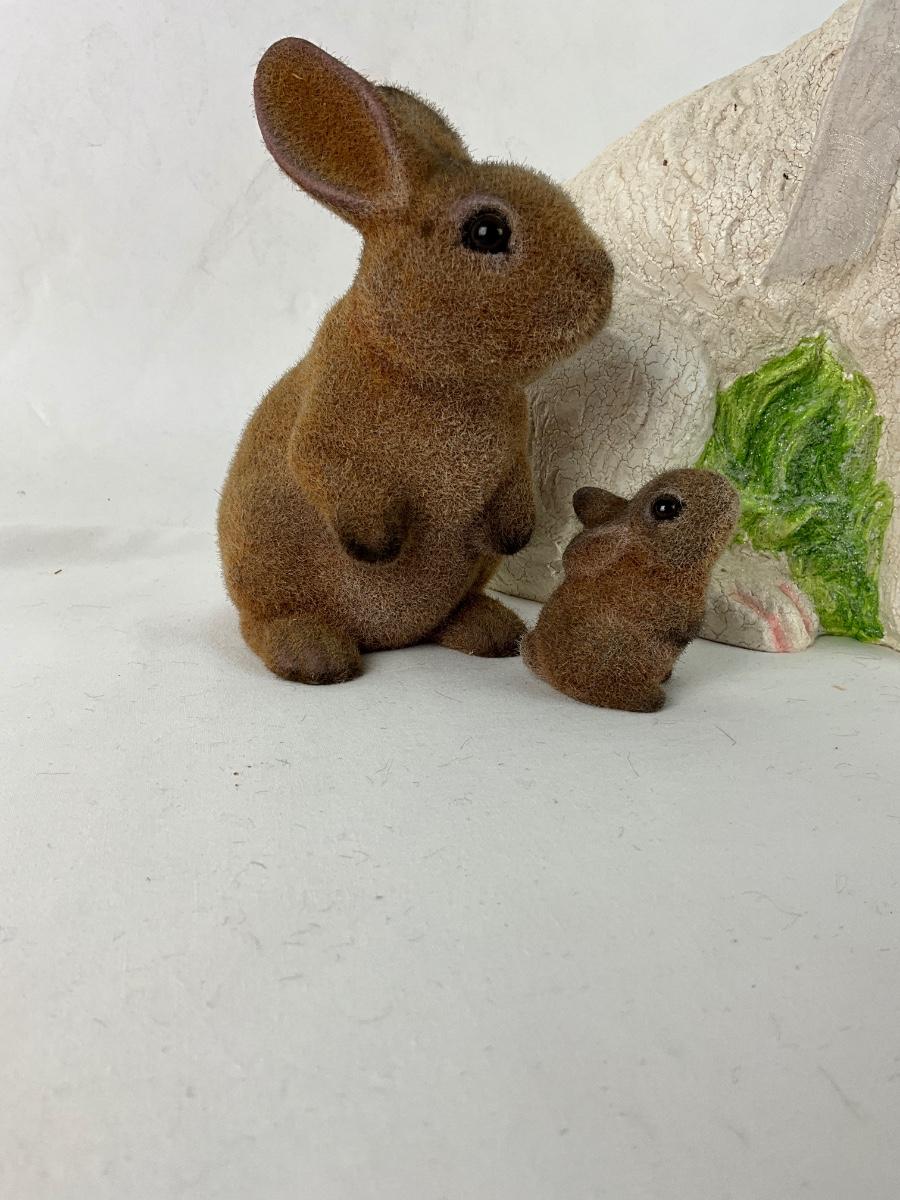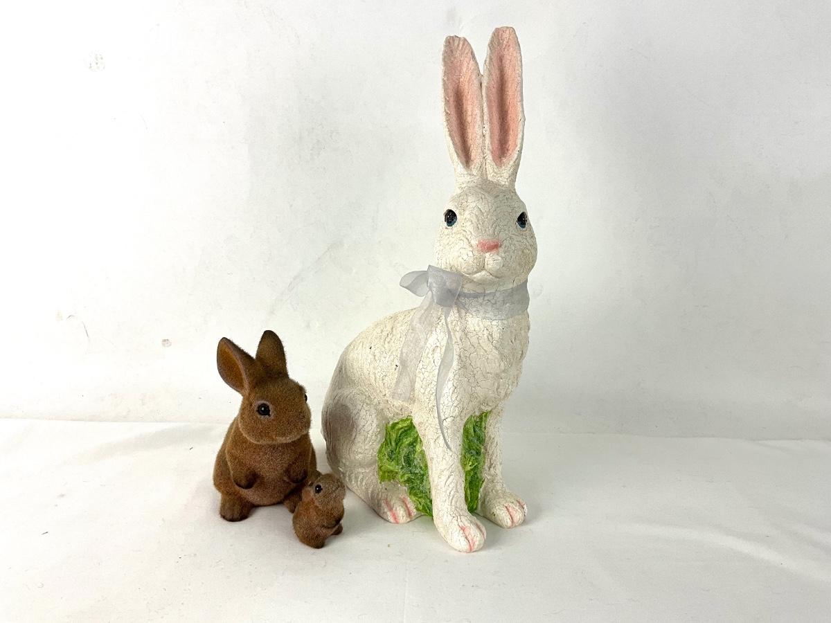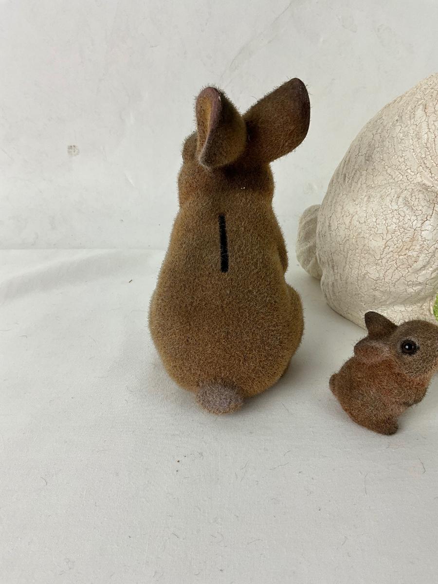 The lot contains a vintage flocked brown bunny bank and its baby bunny and a large white decorative bunny. The bank is 6" tall, the baby is 2" tall and the white rabbit is 17"h x 9"w.