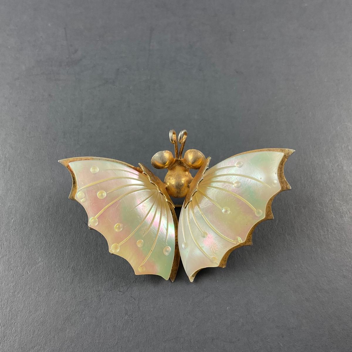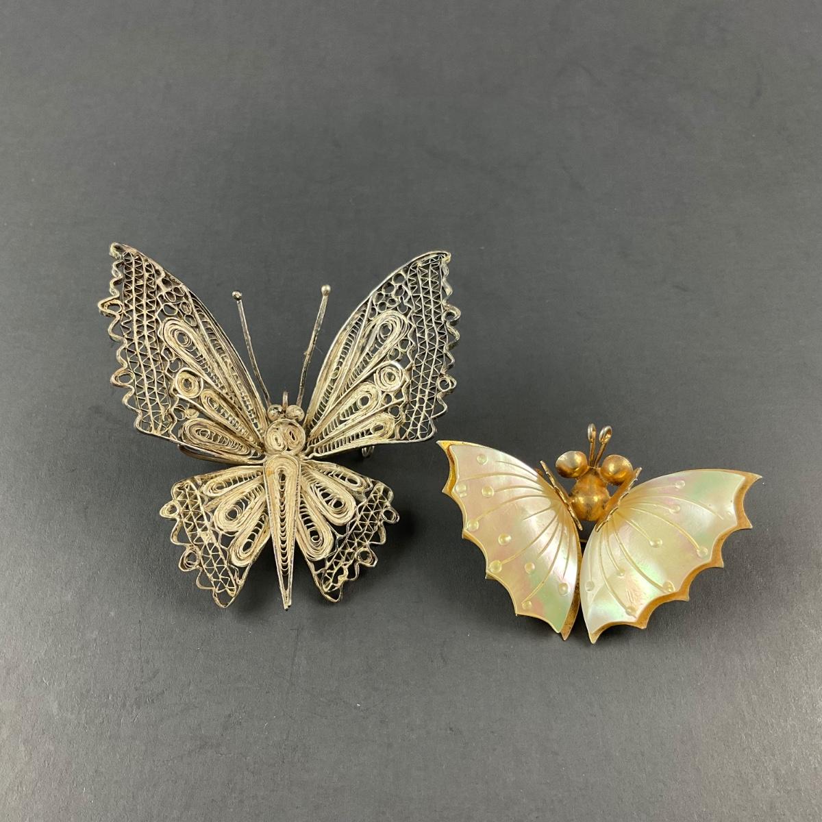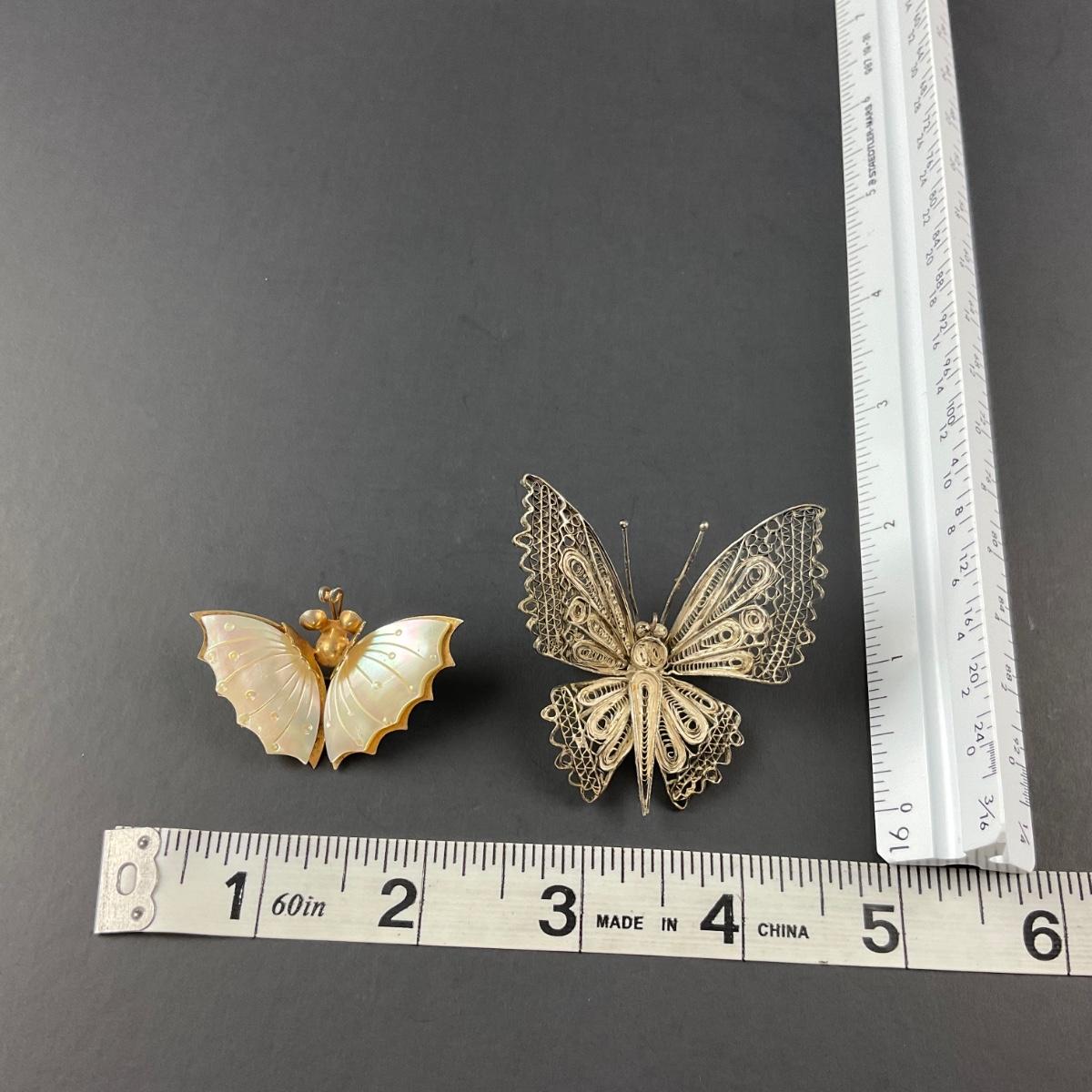 Two vintage butterfly pins, one is marked 925 the other is not marked but has mother of pearl like accents on it. Please see photos for details and condition. Any condition statement is given as a courtesy to a client, is an opinion, and should not be treated as a statement of fact. Reference to condition written, oral or within a condition report shall not be regarded as a full account of condition and may not include all defects, alterations, or restorations. Absence of a condition report does not imply a lot is flawless or lacking imperfections or damage. Katherine’s Auction & Appraisal Service shall have no responsibility for any error or omission. Returns shall not be accepted on the basis of condition. ::: Shipping is available on this lot. If you require shipping you must let us know at the close of the auction. We will coordinate with you after the item has been won. Shipping fees will include insurance up to or exceeding the value of all items being mailed. If you have any questions regarding this lot please contact the auctioneer either via this website, by direct email or by phone. PICK UP TIMES and other important information can be found in the TERMS and DESCRIPTION of the auction. Please take a look for pertinent information. Thanks!