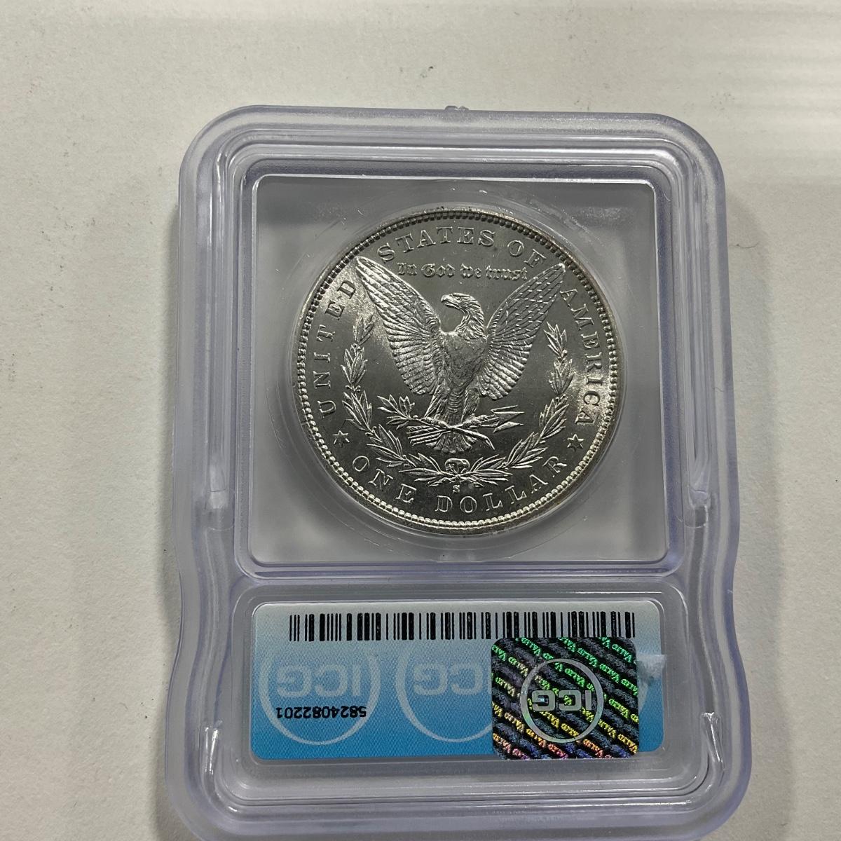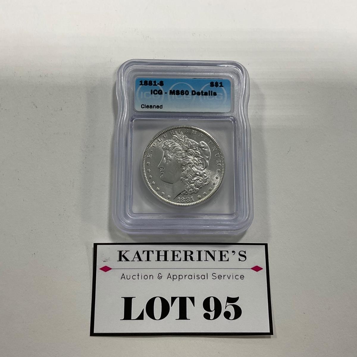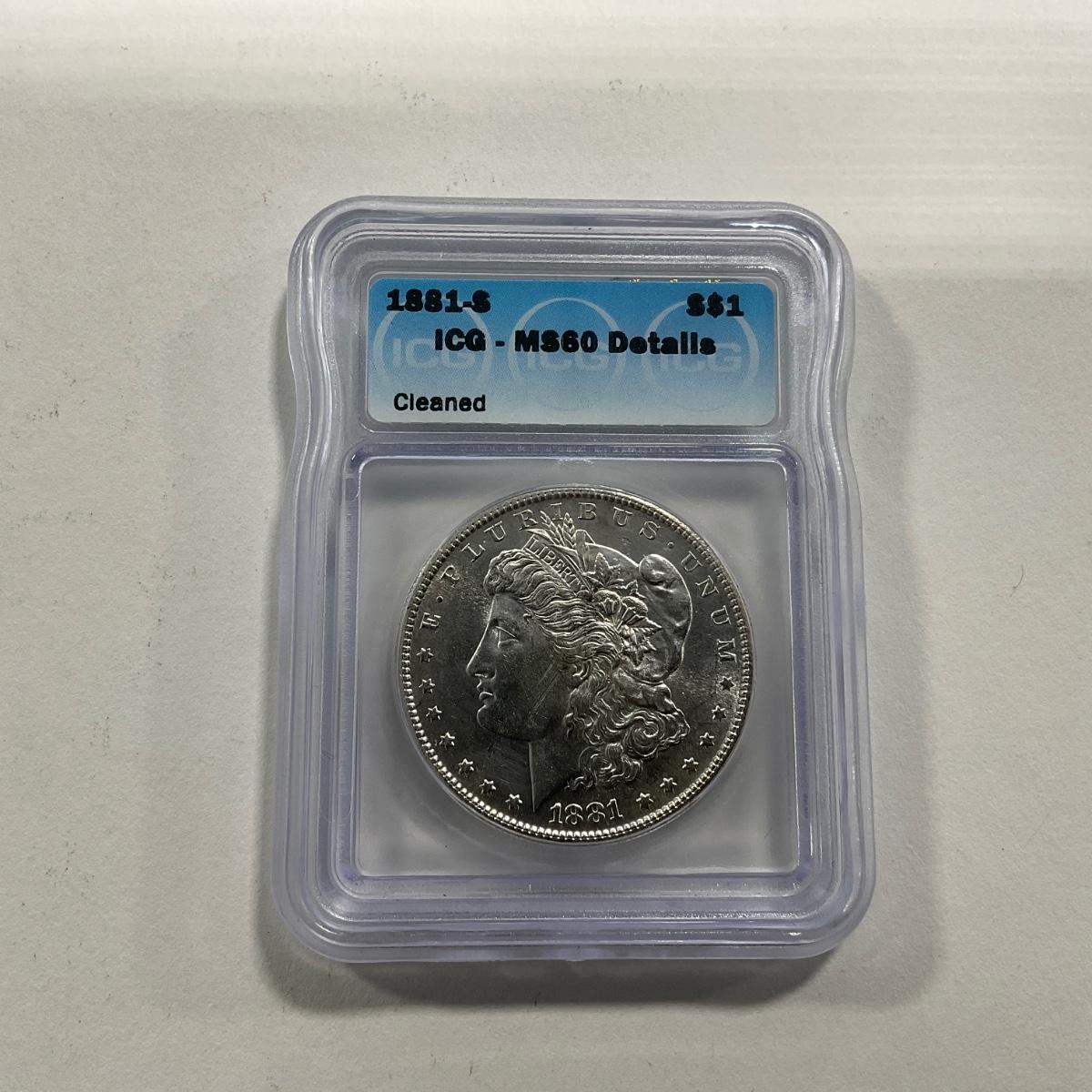 One graded 1881-S Morgan ICG MS60 coin. Please see photos for details and condition. ::: Shipping is available on this lot. If you require shipping you must let us know at the close of the auction. We will coordinate with you after the item has been won. Shipping fees will include insurance up to or exceeding the value of all items being mailed. If you have any questions regarding this lot please contact the auctioneer either via this website, by direct email or by phone. PICK UP TIMES and other important information can be found in the TERMS and DESCRIPTION of the auction. Please take a look for pertinent information. Thanks!