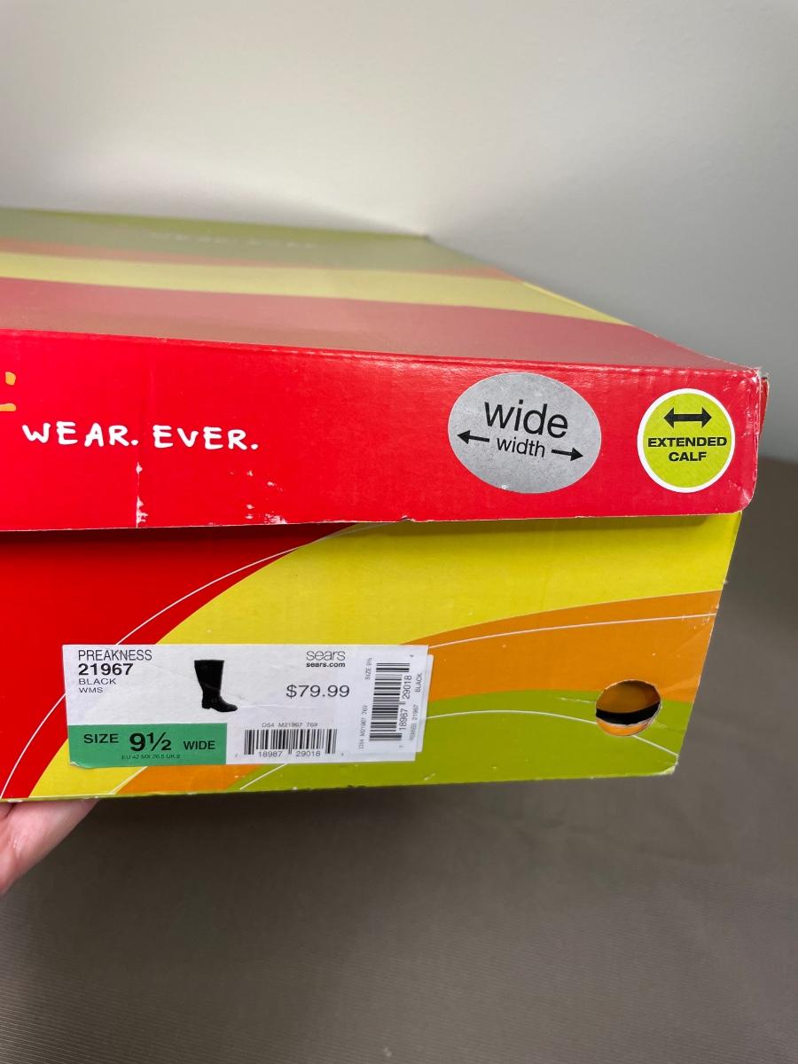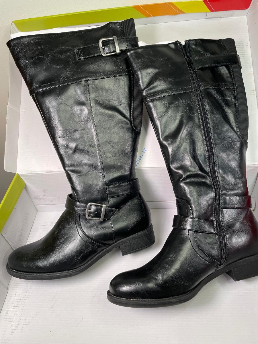 New black Wear Ever brand 9.5 wide boots have stretch inset to fit larger calves.