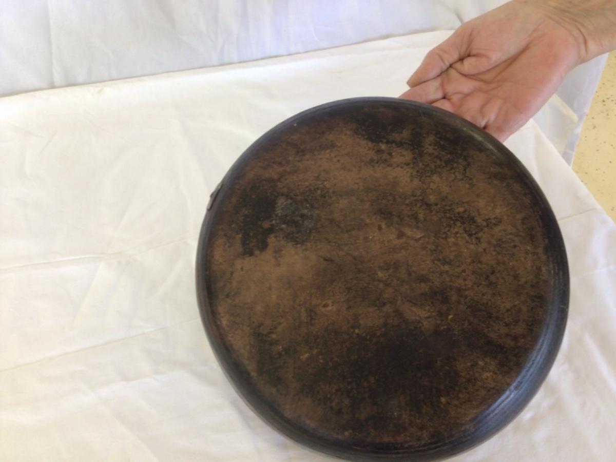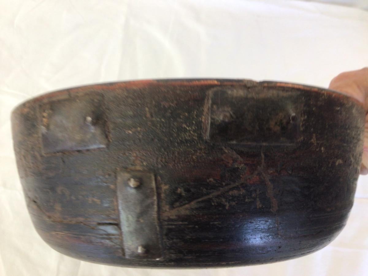 Early Wooden Bowl, has unique old repair. Size: 9.75”Diameter/3.5”H