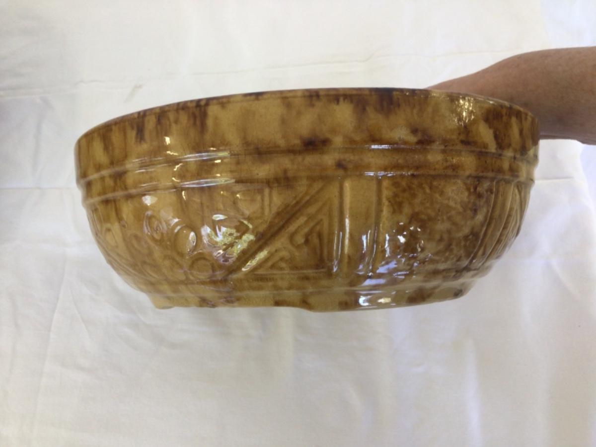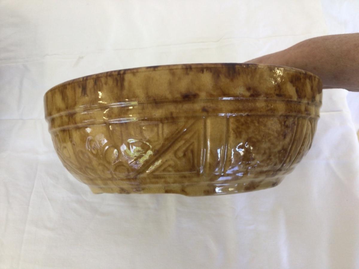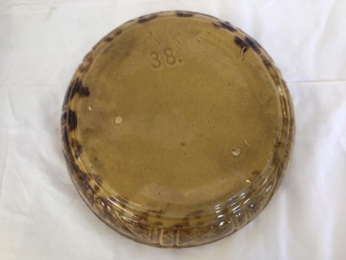 Yelloware-Has embossed design. #38 on bottom-size 8” Diameter/3”H