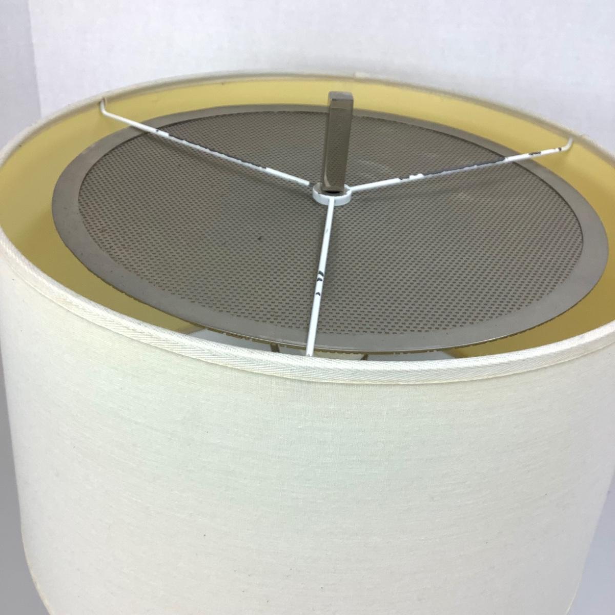 The lamp is adjustable by the turn of a handle it can be 26"-38" tall. The shade is 13.5" in diameter, there is wear on the top of the shade. Pull chain one lightbulb.
