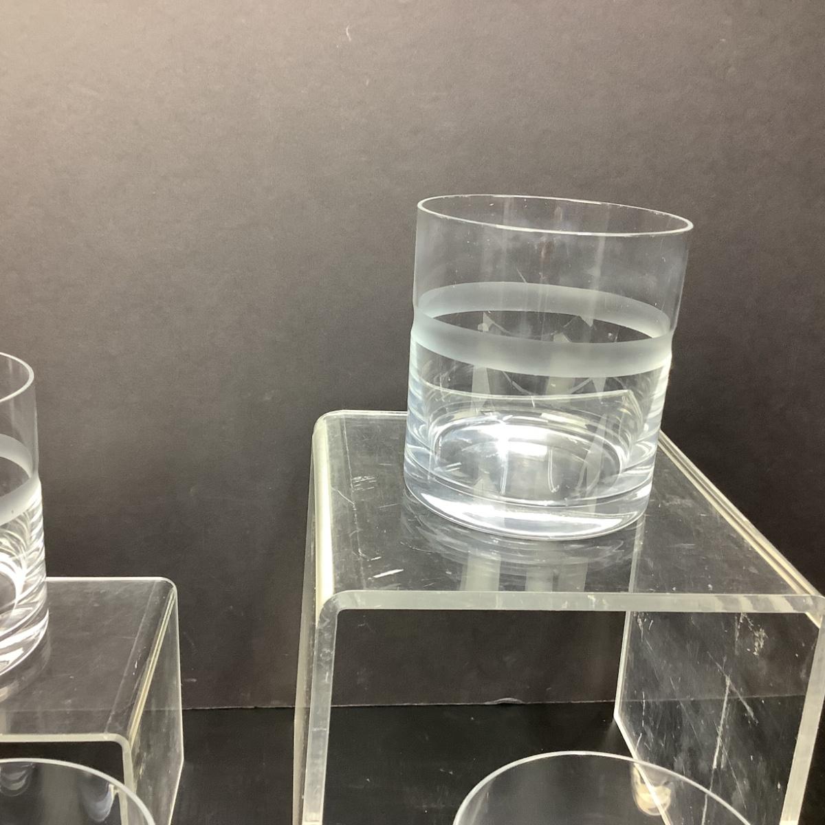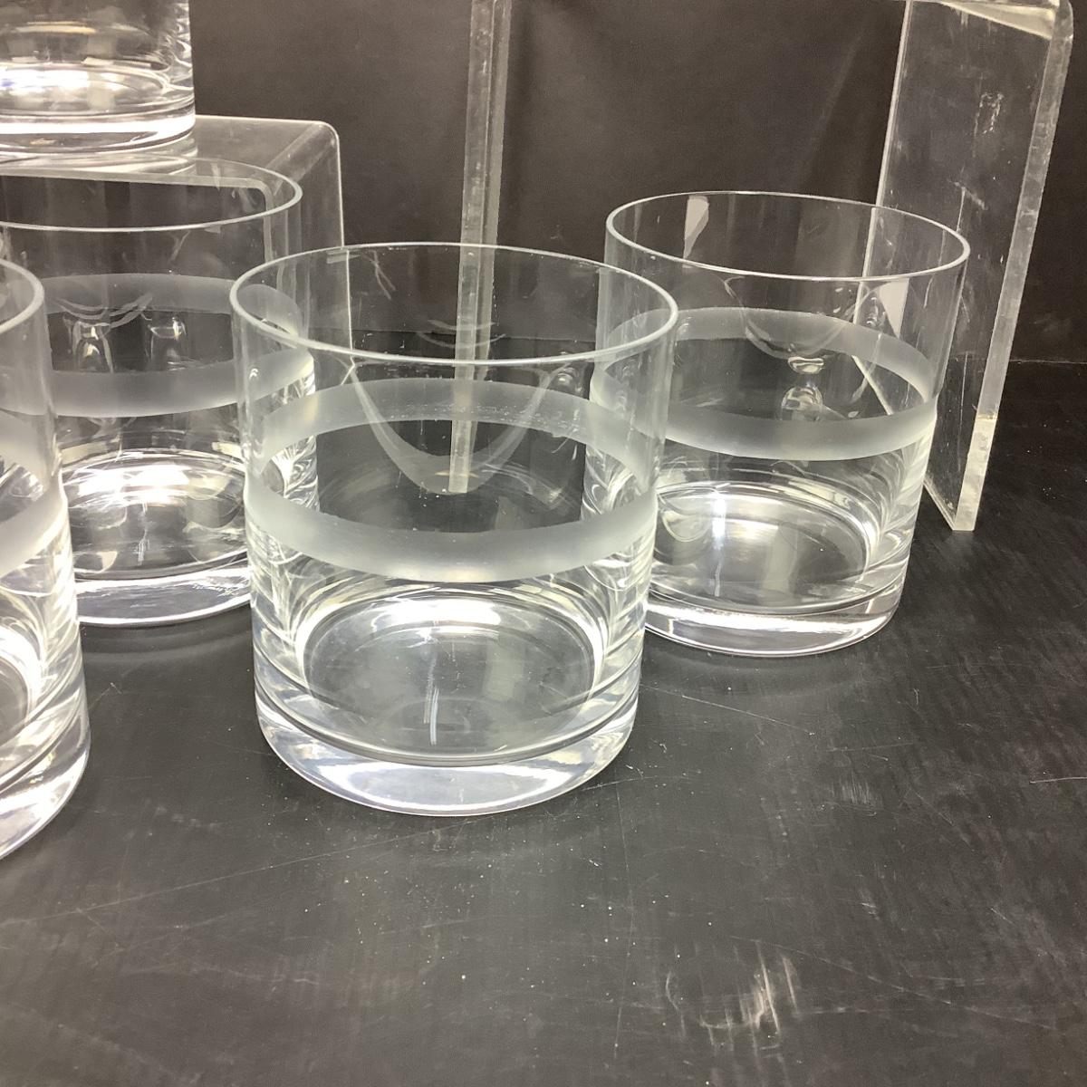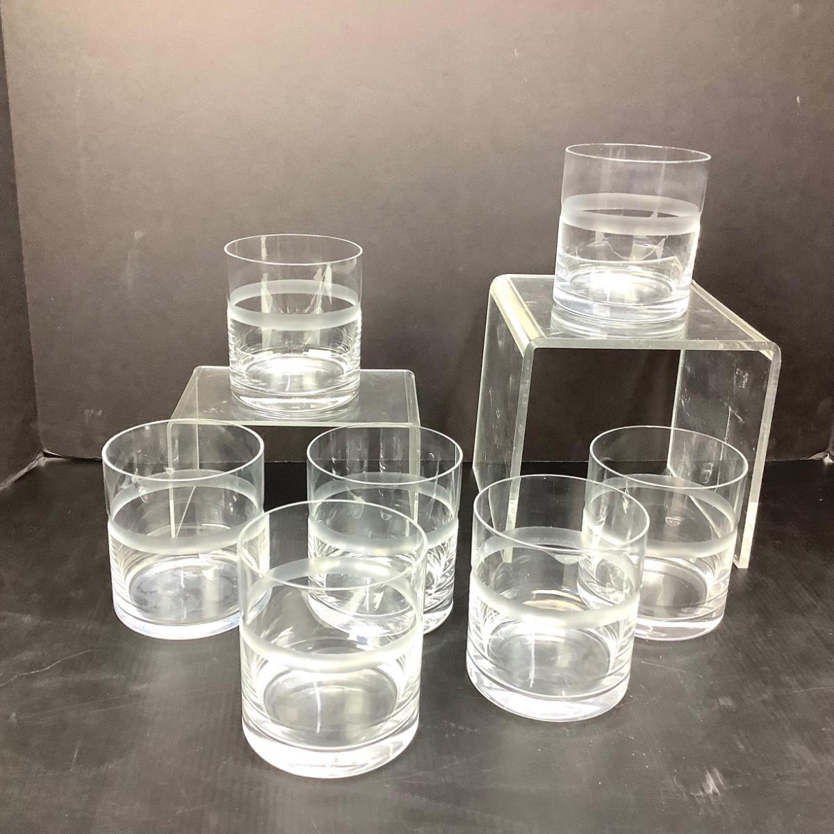 There are 7 glasses in the lot, they measure 4" x 3.5". They are glass with frosted band, they are clean, clear and there are no signs of wear or damage.