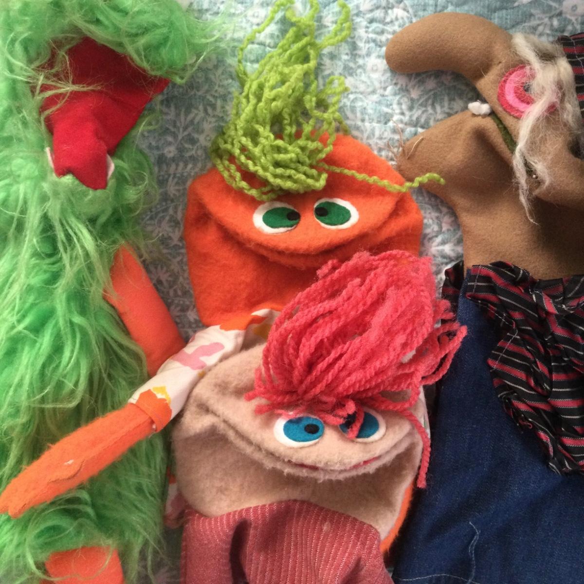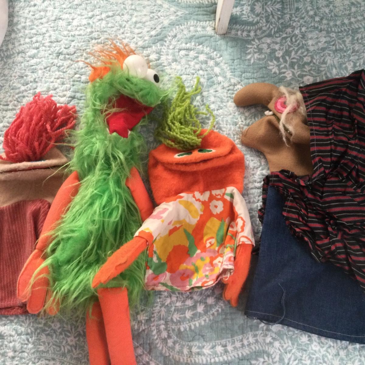There are 3 puppets and one stuffed animal in this lot.