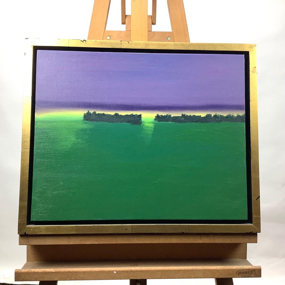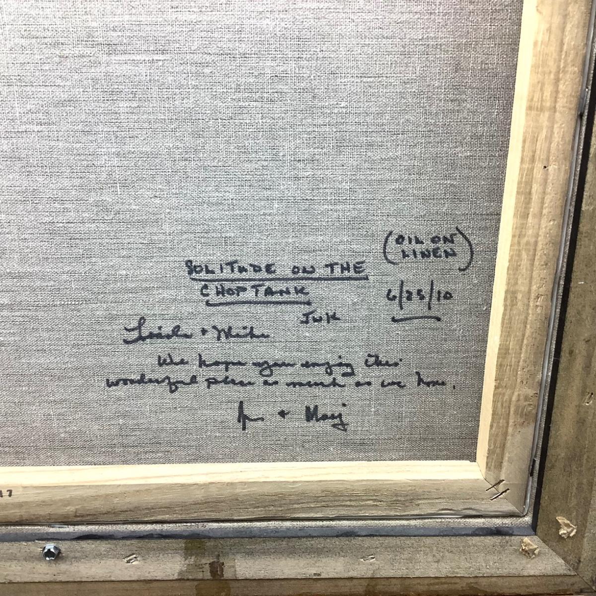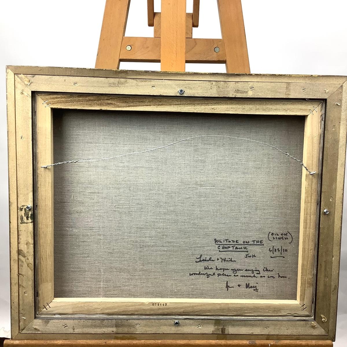 The linen canvas is set into a gold shadow box frame, measures 22.25" wide x 18.25" high. It is dated 6/25/2010. It is an oil on linen. Jim Krahn local resident painter in Easton, Maryland. Artist inspired by the Plein Air Festivals, he has had his work showcased both domestically and internationally..