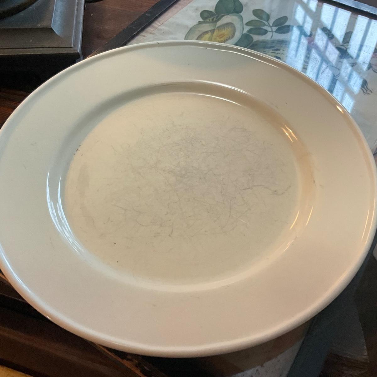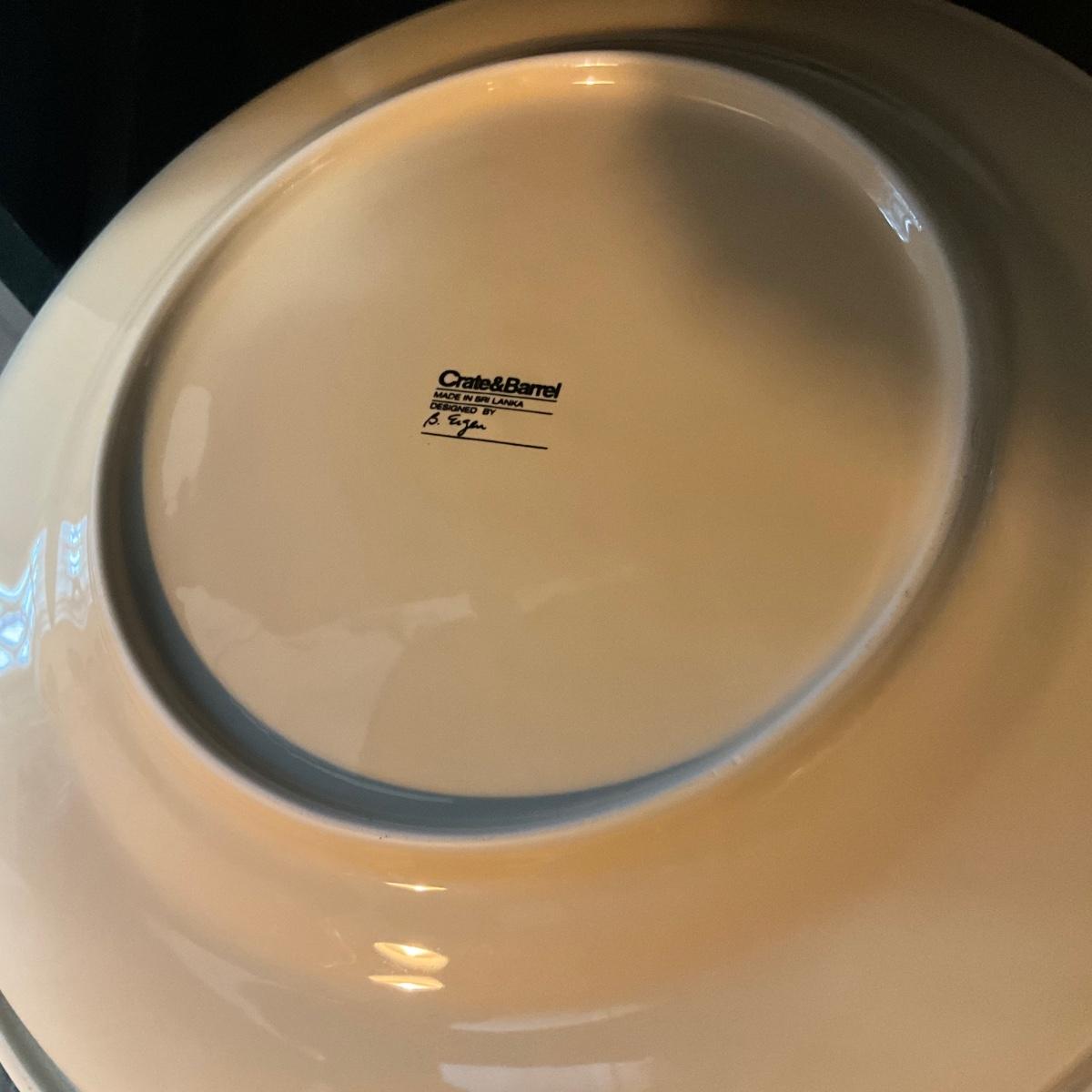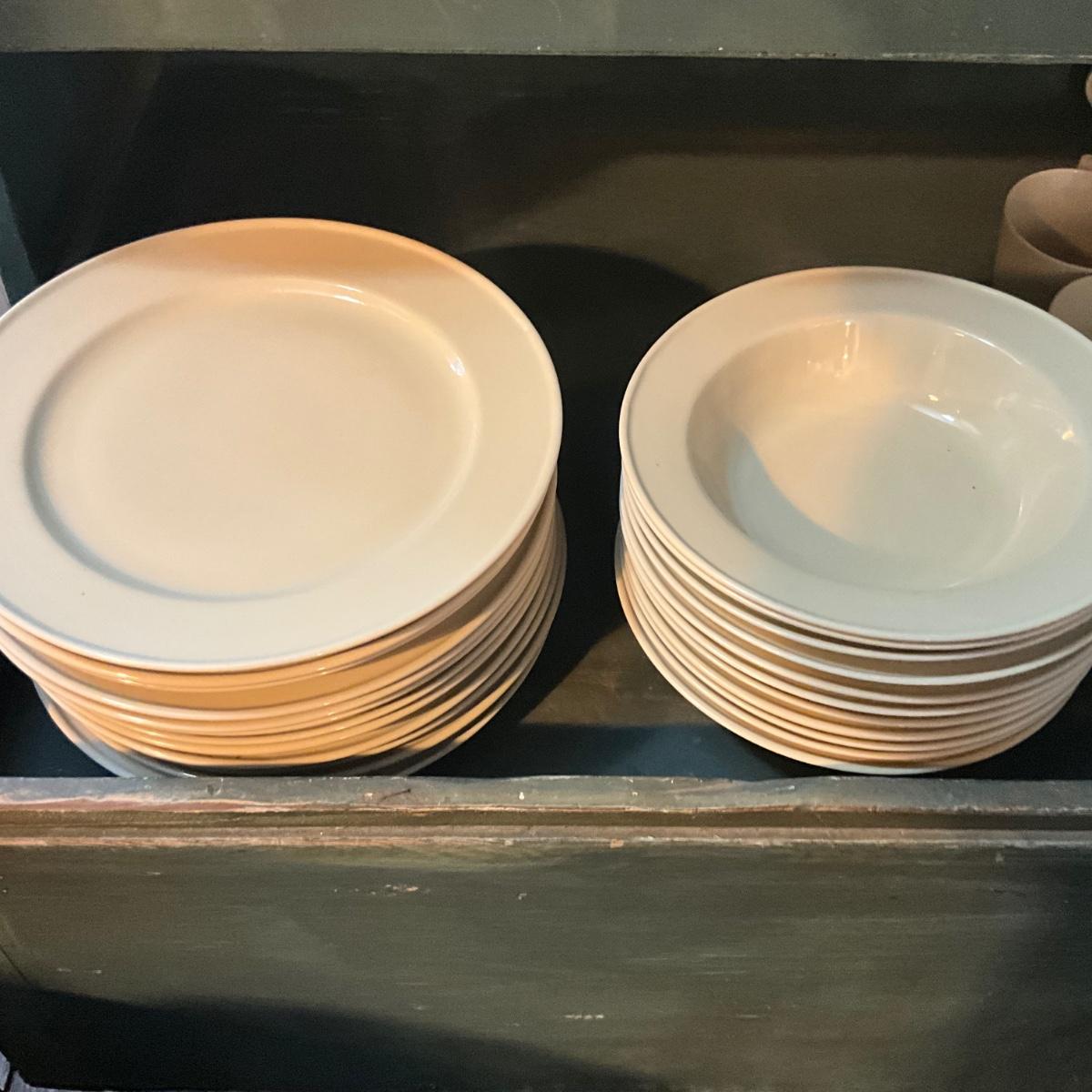 11 rimmed soup bowl measuring 9.5" diameter , 12 Bread and butter measuring 6.5" diameter, 10 mugs , cream and sugar with oval tray, 12 dinner plates measuring 11" diameter, 3 serving bowls, 12 salad plates with signs of wear measuring 9" diameter, and large serving bowl measuring 12" diameter x 4" high