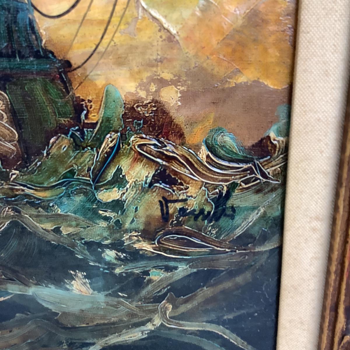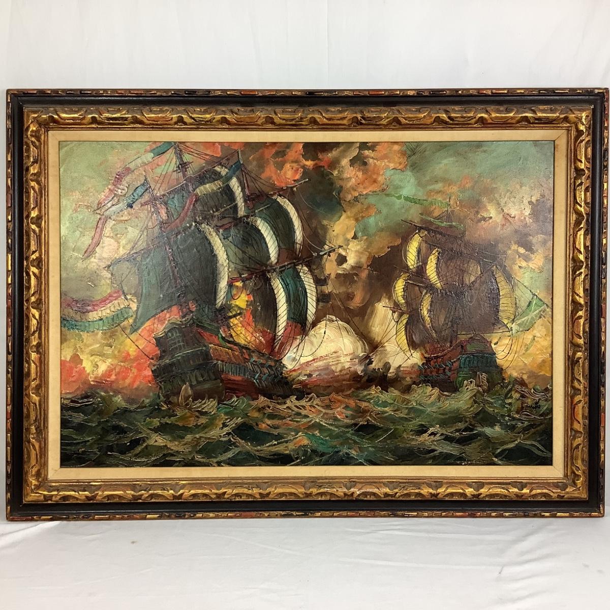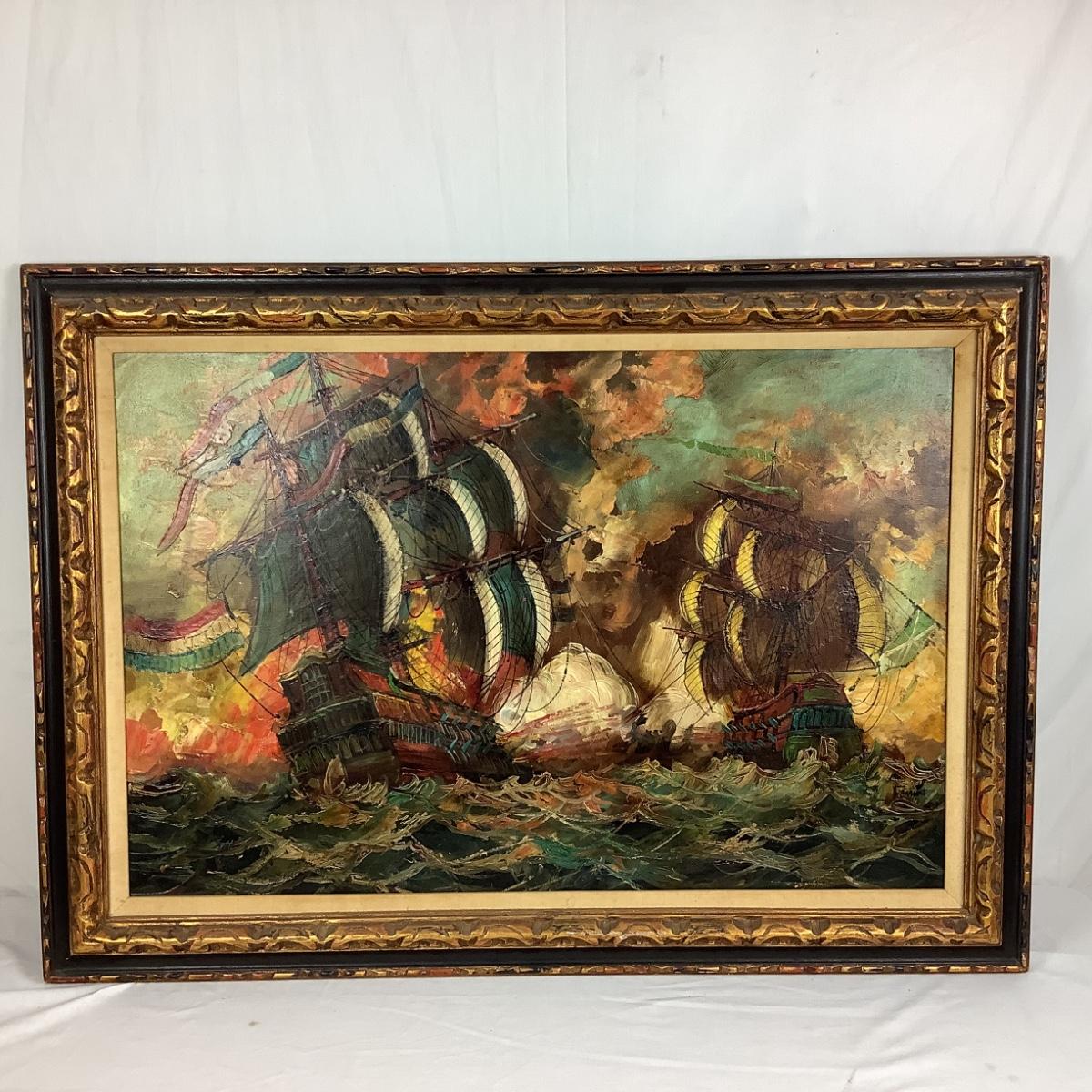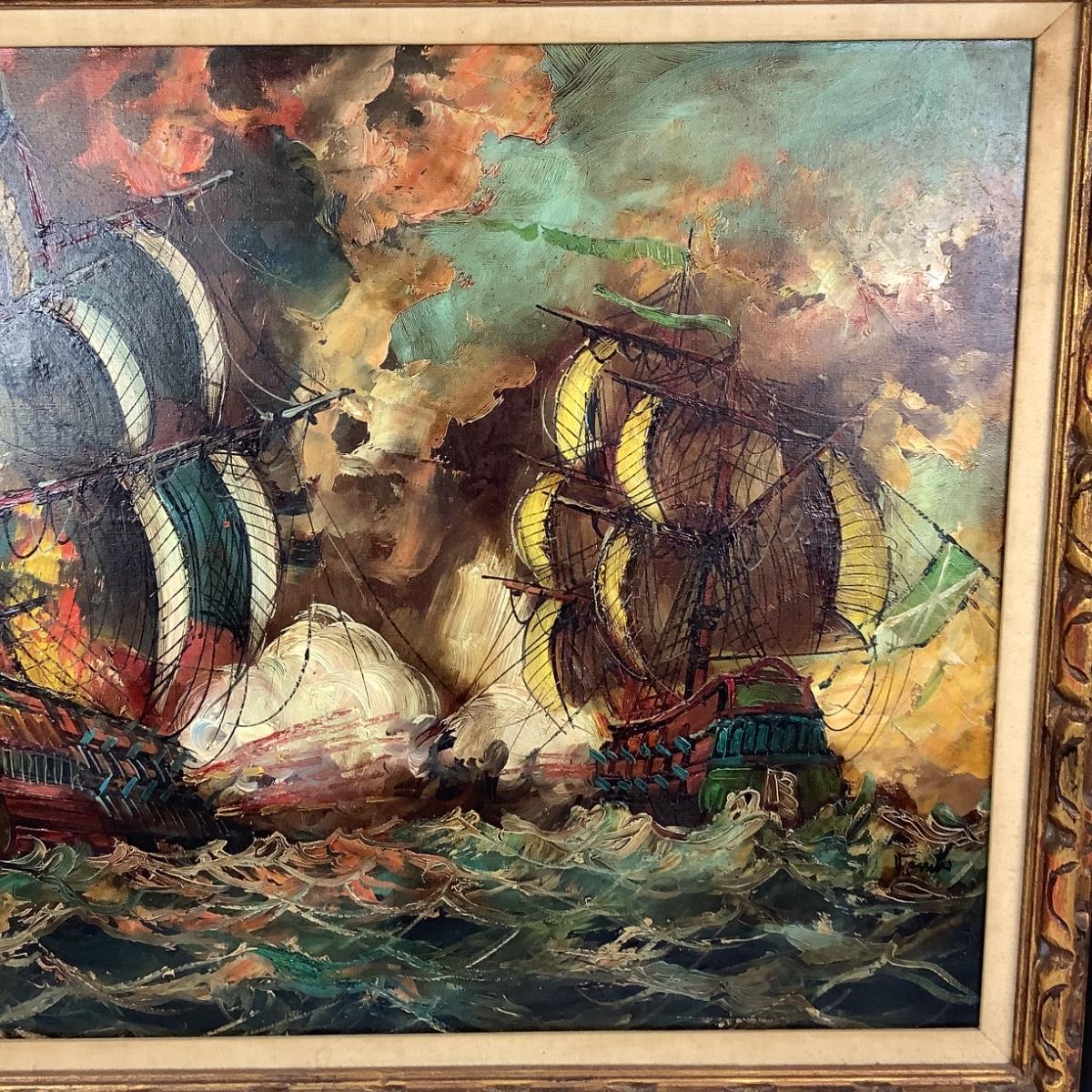 957 Mid Century Original Oil on Canvas "Battle at Sea" by Vesselli