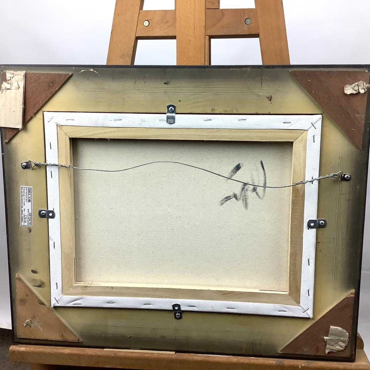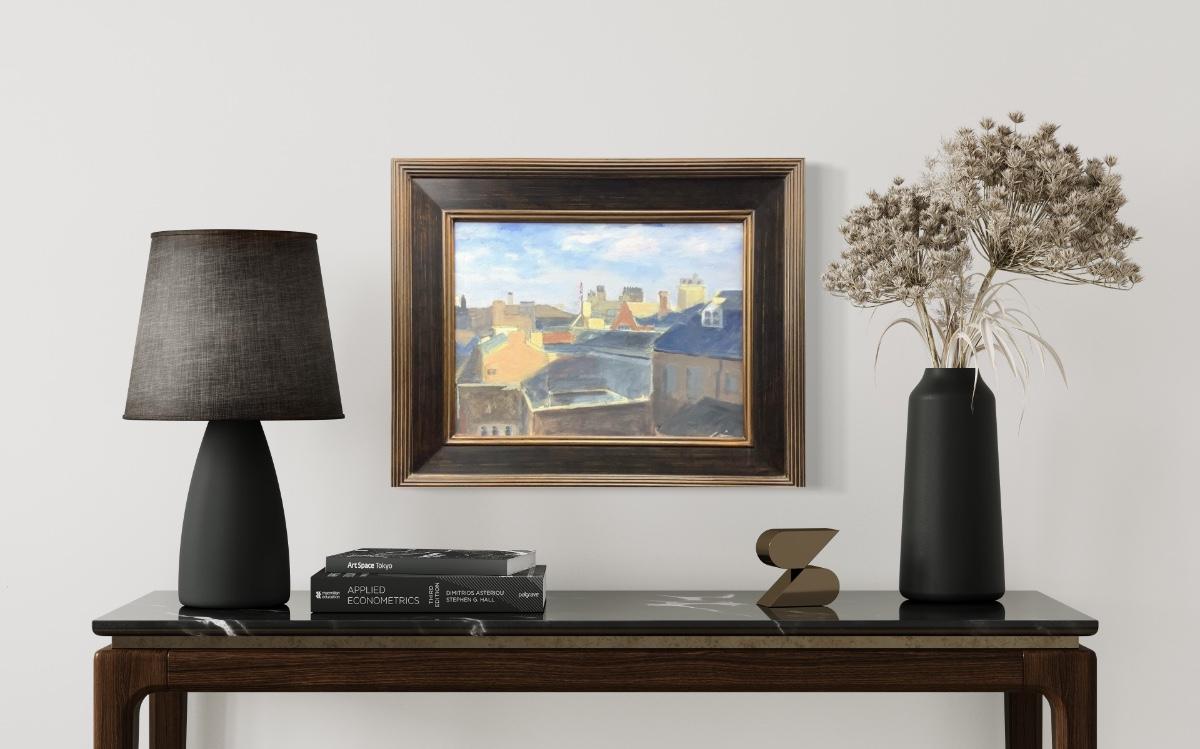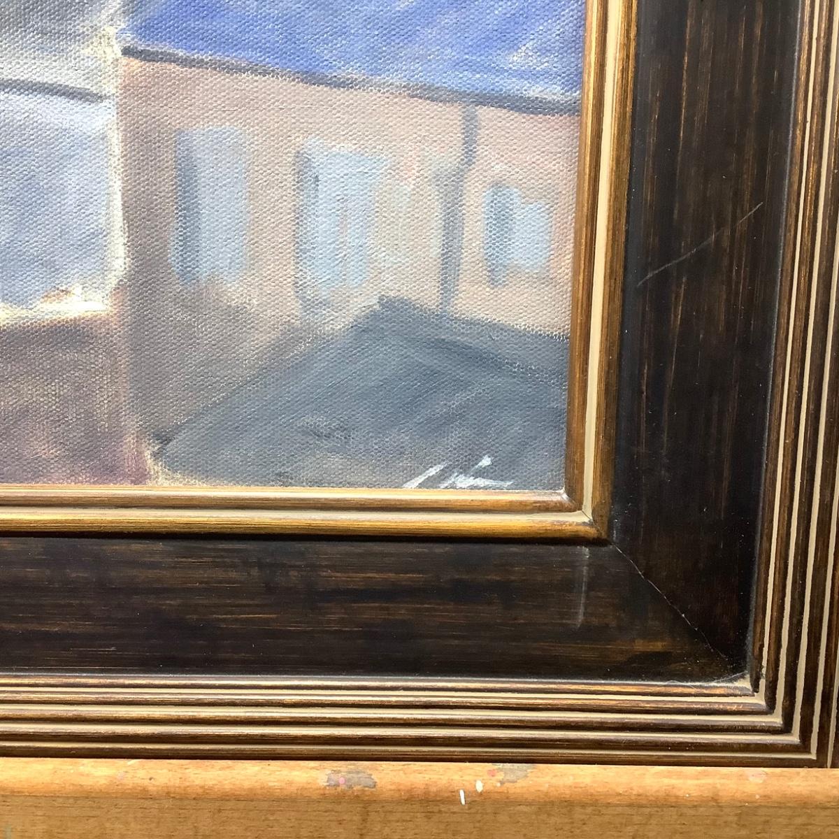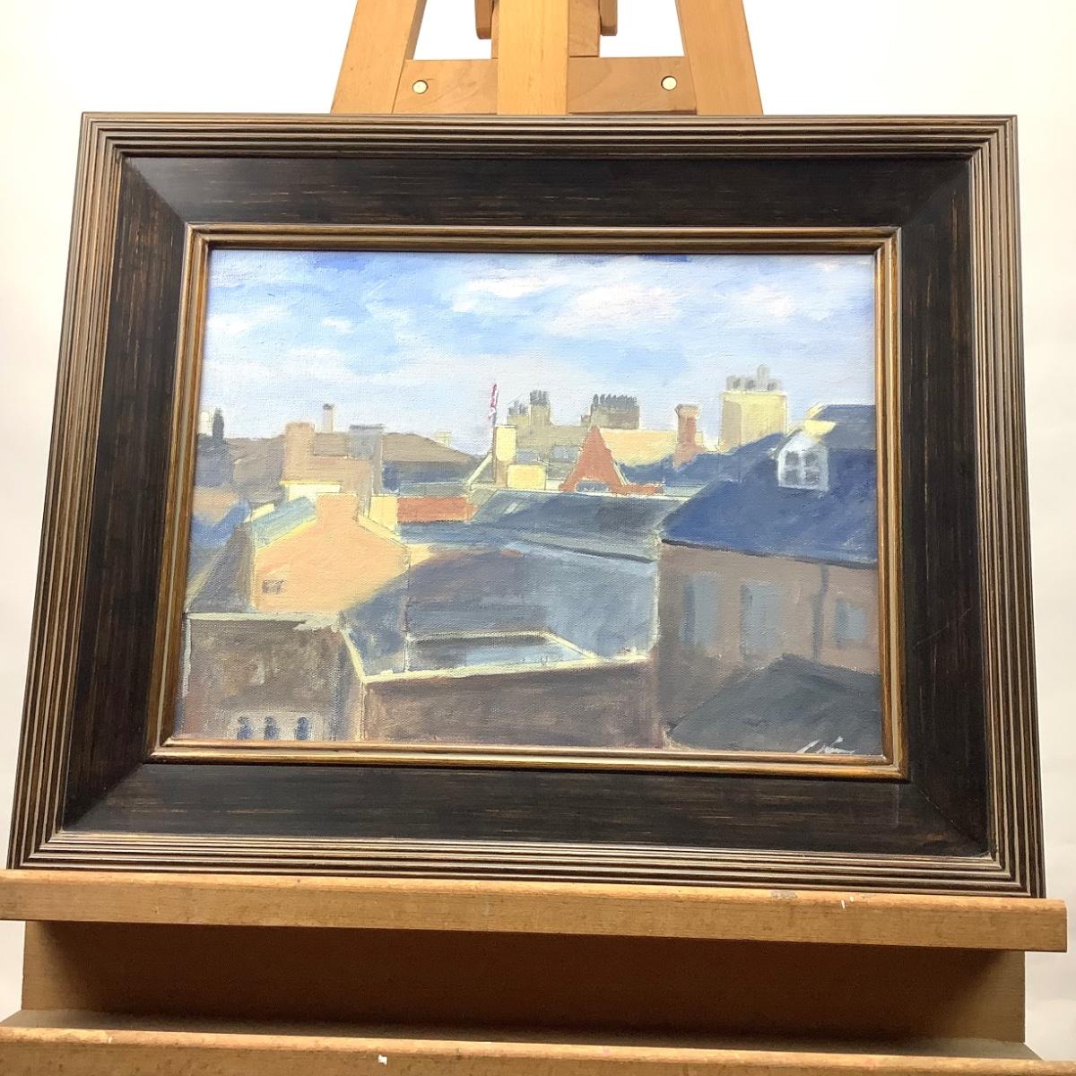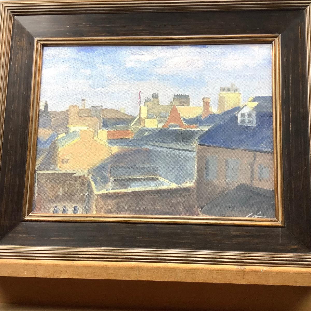 The painting measures 21.5" wide x 17.5" high, painting of rooftop view in England. It is acrylic on stretched canvas and framed. It is signed on the lower right hand corner. This is a one of a kind private commissioned piece. The artist David Grafton (1944-2017) was a leader in the Easton Arts scene since the opening of Grafton Galleries on Dover St. In 2004. He was a noted impressionistic landscape painter. Grafton also taught at his art gallery in Easton, md.