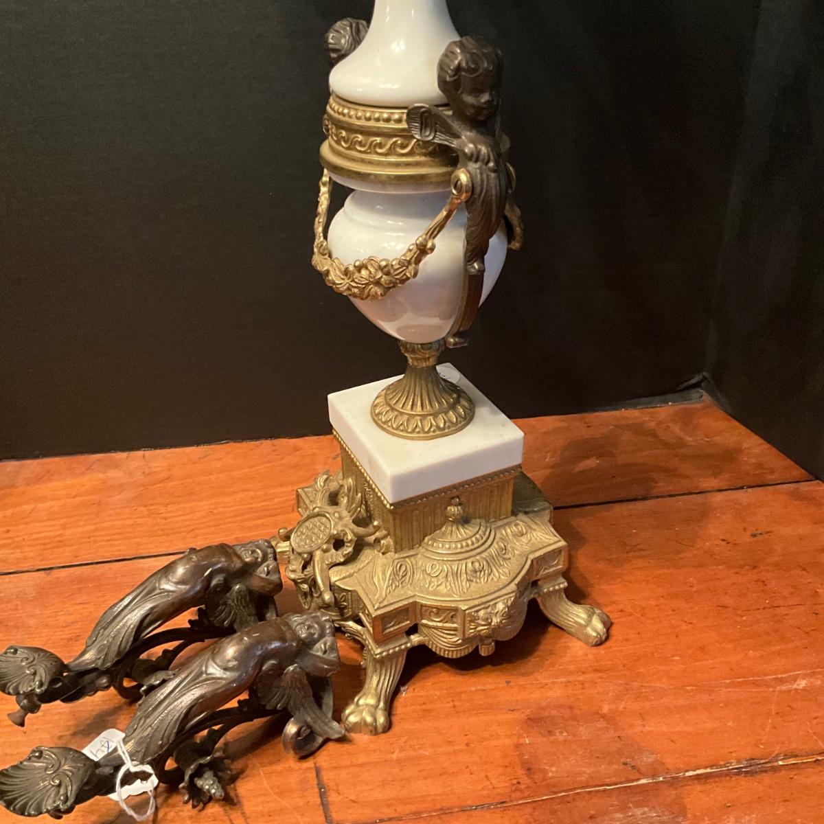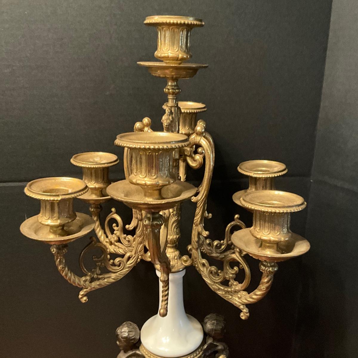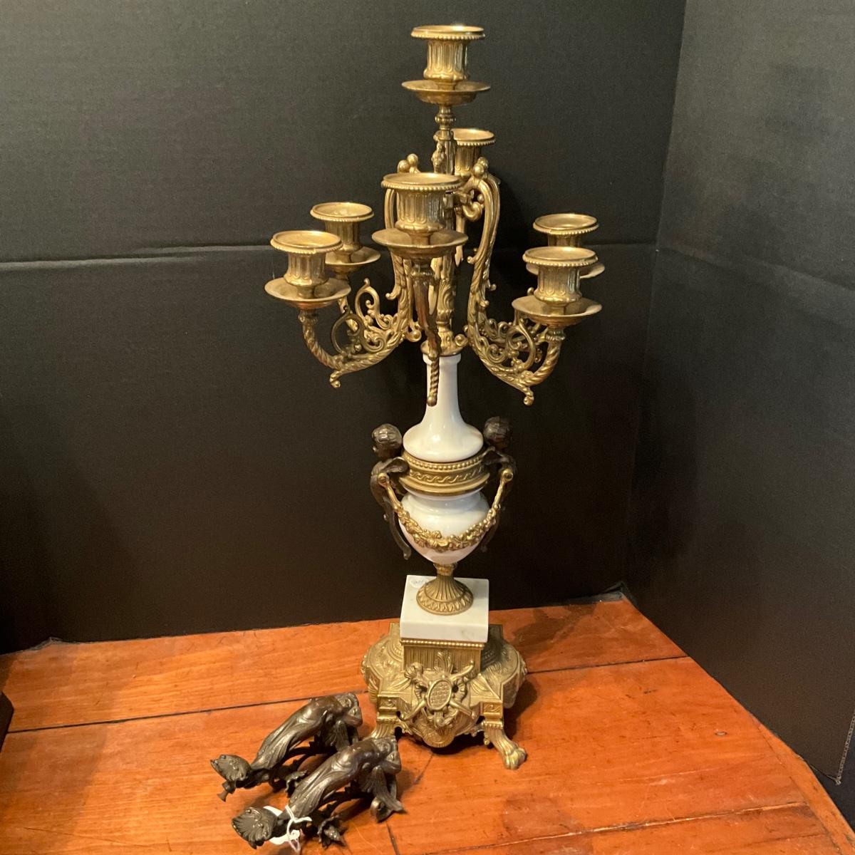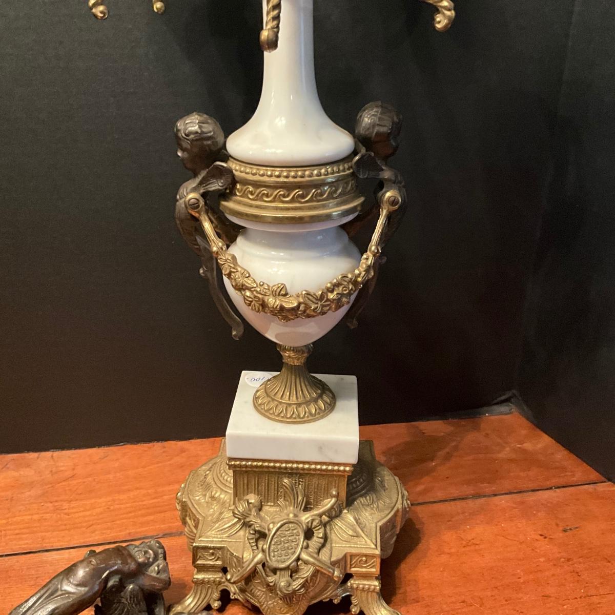 958 Louis XIV Style Bronze and Marble Candelabra with Cherub Pulls