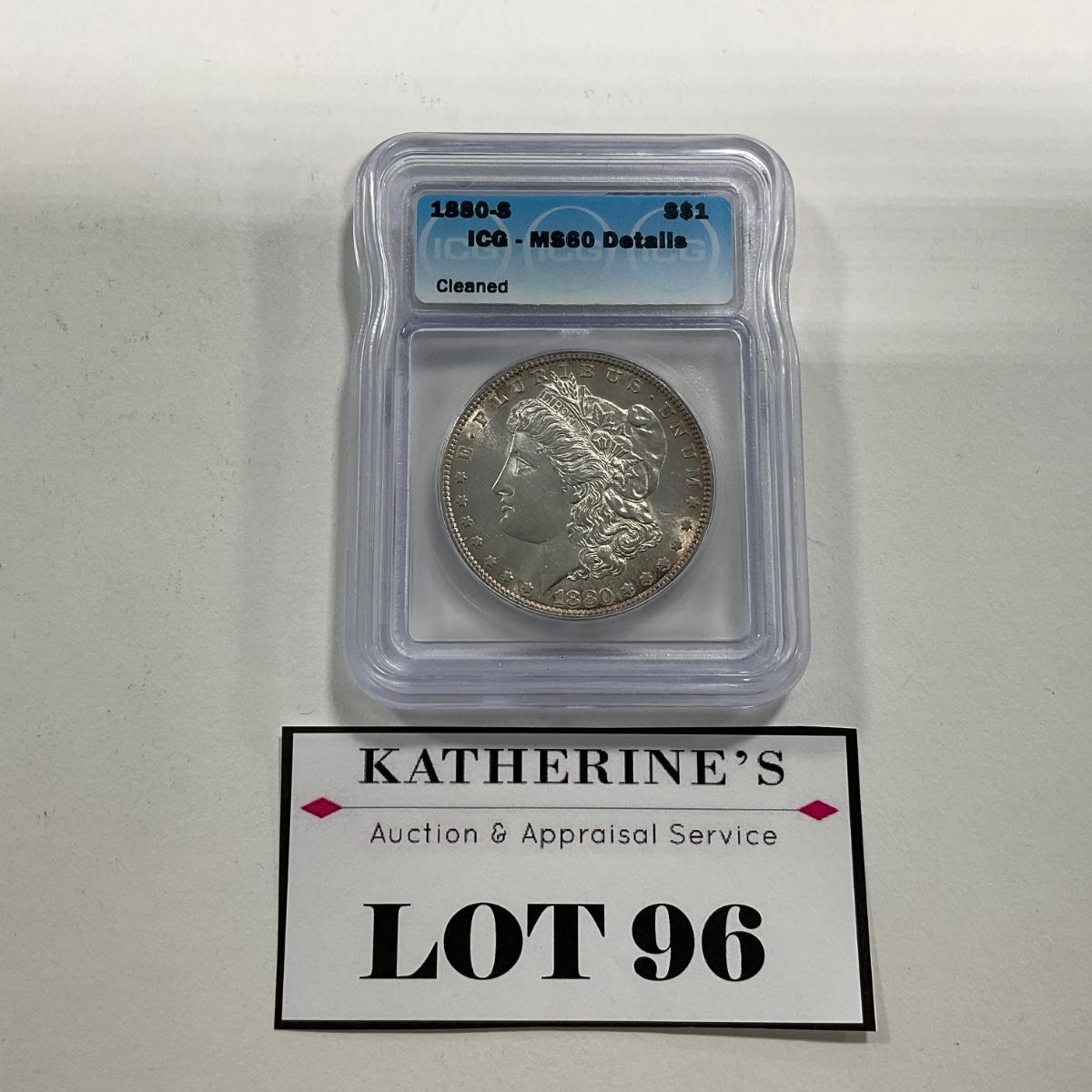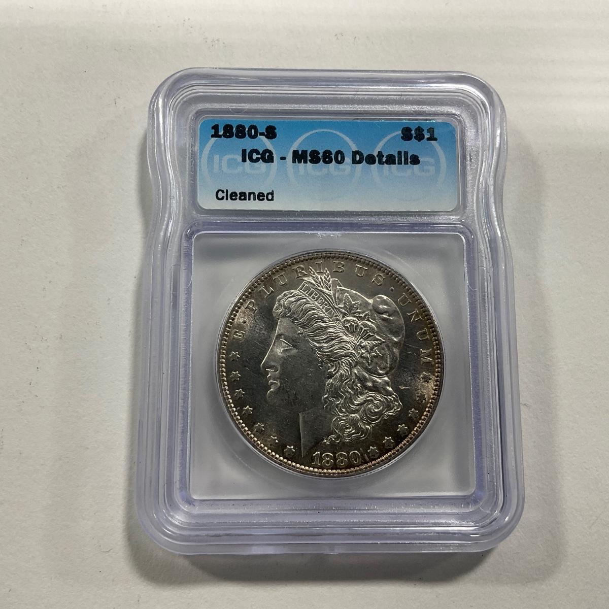 One graded 1880-S Morgan ICG MS60 coin. Please see photos for details and condition. ::: Shipping is available on this lot. If you require shipping you must let us know at the close of the auction. We will coordinate with you after the item has been won. Shipping fees will include insurance up to or exceeding the value of all items being mailed. If you have any questions regarding this lot please contact the auctioneer either via this website, by direct email or by phone. PICK UP TIMES and other important information can be found in the TERMS and DESCRIPTION of the auction. Please take a look for pertinent information. Thanks!
