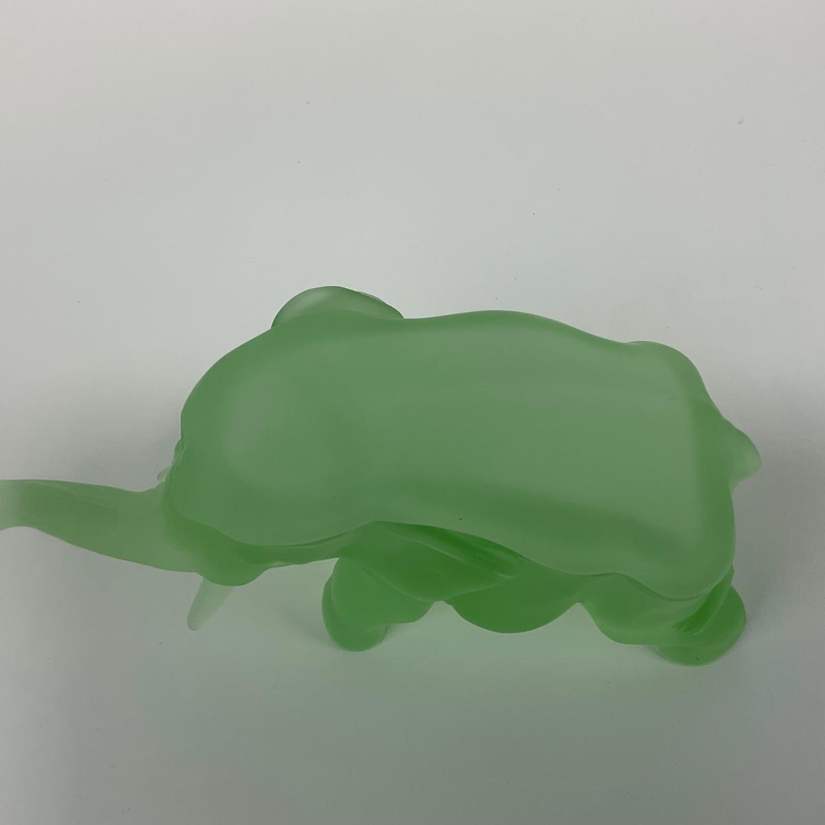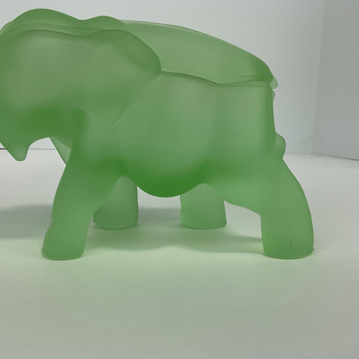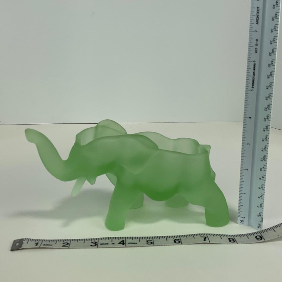 One vintage Indiana glass Tiara Green Frosted satin glass elephant trinket box. This piece does have some scuffs, scratches, marks, or slight damage, but otherwise appears to be in great shape. Please see photos for details and condition. Any condition statement is given as a courtesy to a client, is an opinion, and should not be treated as a statement of fact. Reference to condition written, oral or within a condition report shall not be regarded as a full account of condition and may not include all defects, alterations, or restorations. Absence of a condition report does not imply a lot is flawless or lacking imperfections or damage. Katherine’s Auction & Appraisal Service shall have no responsibility for any error or omission. Returns shall not be accepted on the basis of condition. ::: Shipping is available on this lot. If you require shipping you must let us know at the close of the auction. We will coordinate with you after the item has been won. Shipping fees will include insurance up to or exceeding the value of all items being mailed. If you have any questions regarding this lot please contact the auctioneer either via this website, by direct email or by phone. PICK UP TIMES and other important information can be found in the TERMS and DESCRIPTION of the auction. Please take a look for pertinent information. Thanks!