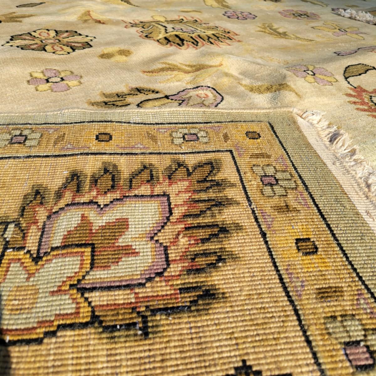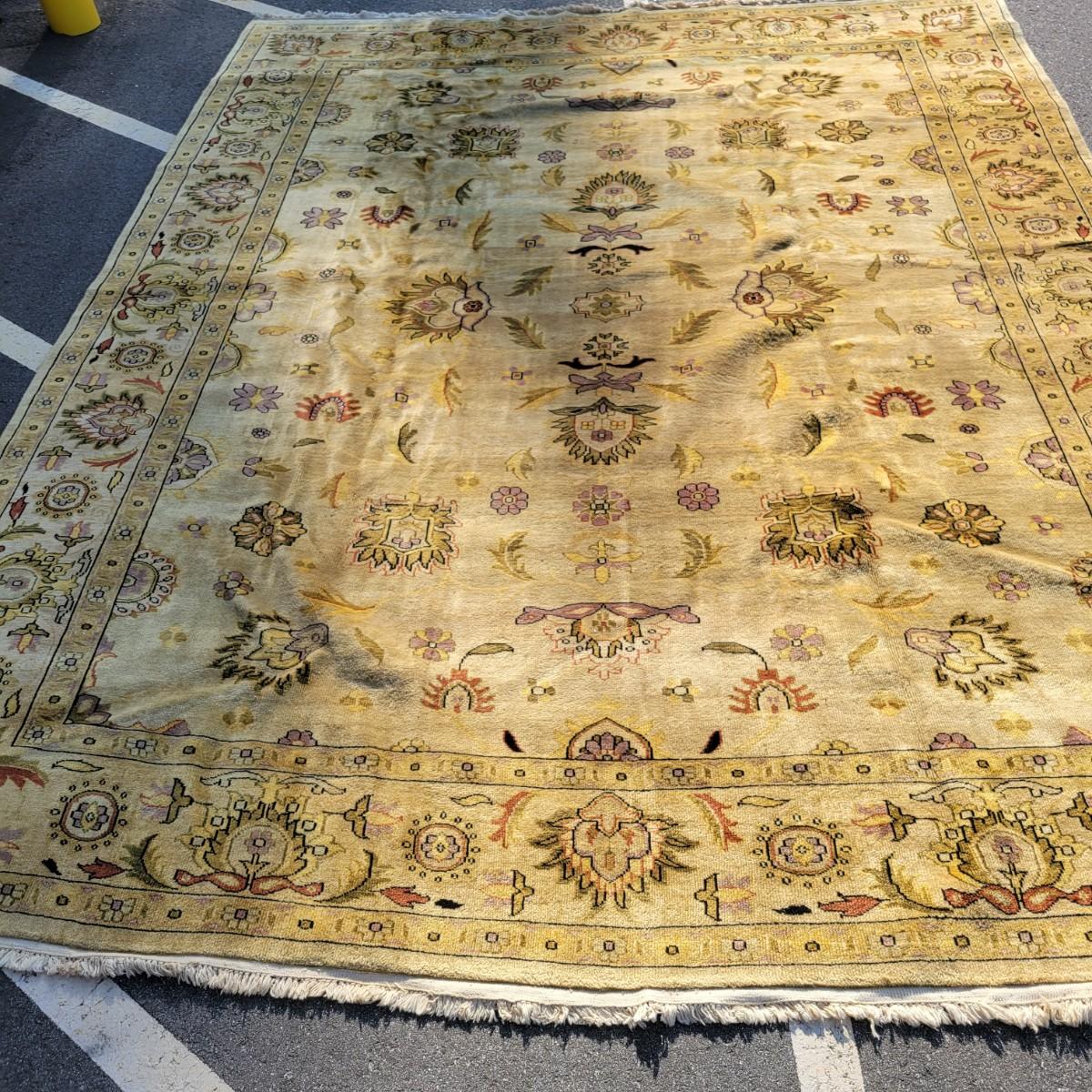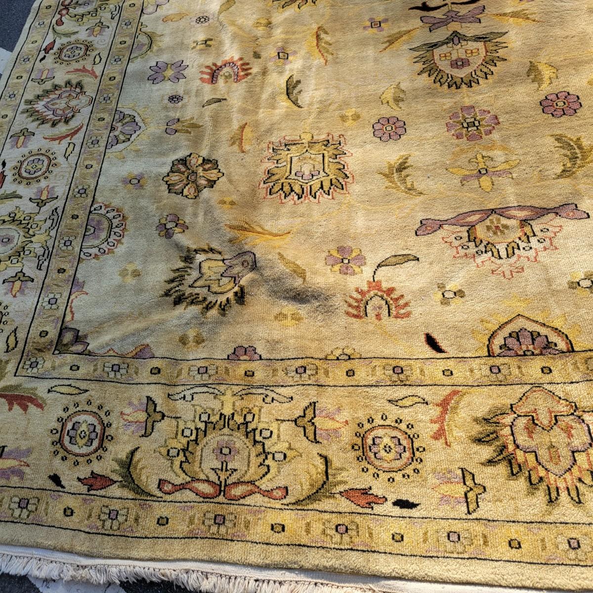 A large area rug in good condition with no notable stains, but there is a small damaged area near the center of the rug. Rug is a tan and gold motif with subtle hilight colors. Measures approximately 9'6" x 12'6" Local pickup only