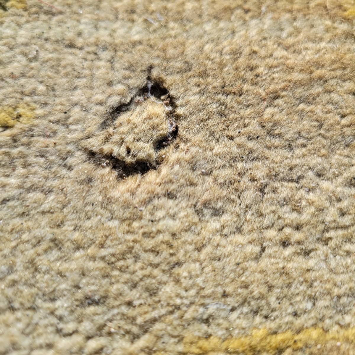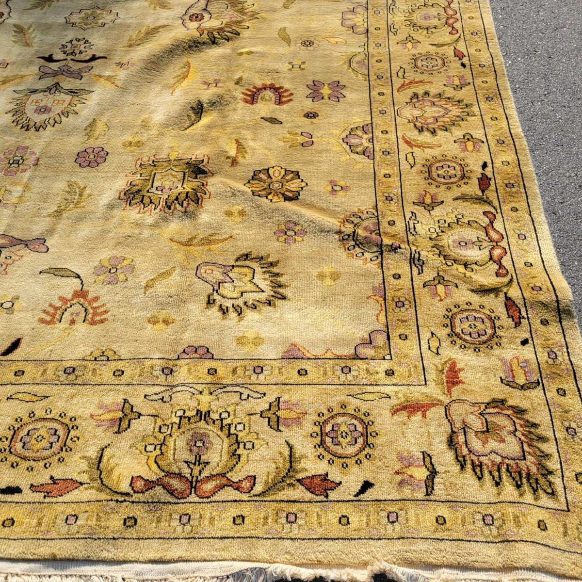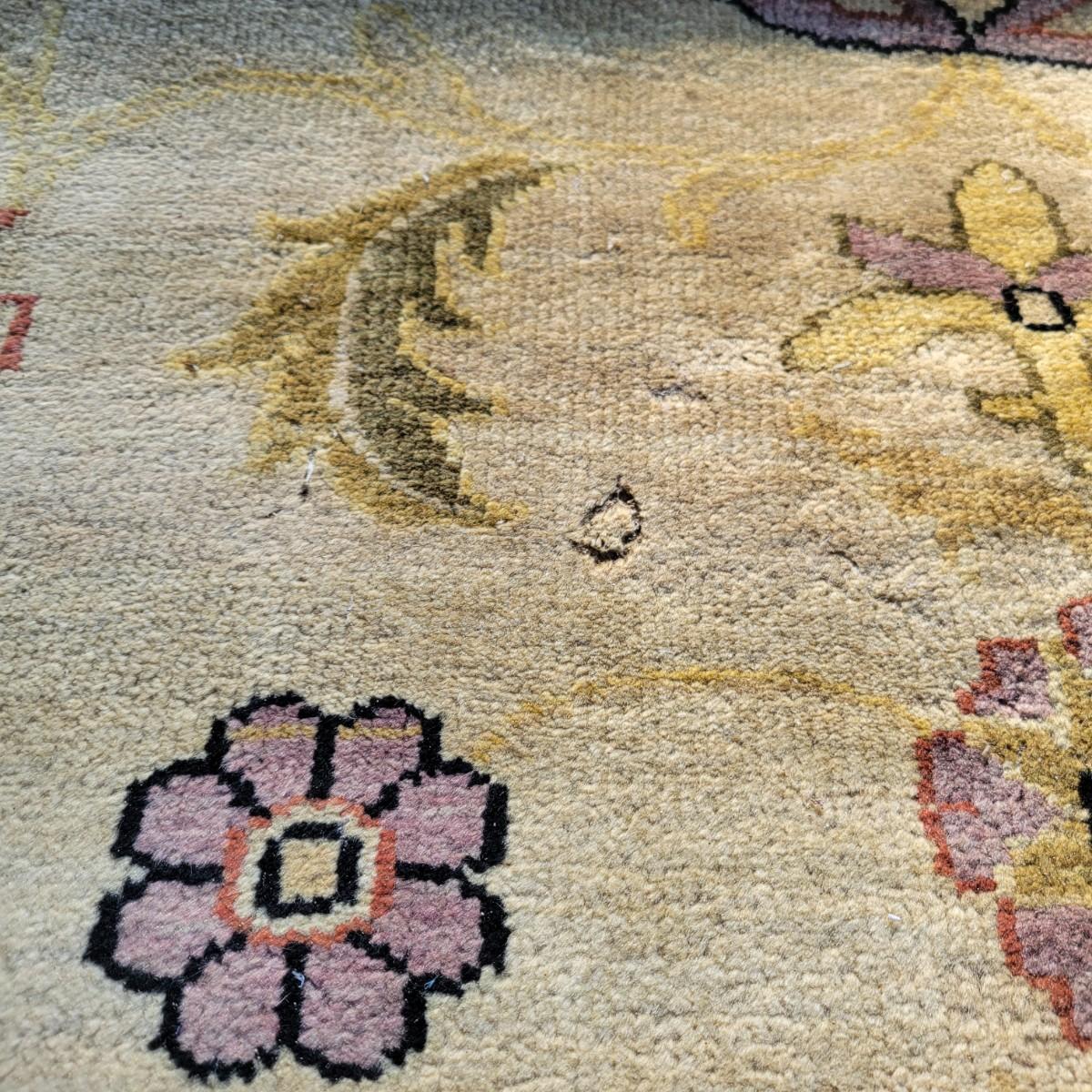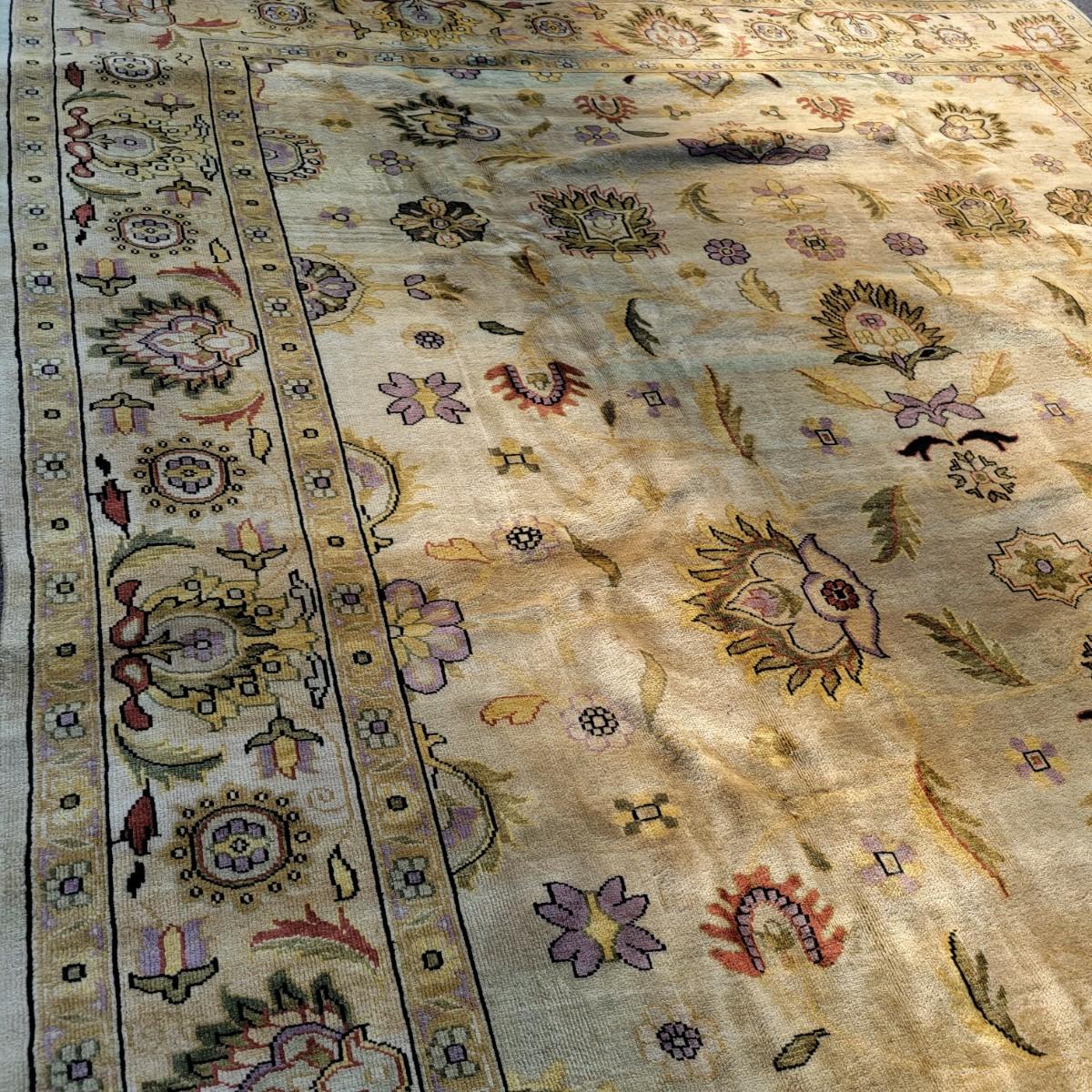 A large area rug in good condition with no notable stains, but there is a small damaged area near the center of the rug. Rug is a tan and gold motif with subtle hilight colors. Measures approximately 9'6" x 12'6" Local pickup only