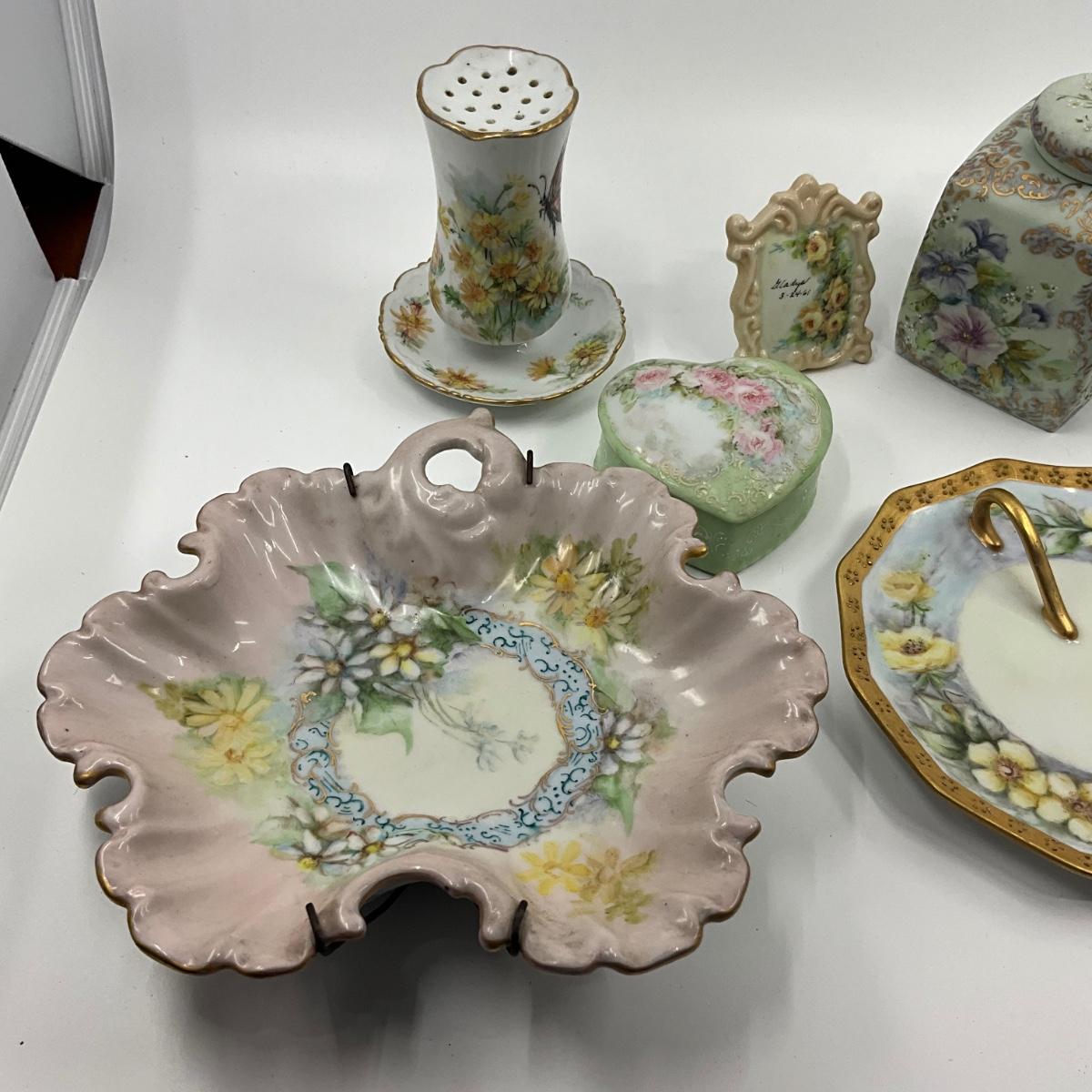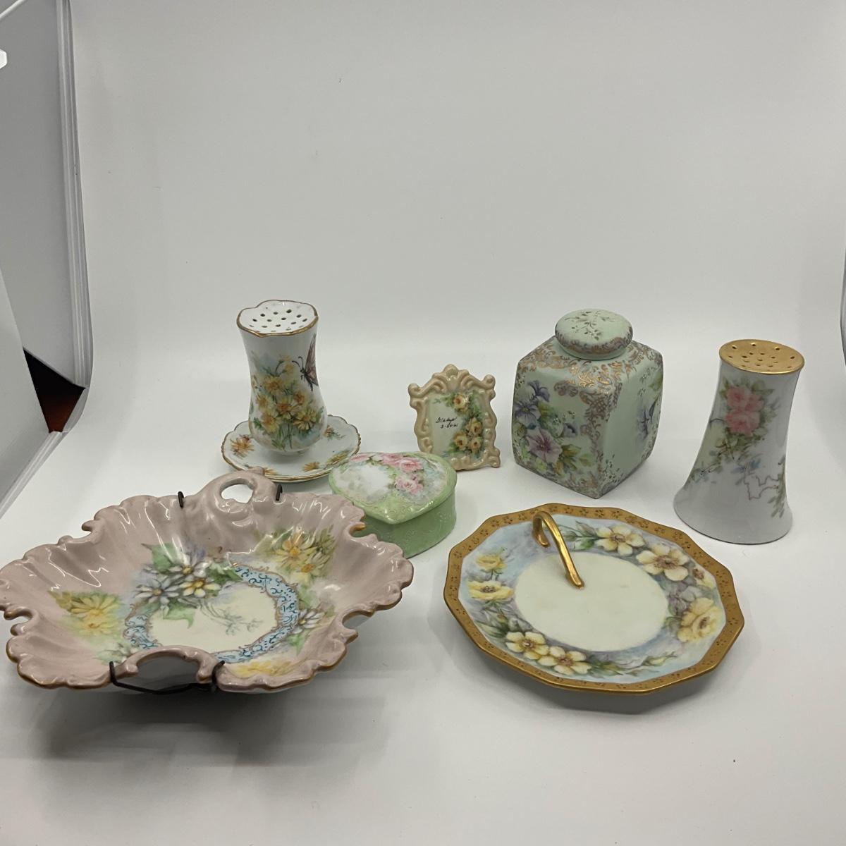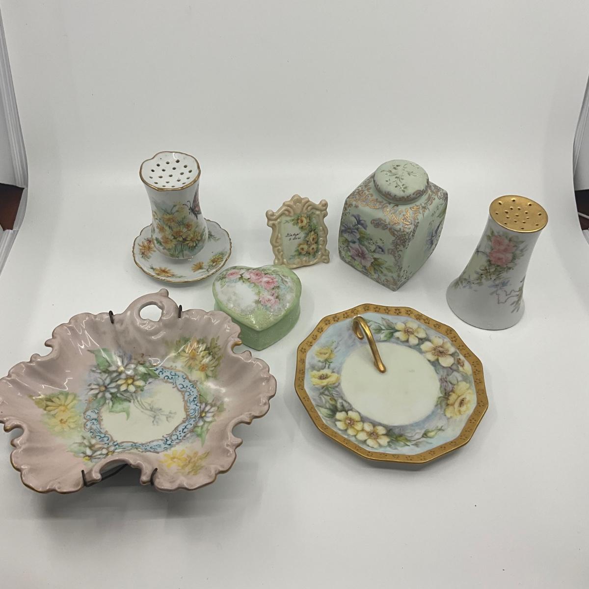 960 Lot of Handpainted Porcelain Hat Pin , Jars, Nappy and Plate with Covered Heart Box