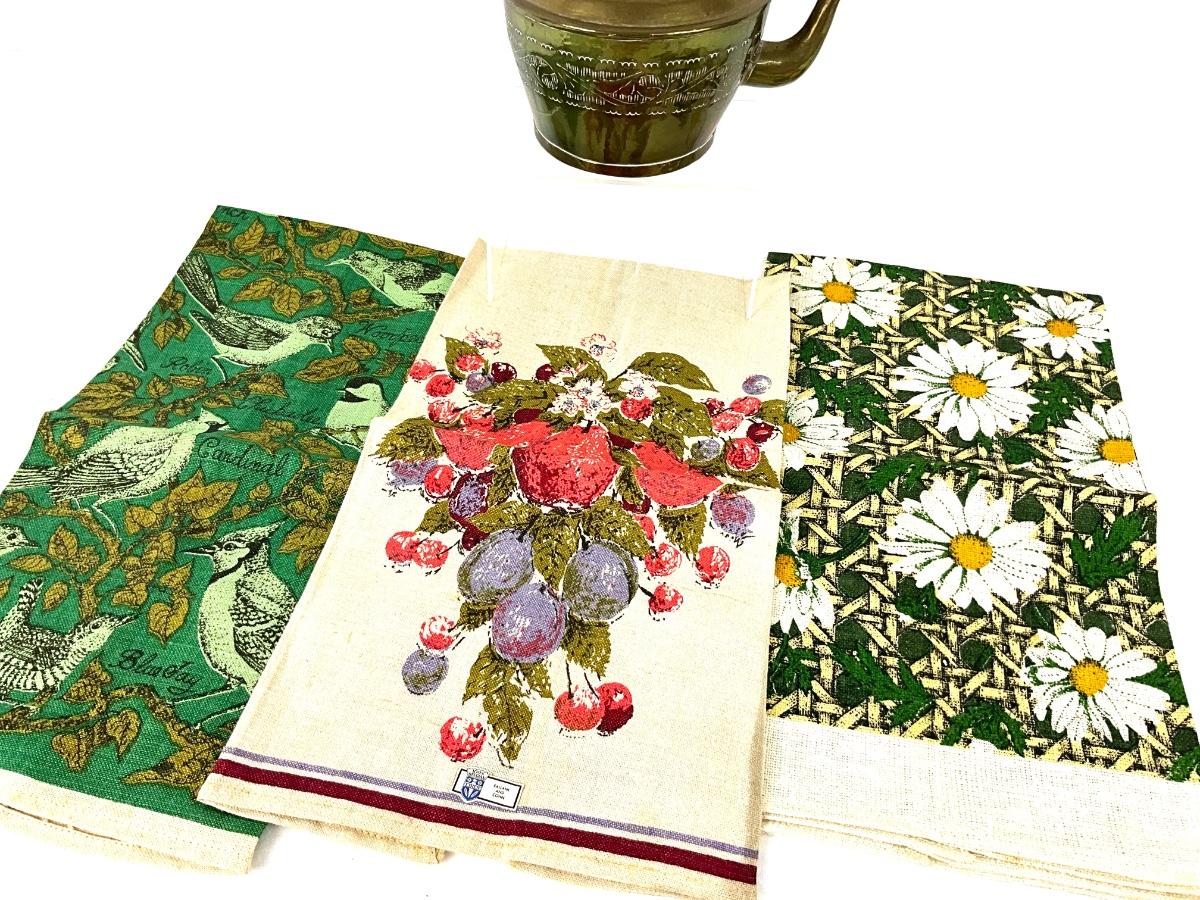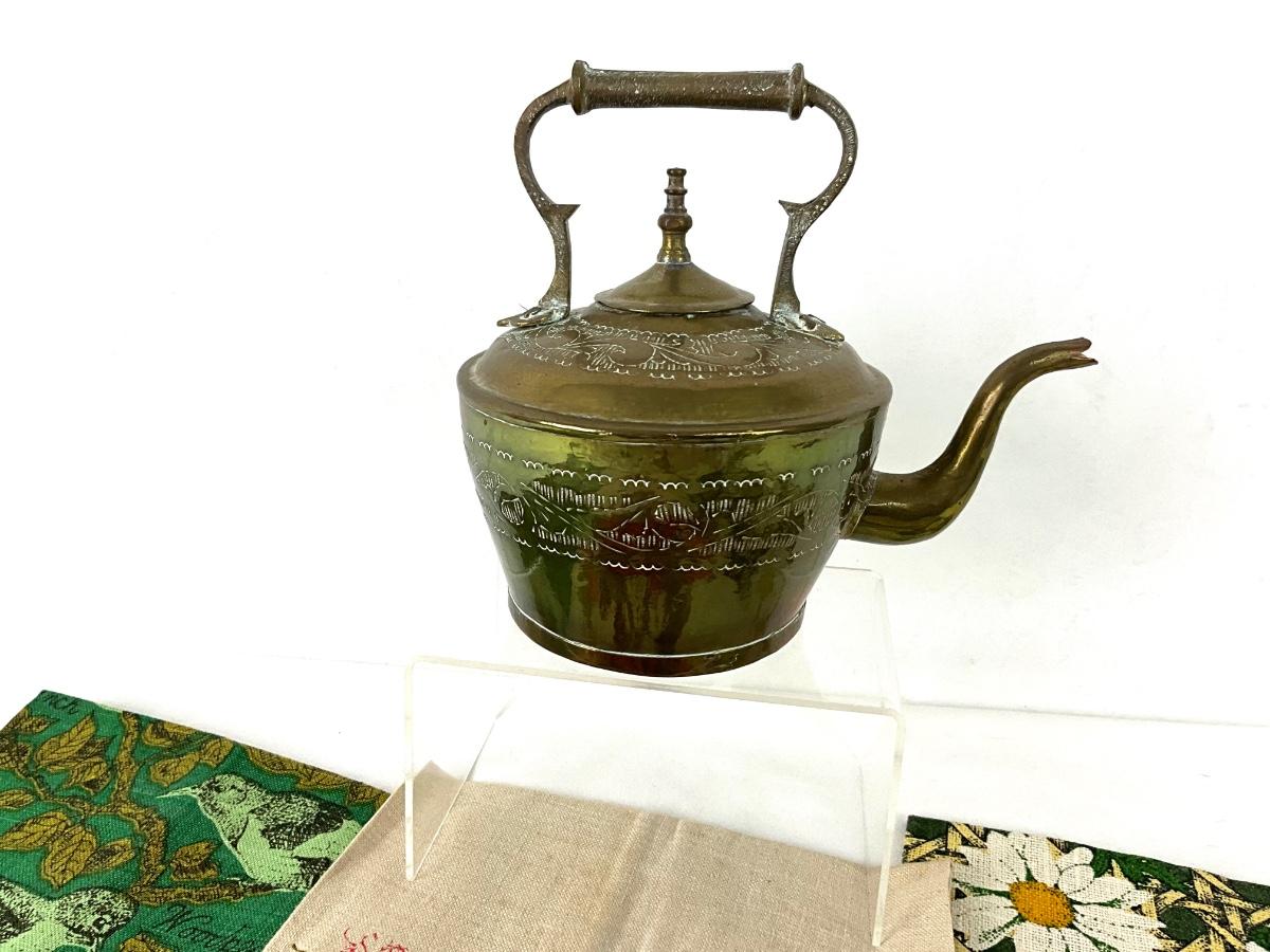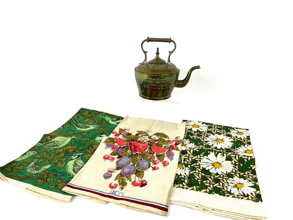 961 Vintage 3pc Linen Tea Towel Set with Copper Brass Teapot