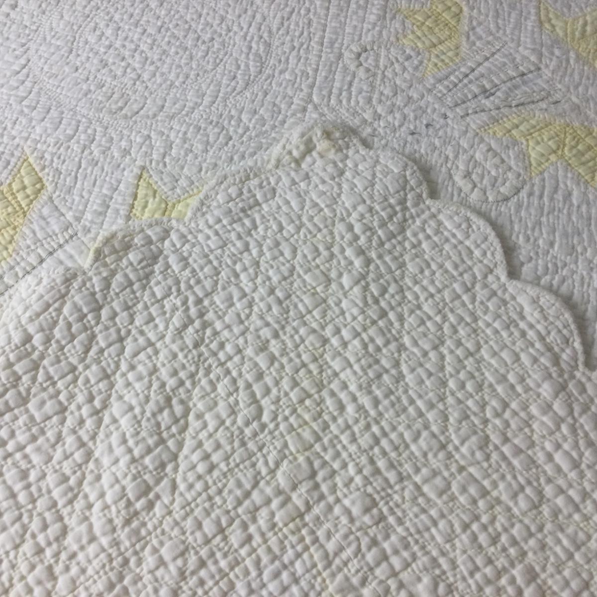 Quilt is soft and well loved, scalloped edge. Measures 70” x 73”.