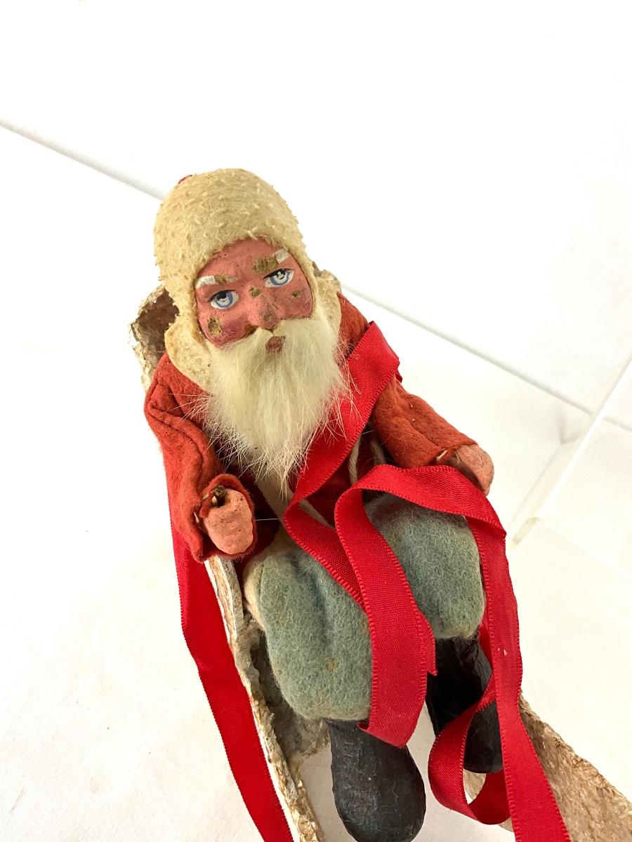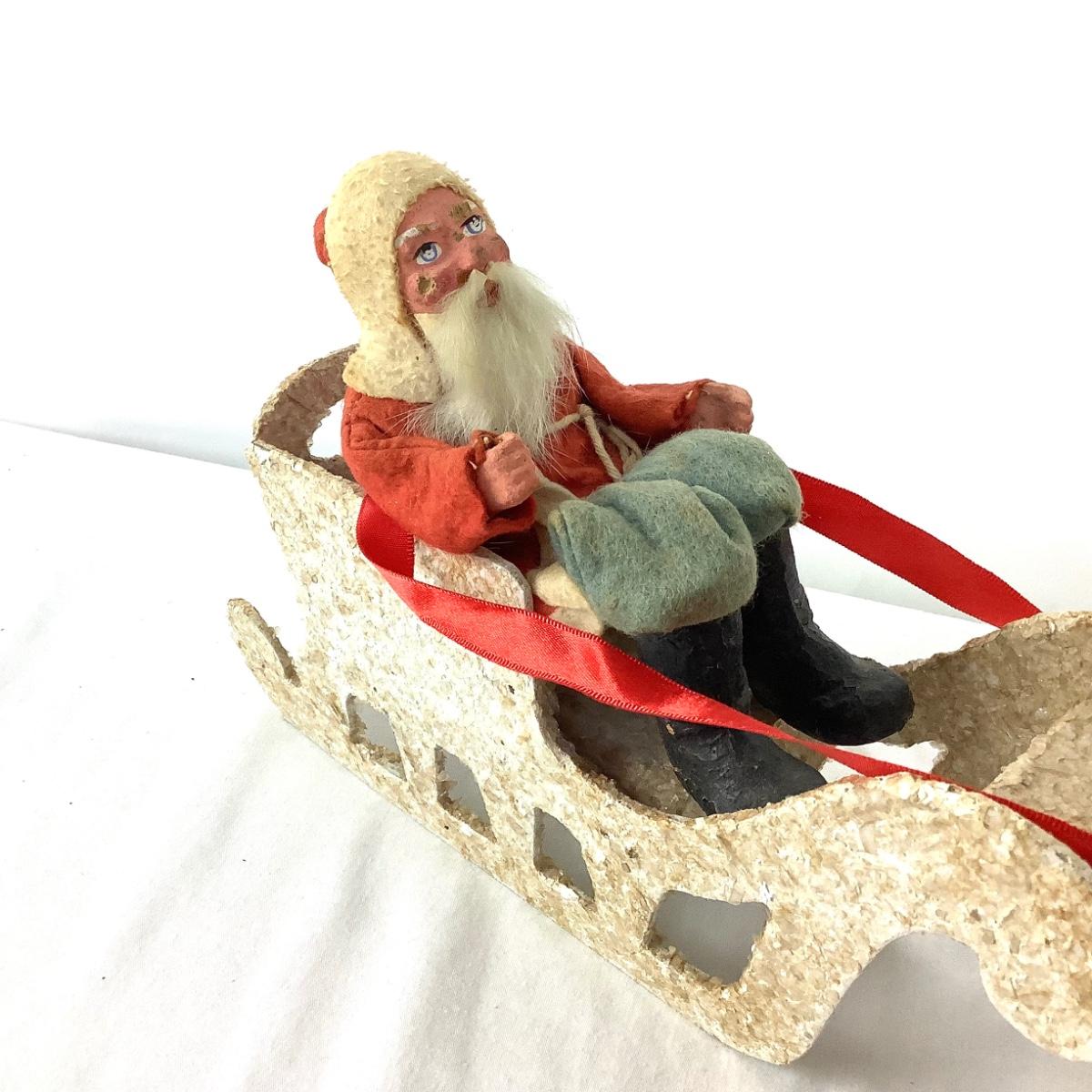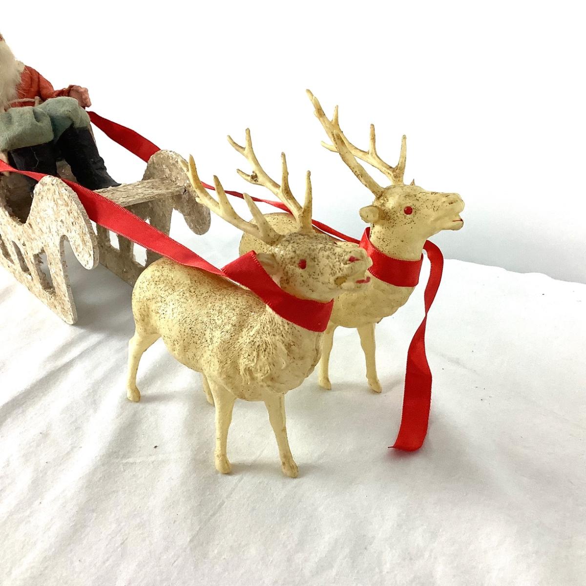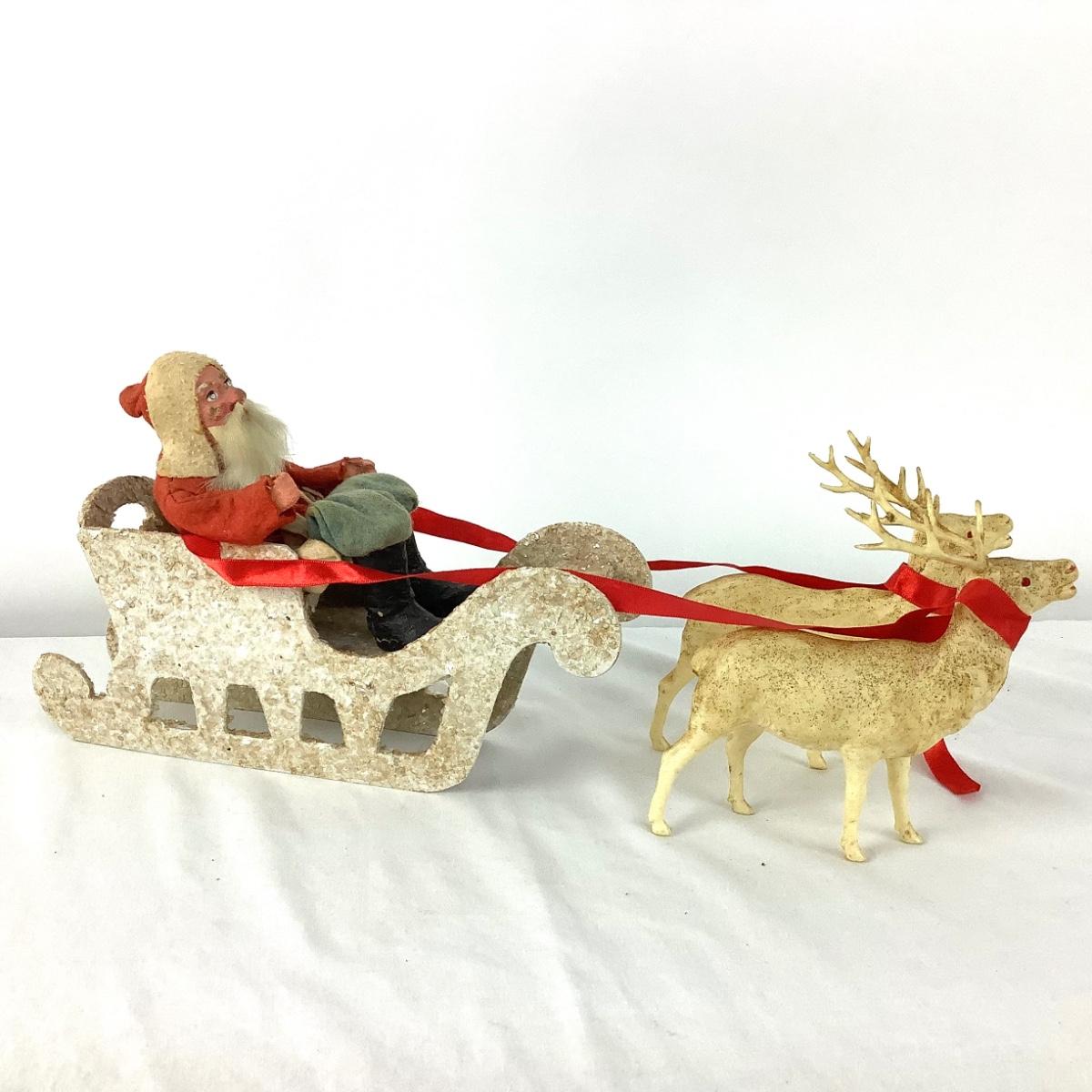 962 Antique Paper Mache Santa with Sled and Celluloid Reindeer