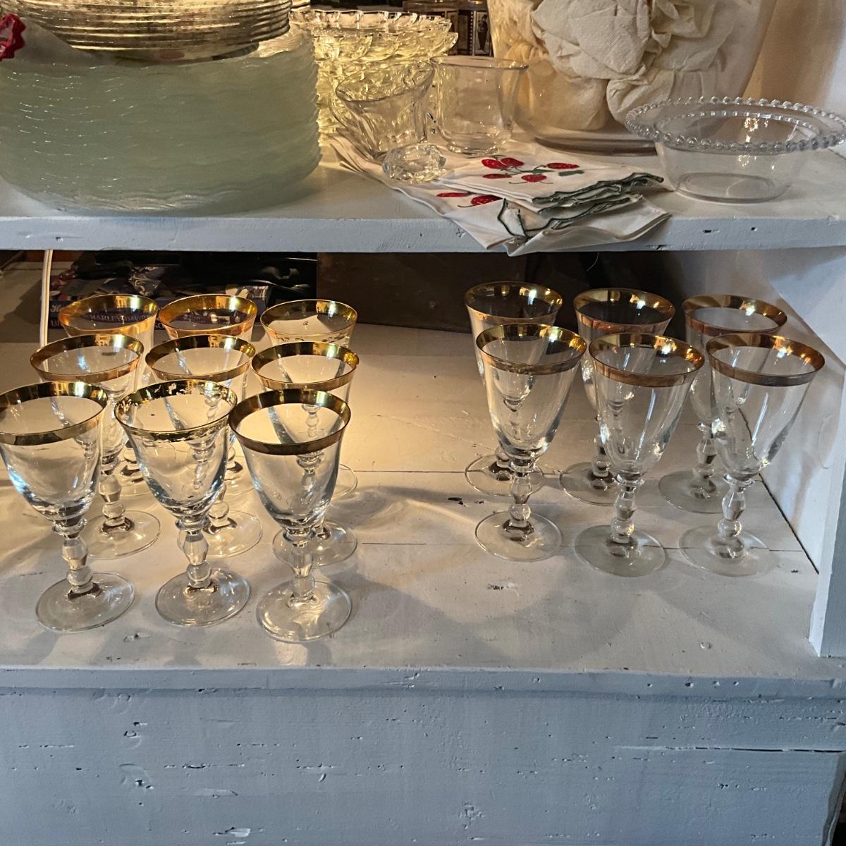 9 wine glasses with gold edge(some worn) and 6 water glasses ( wear on some)