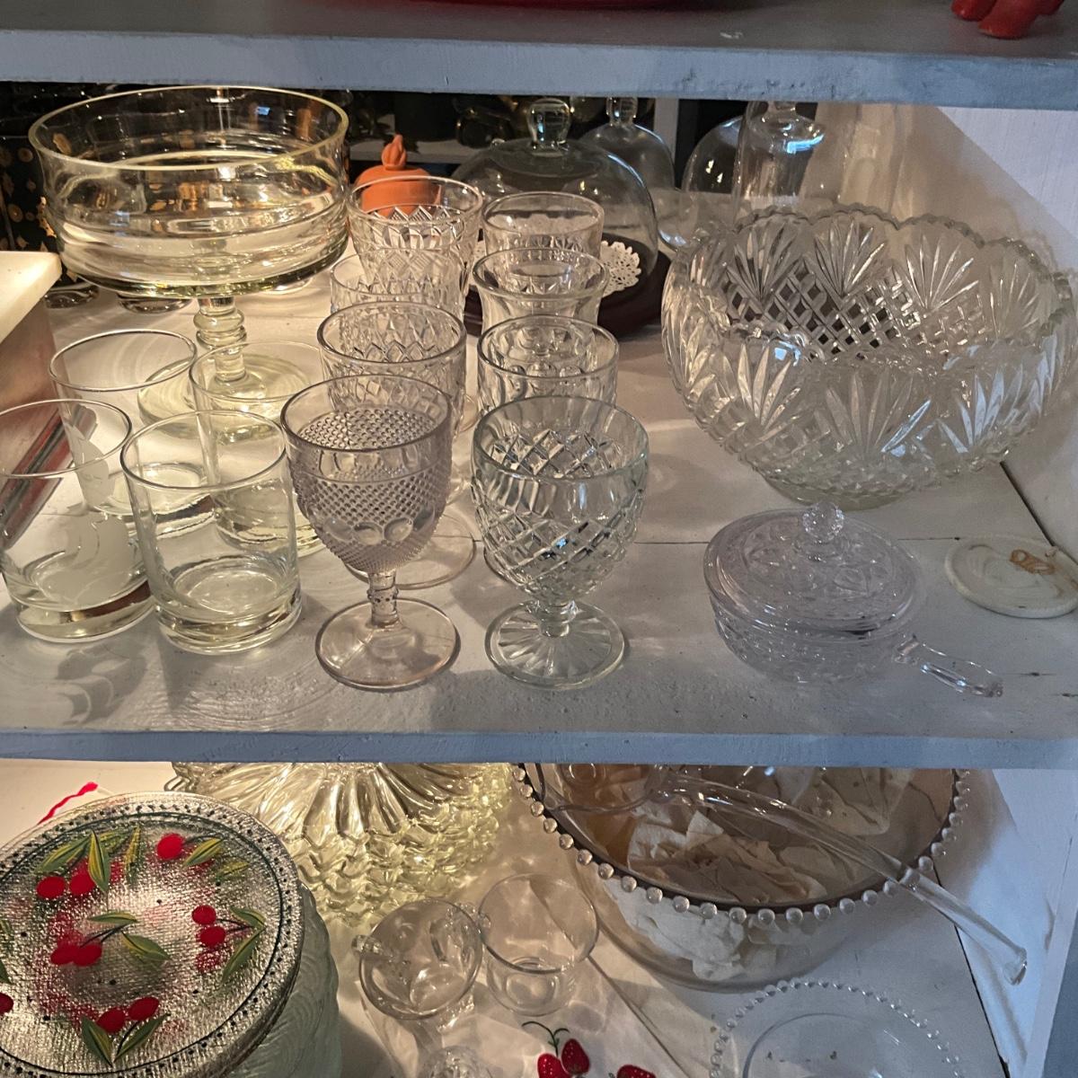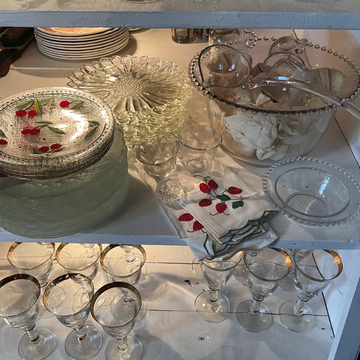 963 Large Glass Lot , Wine Glasses , Candlewick Punch Bowl, and Cherry Glass Plates and Sunflower Plates