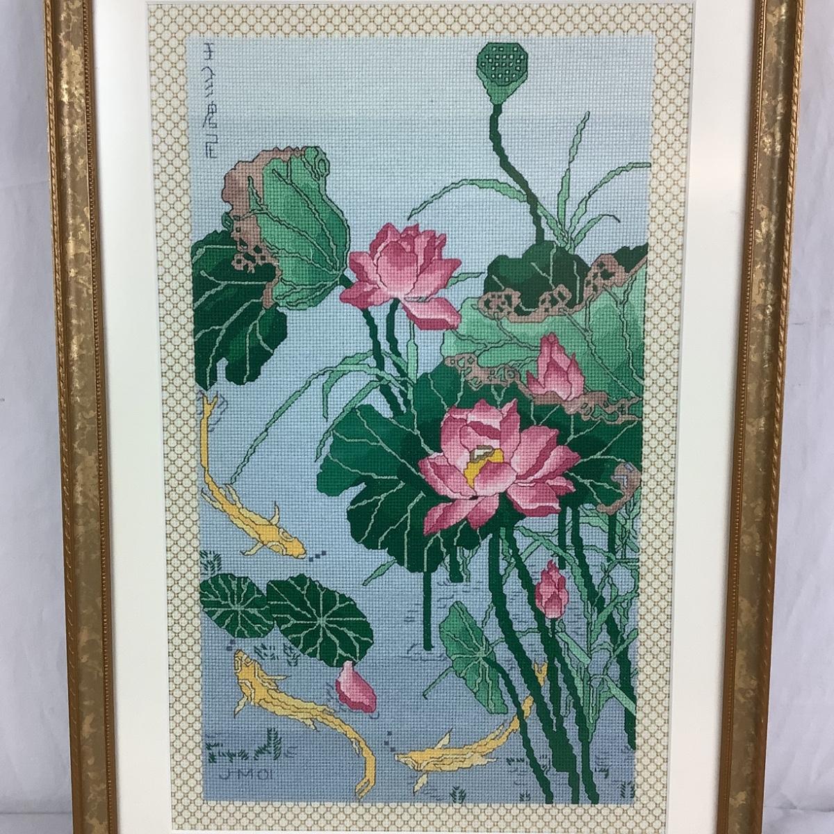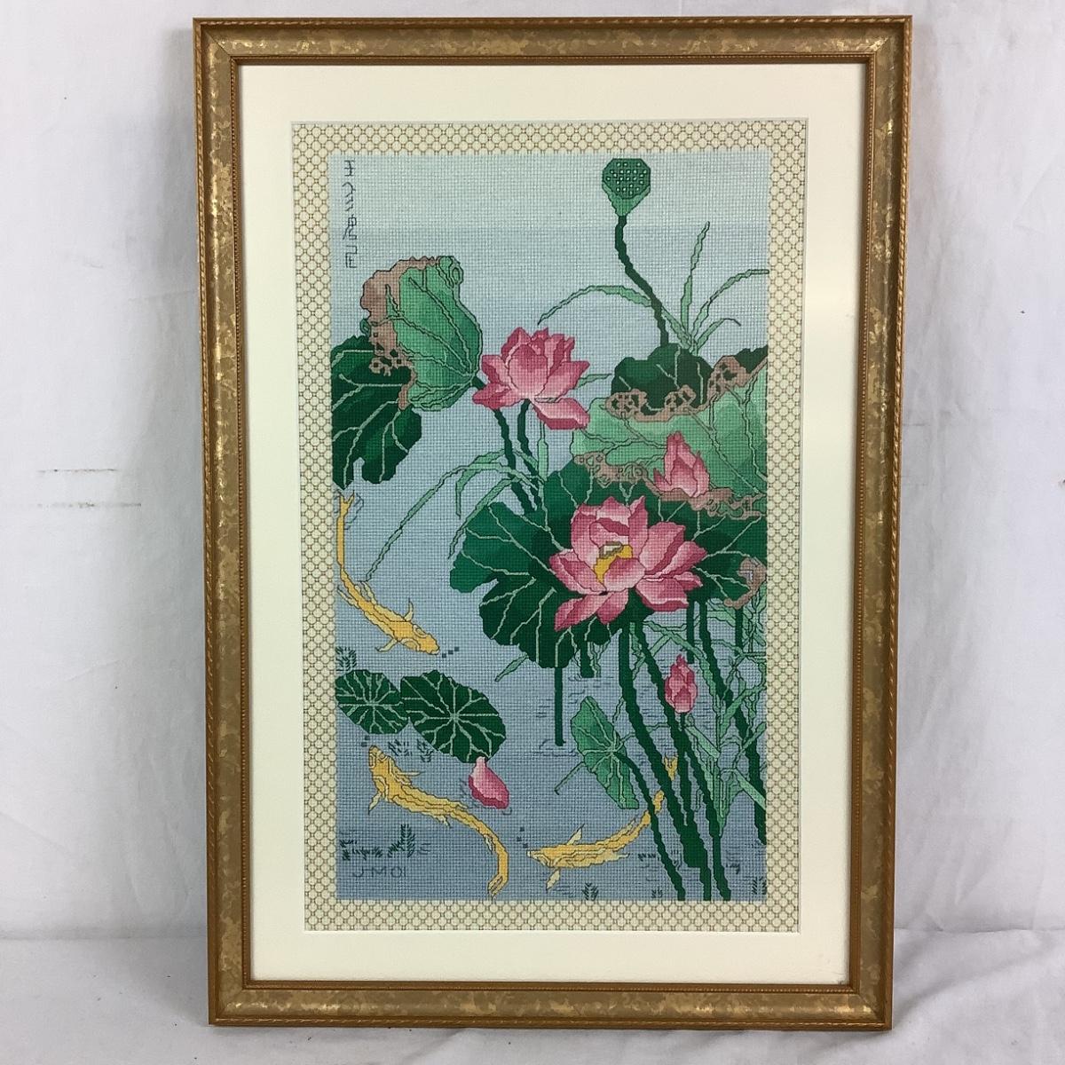 963 Signed Needlepoint of Waterlilies and Koi Fish