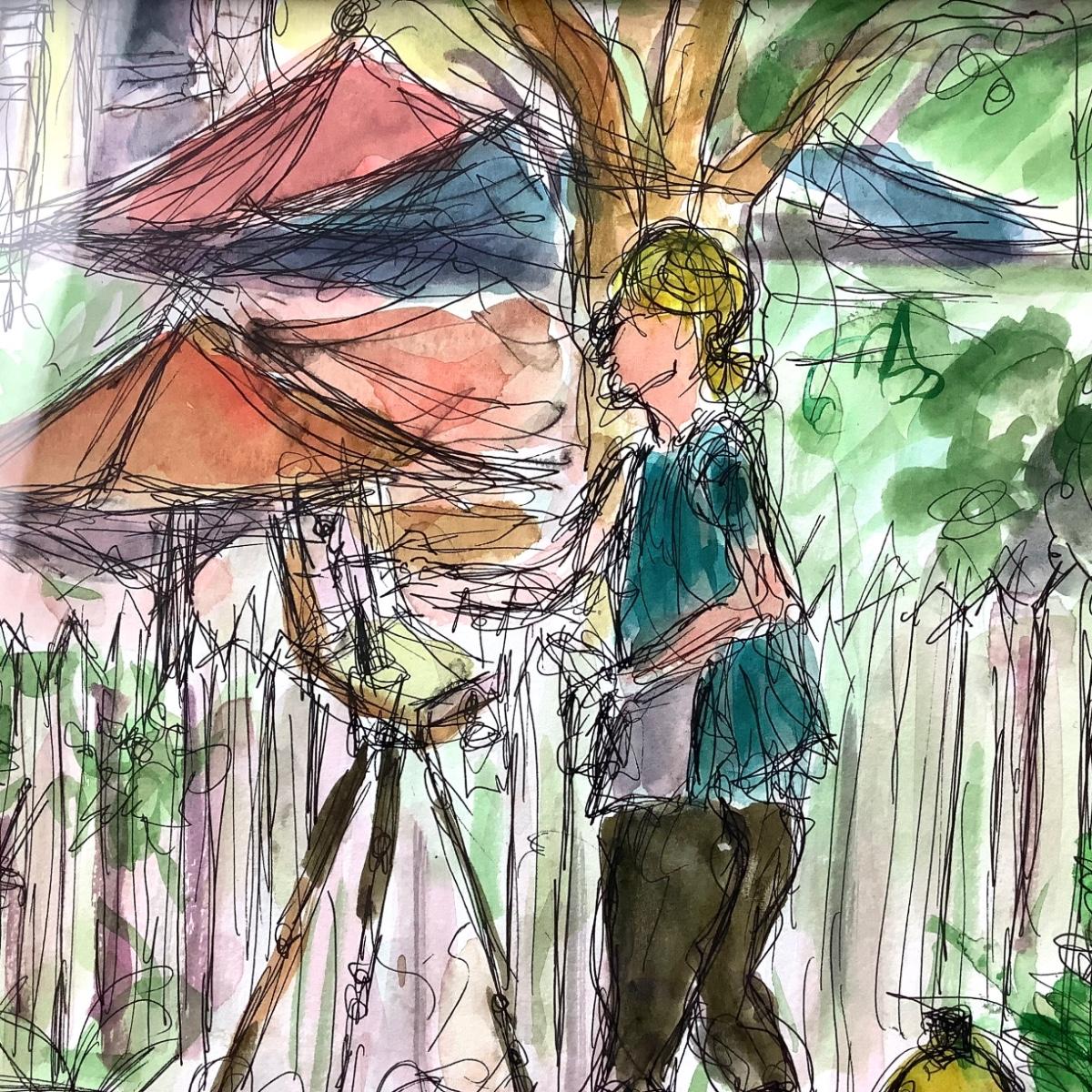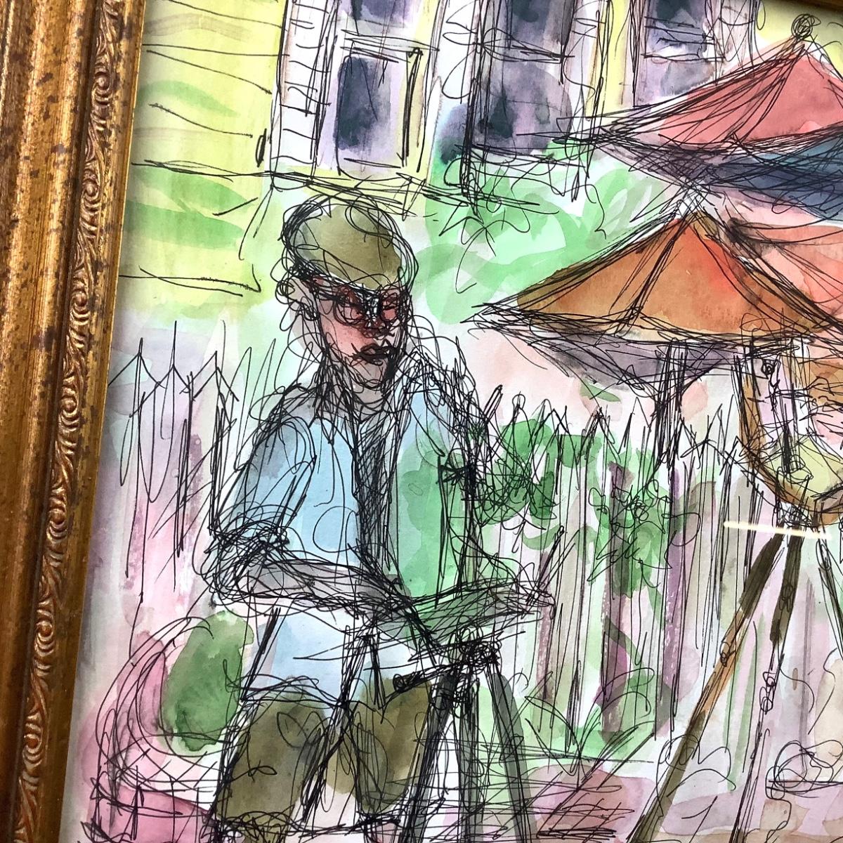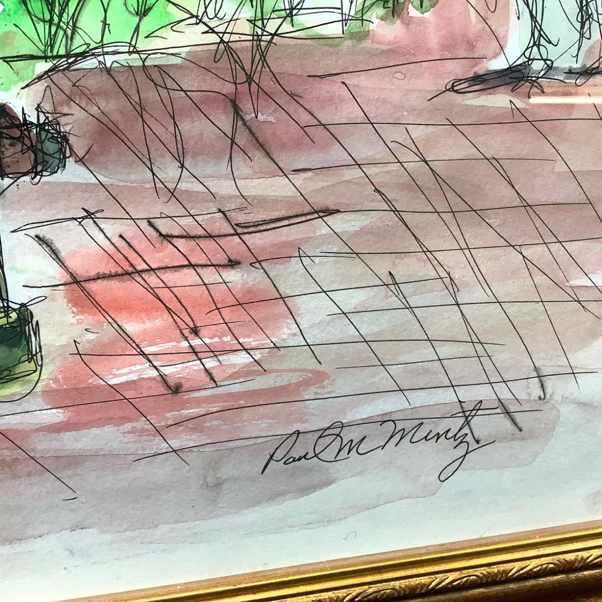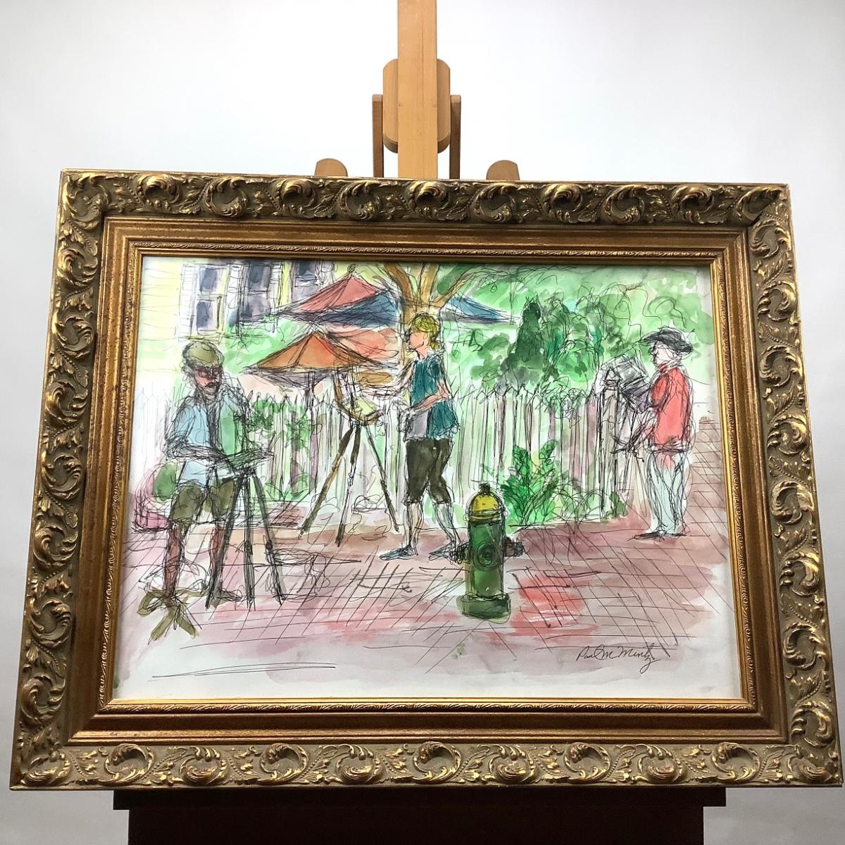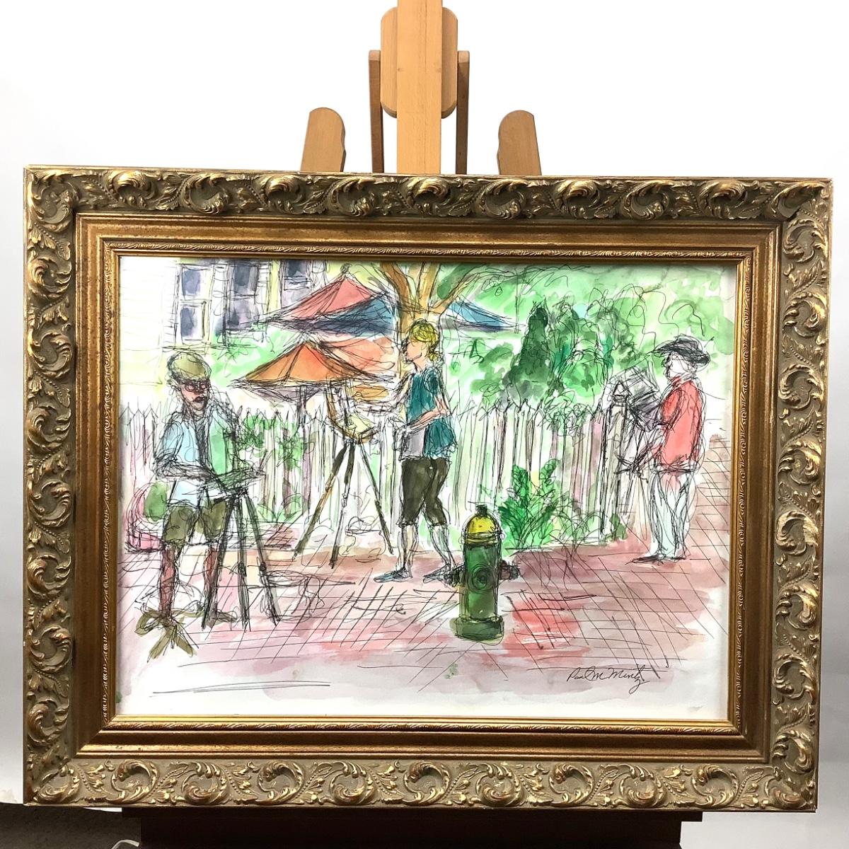The watercolor painting measures 29.5"wide x 23.5" high it is framed and depicts artists creating their works of art at the Plein Air Festival. Paul M. Mintz is an artist from Baltimore,MD. He does various types of art from character drawings to nudes.
