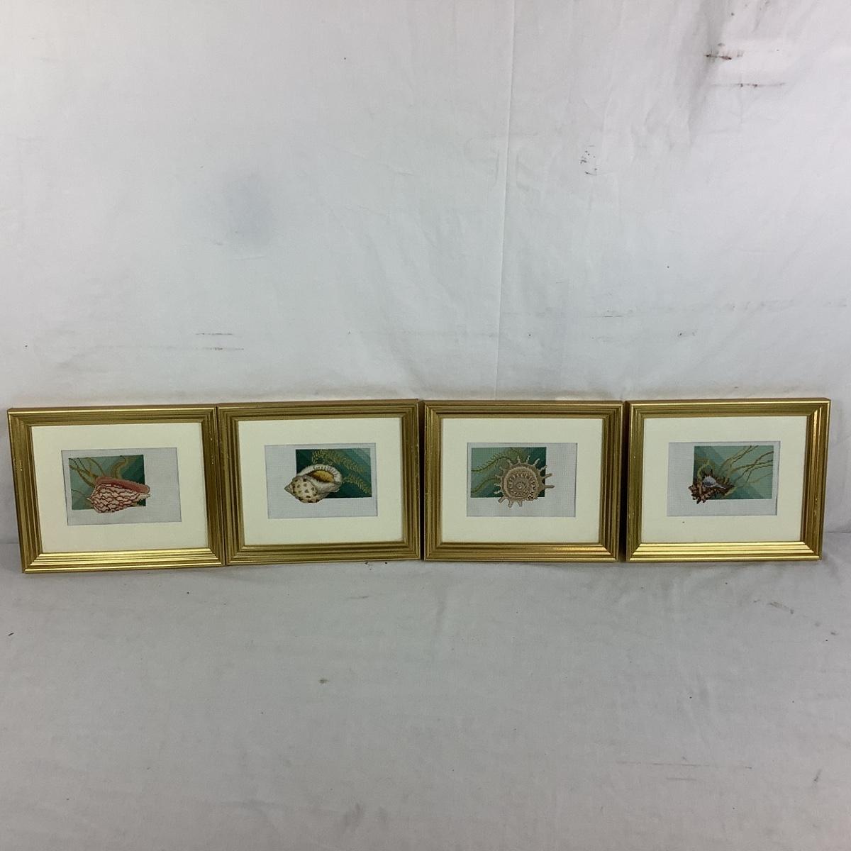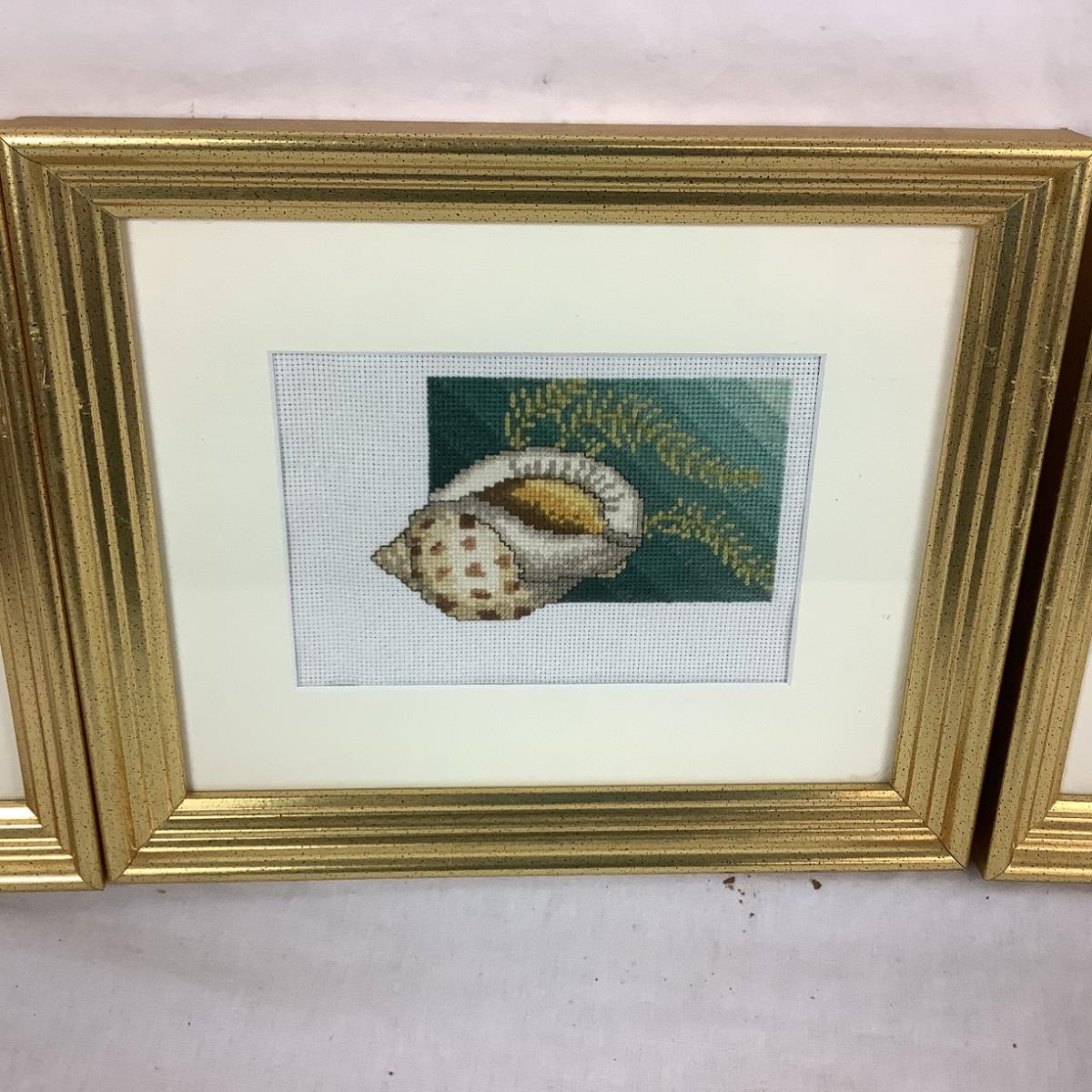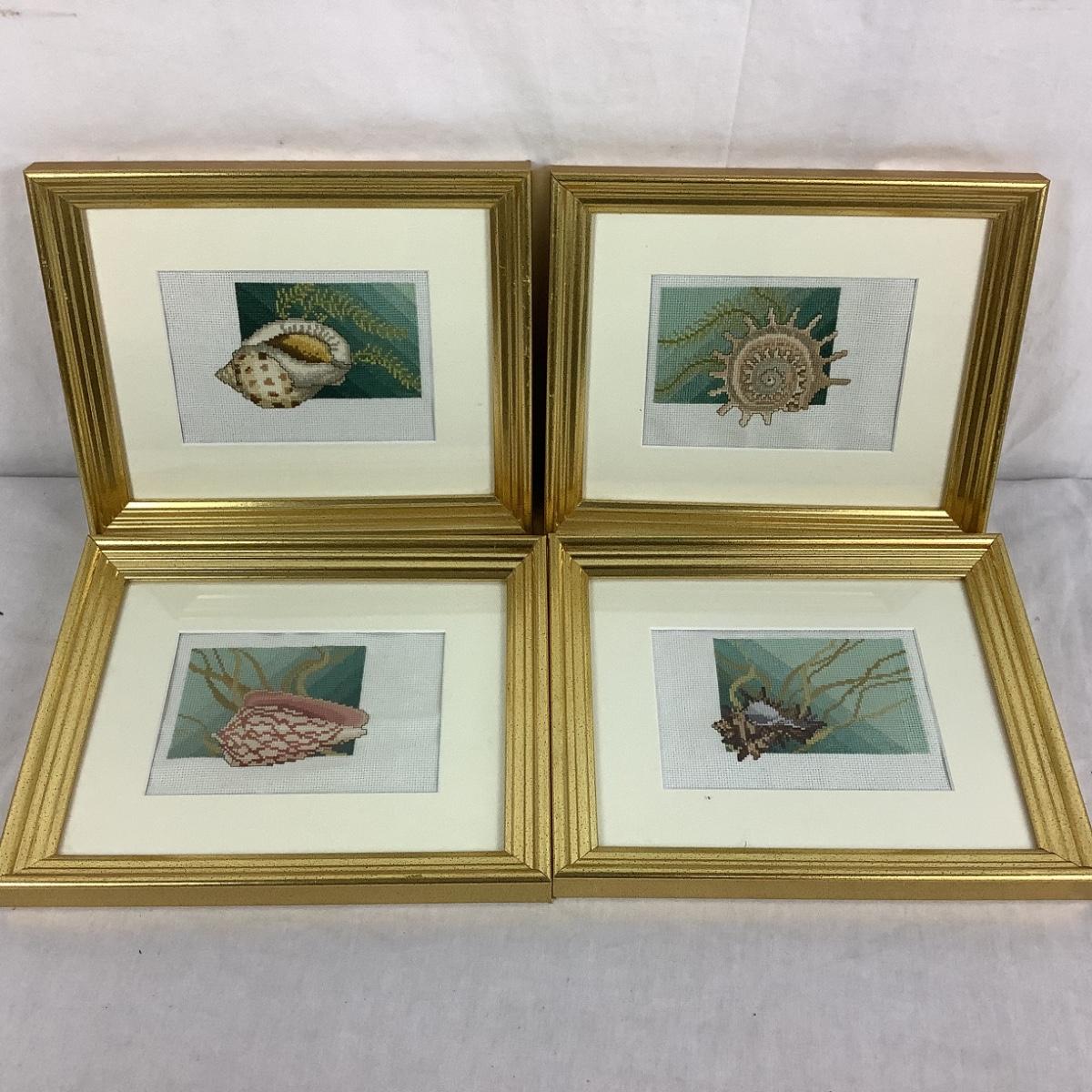 965 Set of 4 Gold Framed Shell Designs Needlepoint Wall Art
