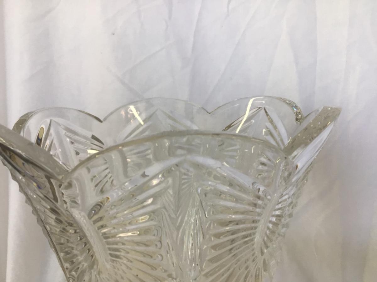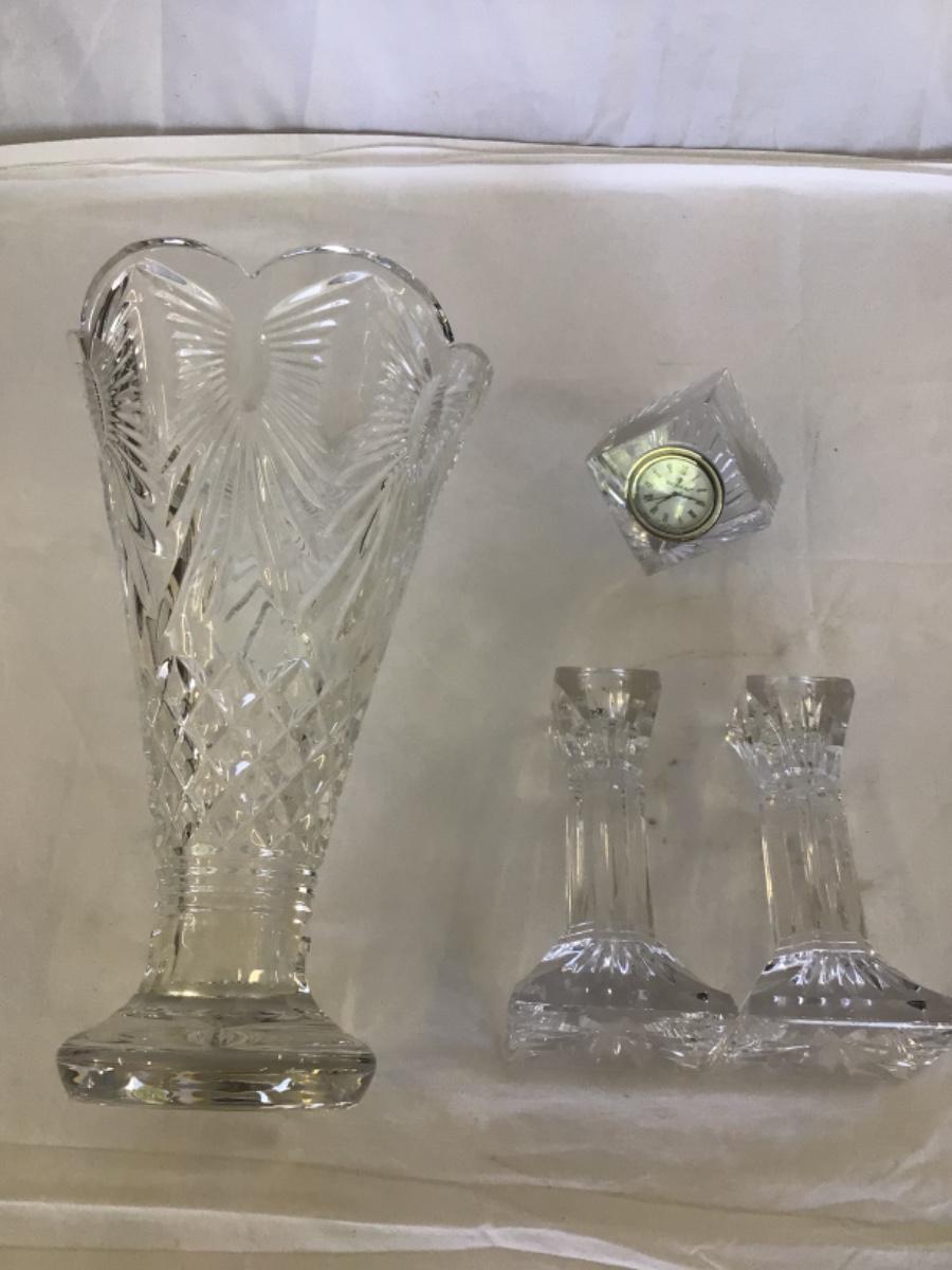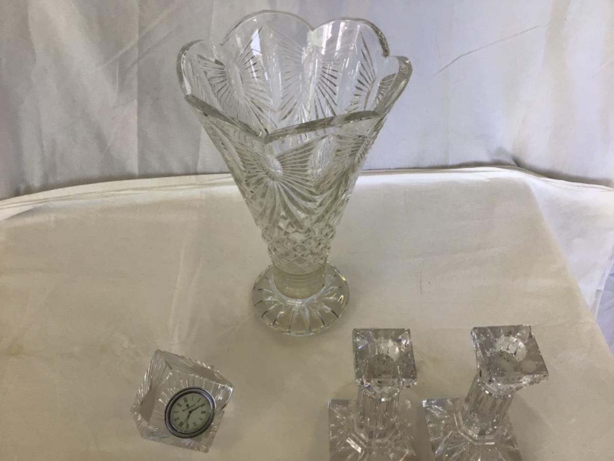 Footed 12”H Vase w/7” Opening has small flea bite, Wye (2) candlesticks@6.25” H, Waterford Diamond cube clock