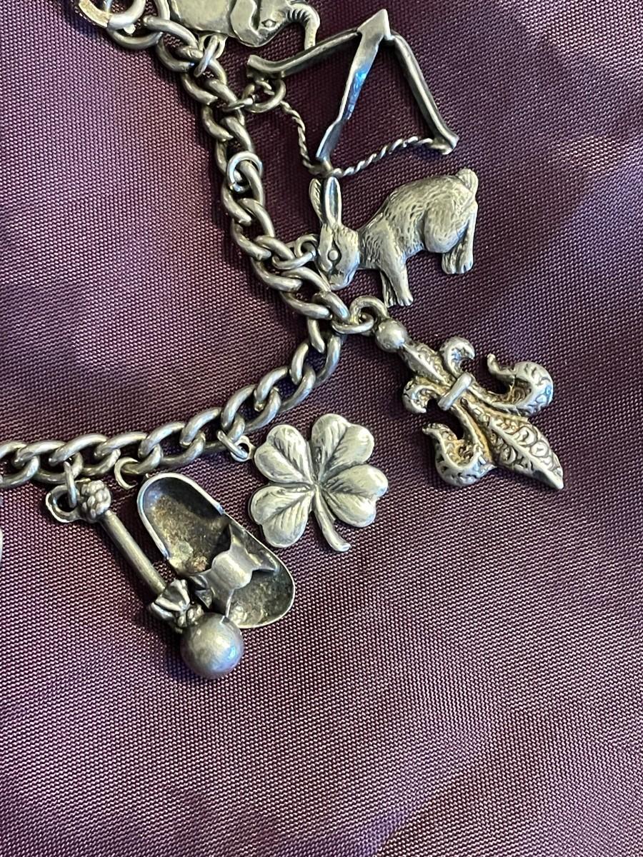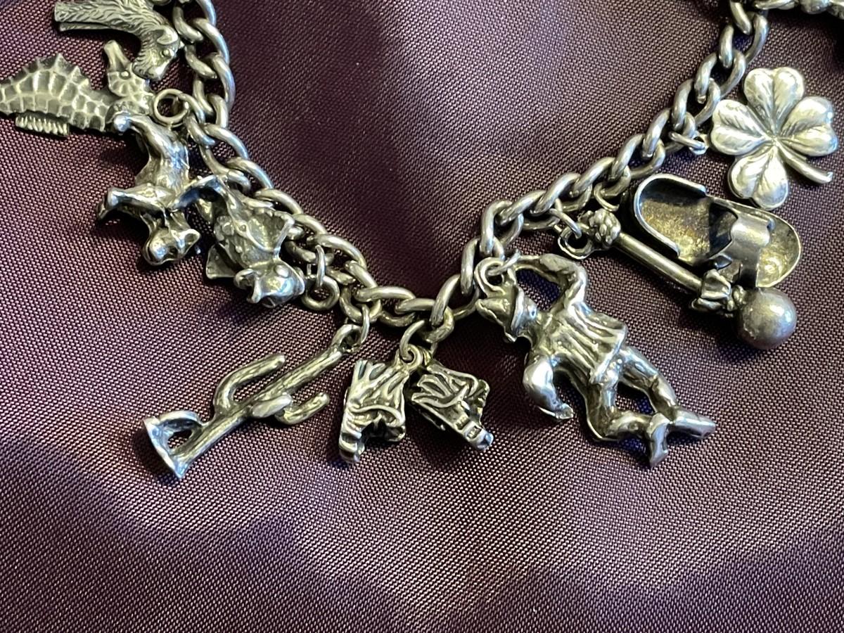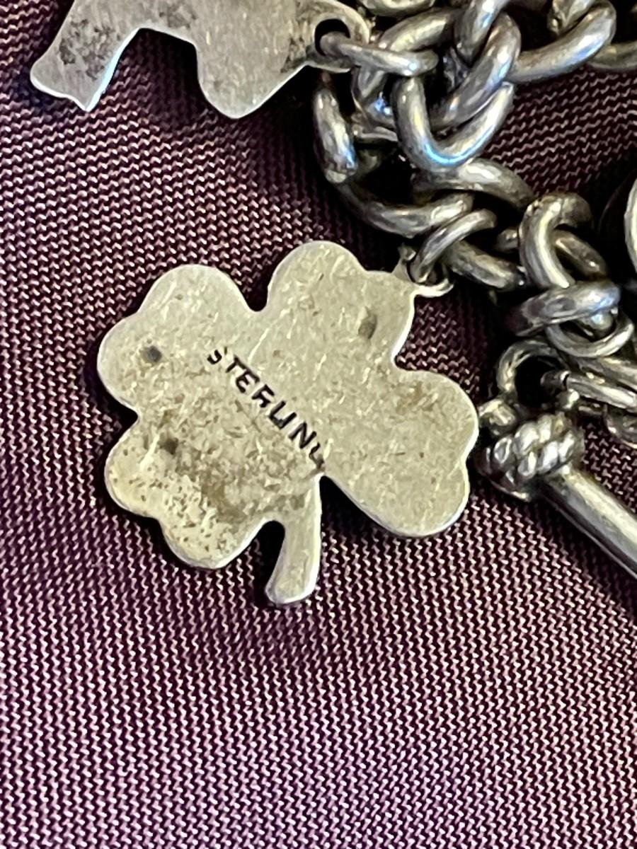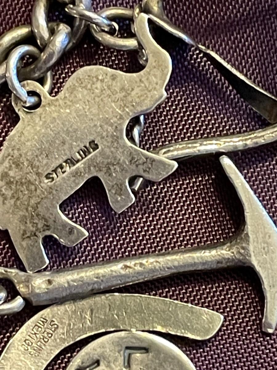 This sterling silver bracelet has seventeen sterling silver charms. Those charms not marked, tested positive for sterling. The charms are a variety of animals, good luck symbols, shoes, and other cute figurals. The bracelet is about 7" long and weighs about 35.06 grams.