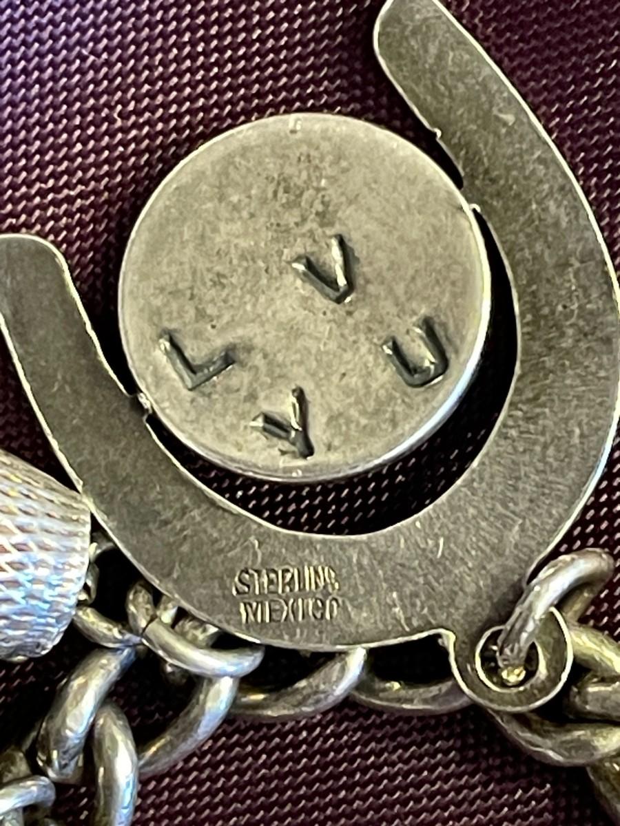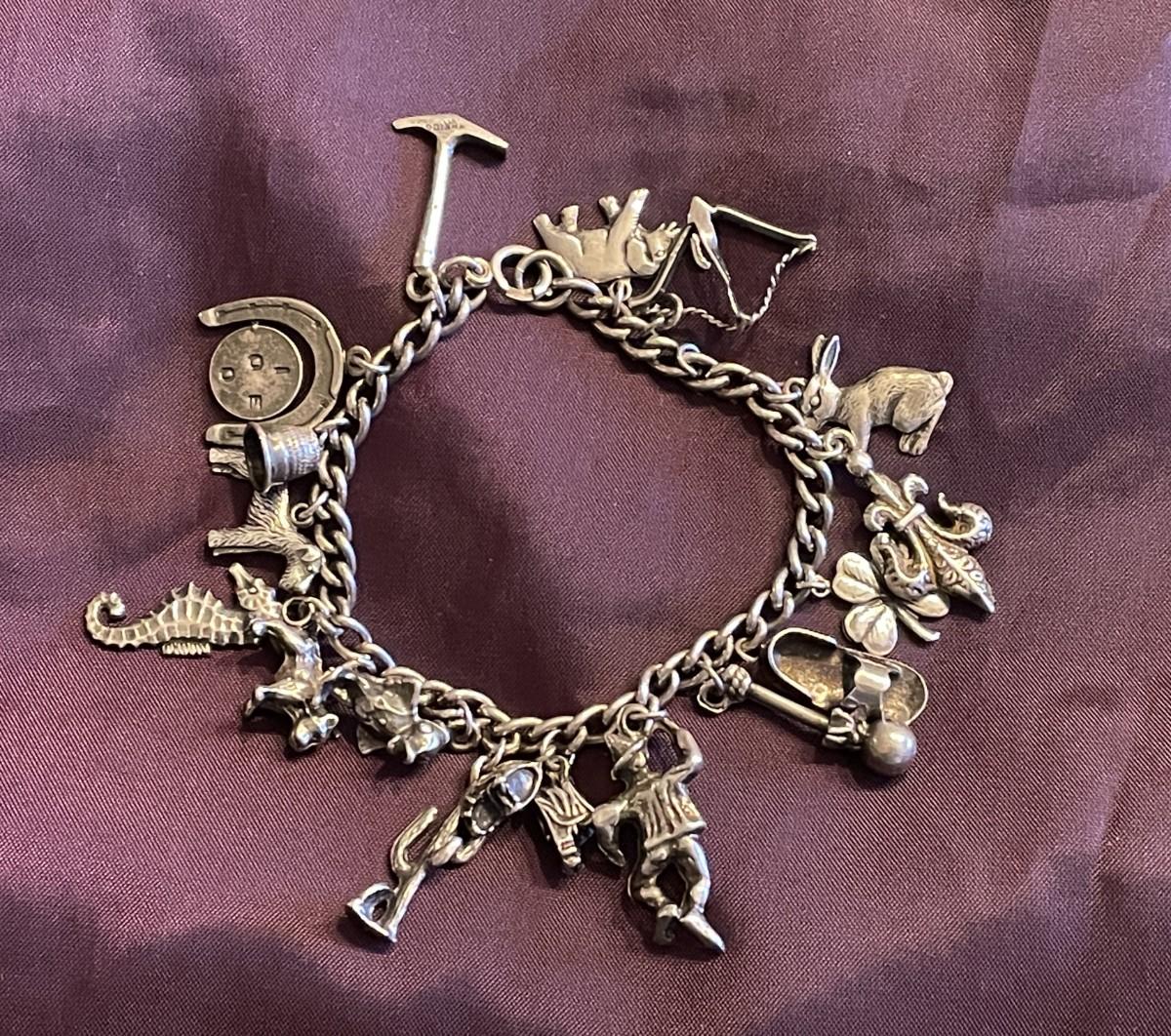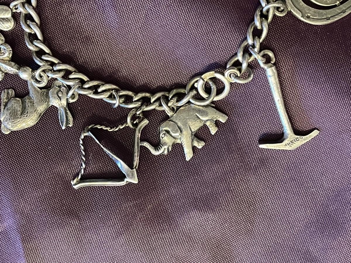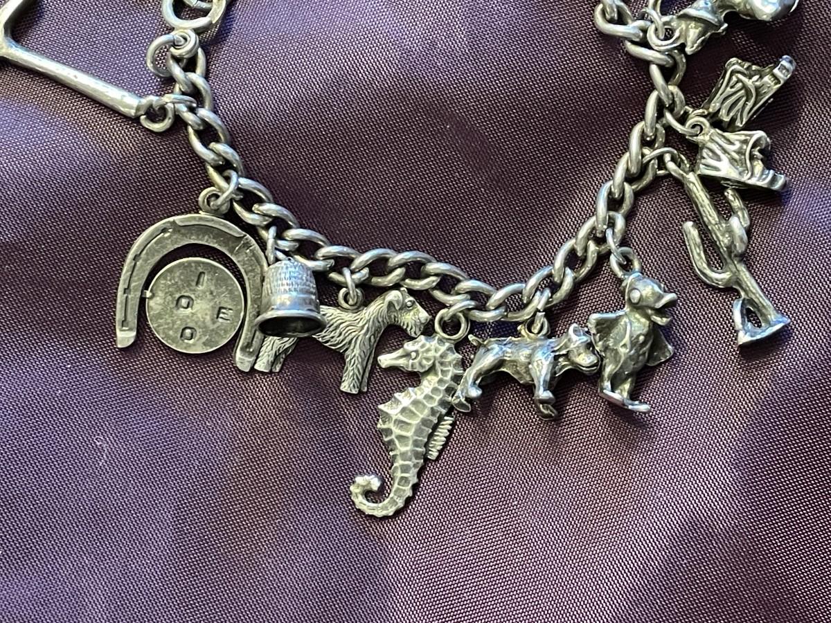 This sterling silver bracelet has seventeen sterling silver charms. Those charms not marked, tested positive for sterling. The charms are a variety of animals, good luck symbols, shoes, and other cute figurals. The bracelet is about 7" long and weighs about 35.06 grams.