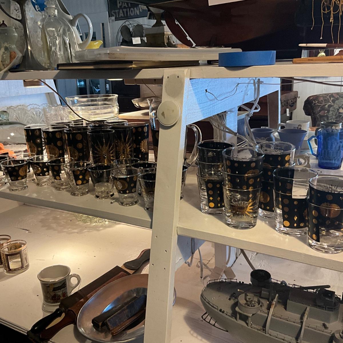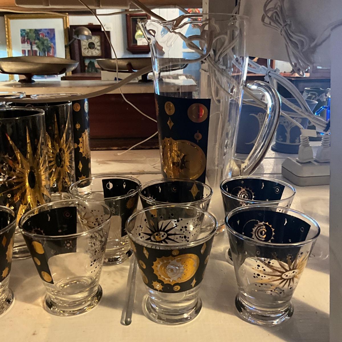 Pitcher and Stirrer, 13 small cordials, 13 small rocks, 12 high ball glasses
