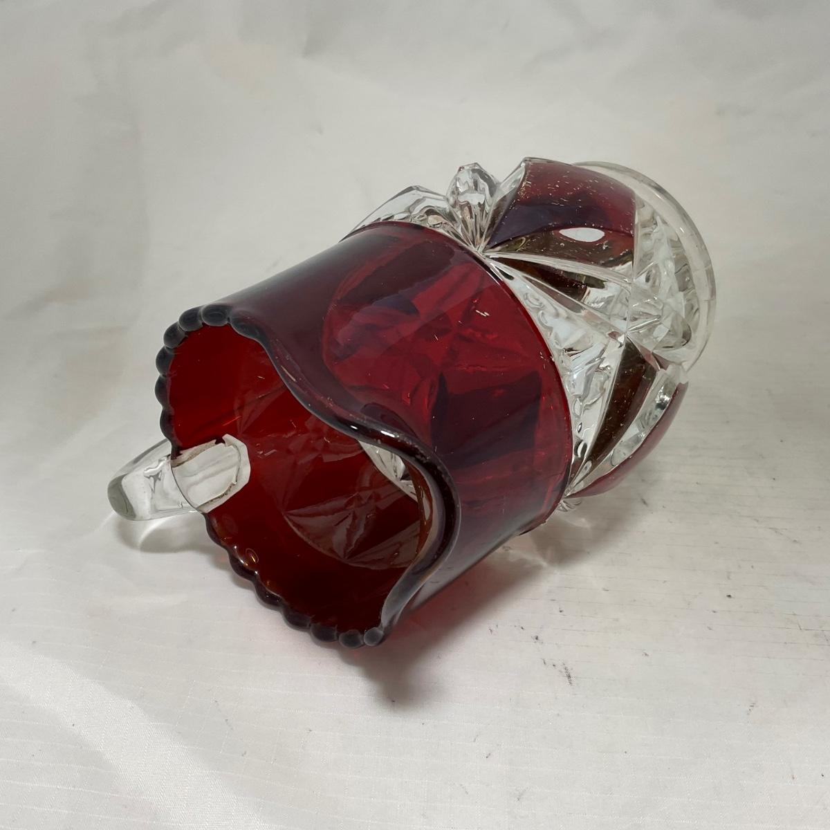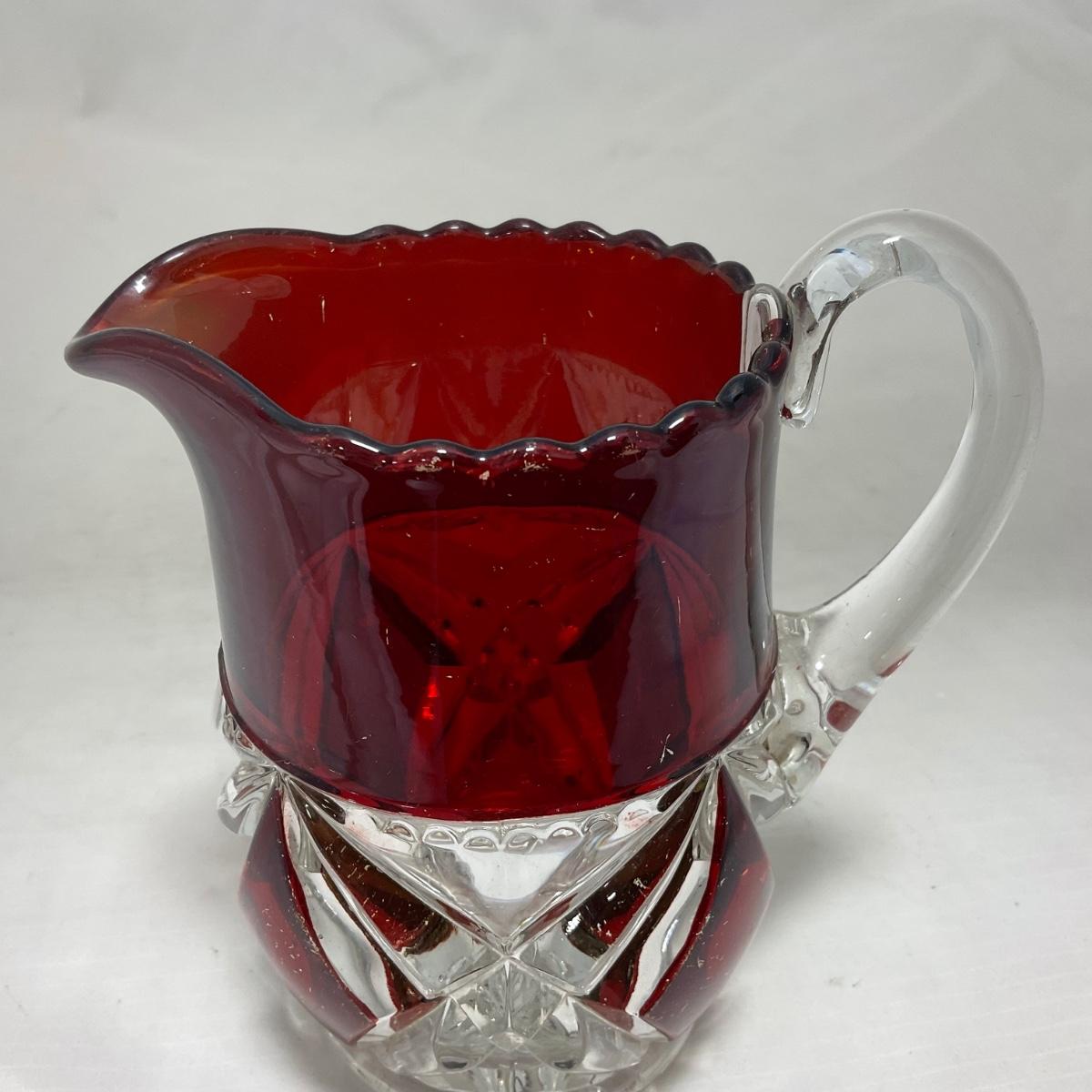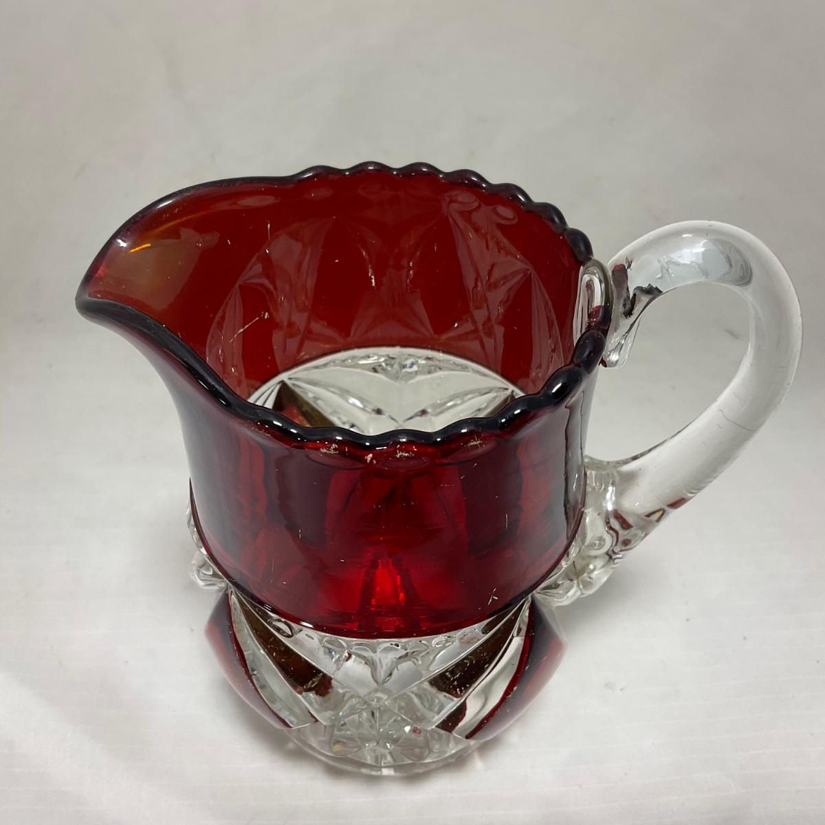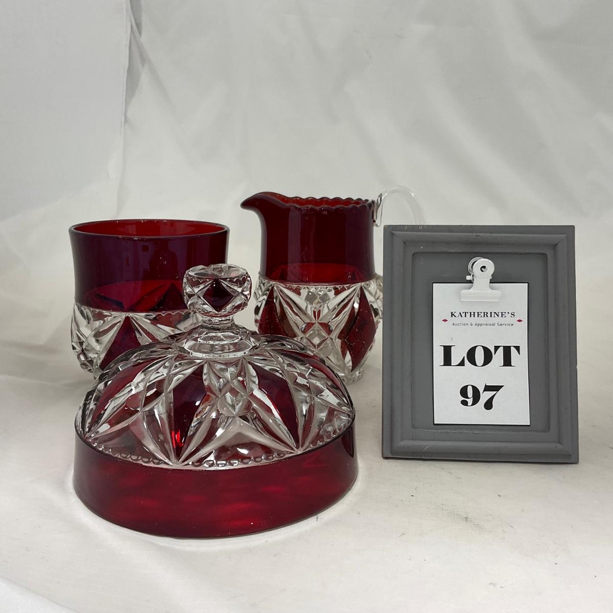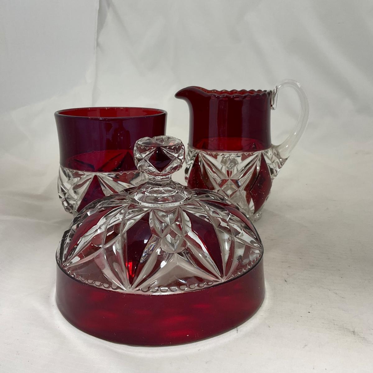 -97- Heavy Ruby Red & Clear Glass | Creamer & Sugar, Butter Dish Lid