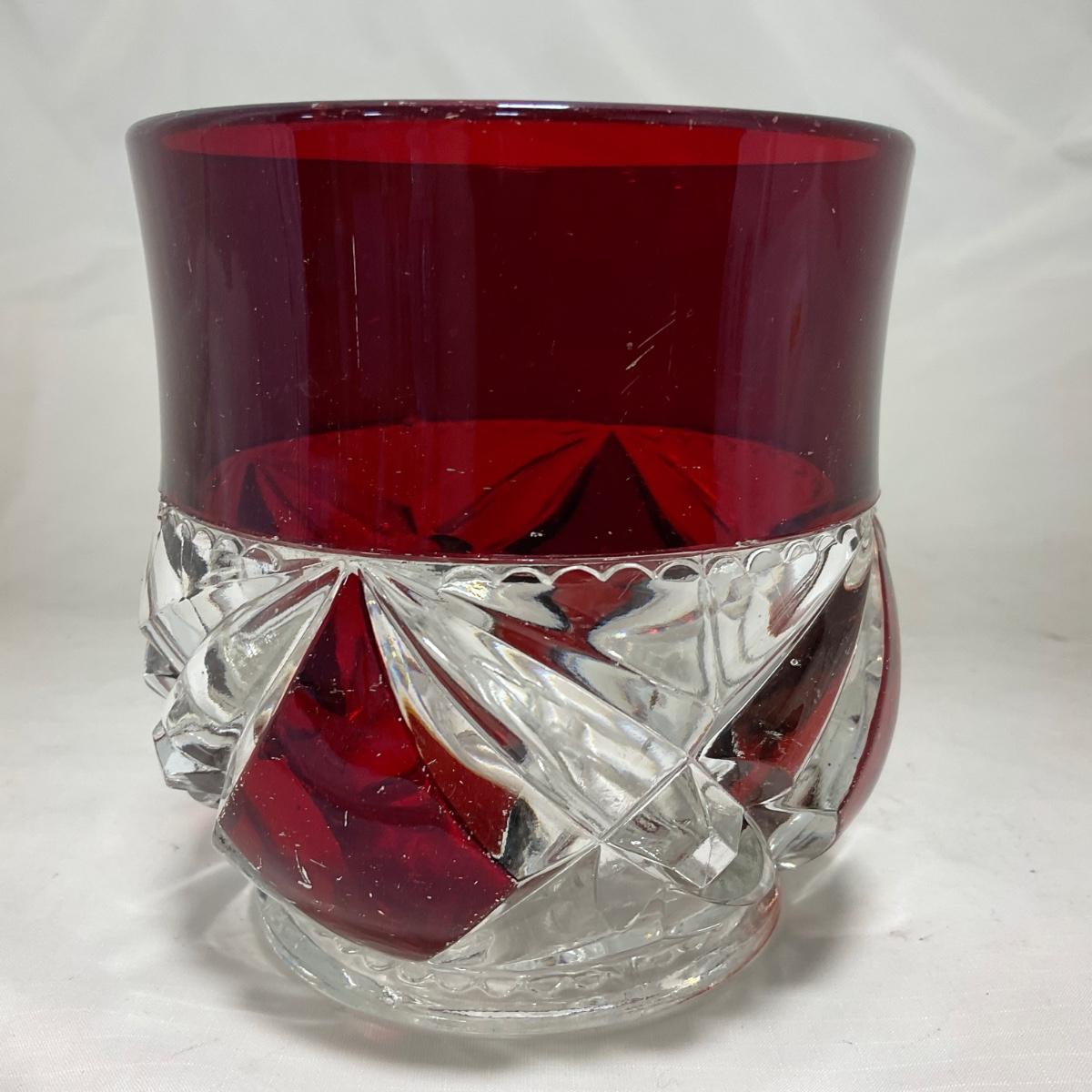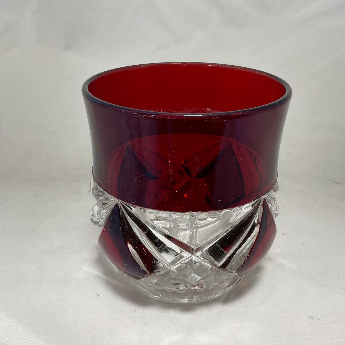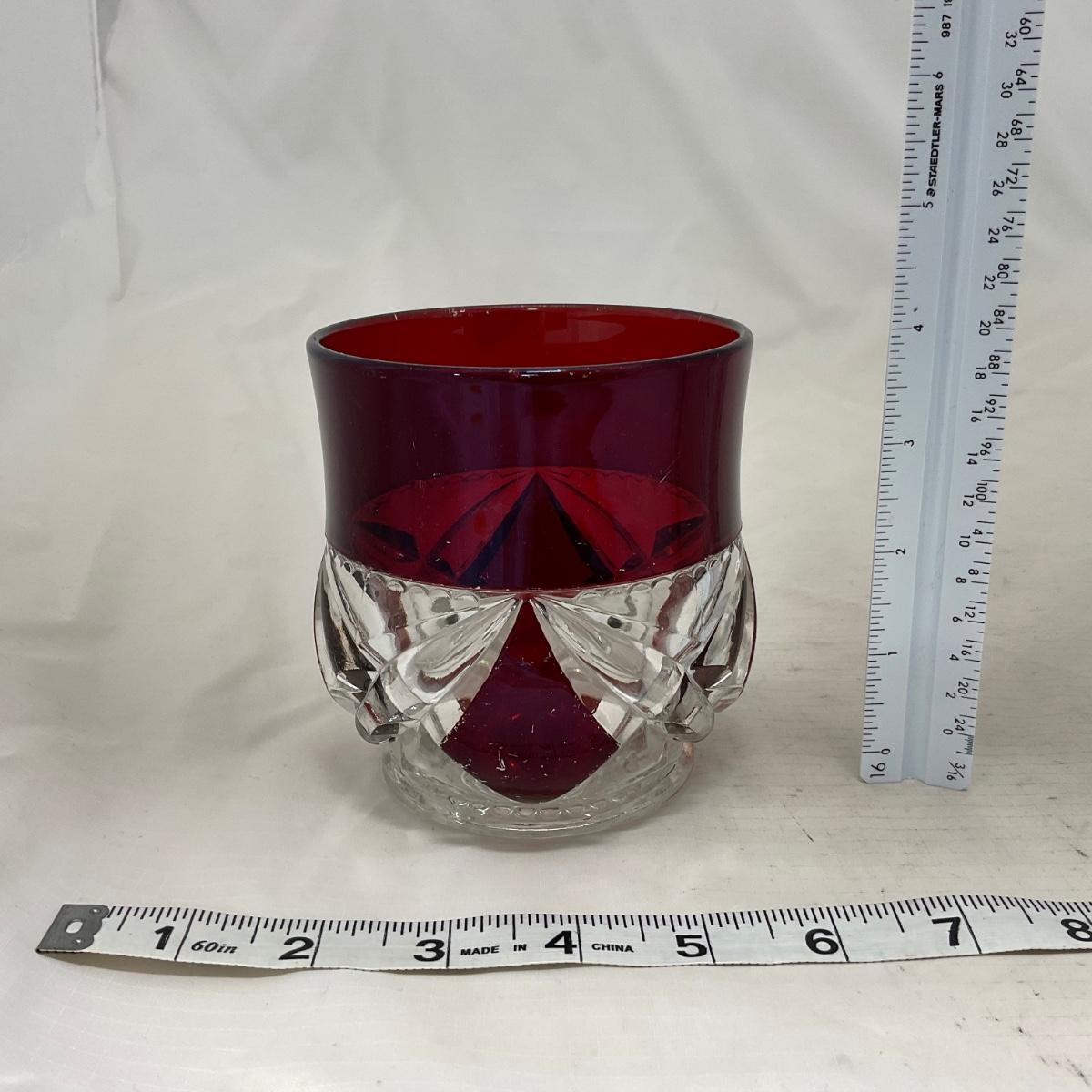 This three piece heavy ruby red and clear creamer and sugar and butter dish *LID ONLY* are so vibrantly colored. They are well loved so do have some worn and missing coloring. Please see photos for details and condition. ::: Shipping is available on this lot. If you require shipping you must let us know at the close of the auction. We will coordinate with you after the item has been won. Shipping fees will include insurance up to or exceeding the value of all items being mailed. If you have any questions regarding this lot please contact the auctioneer either via this website, by direct email or by phone. PICK UP TIMES and other important information can be found in the TERMS and DESCRIPTION of the auction. Please take a look for pertinent information. Thanks!