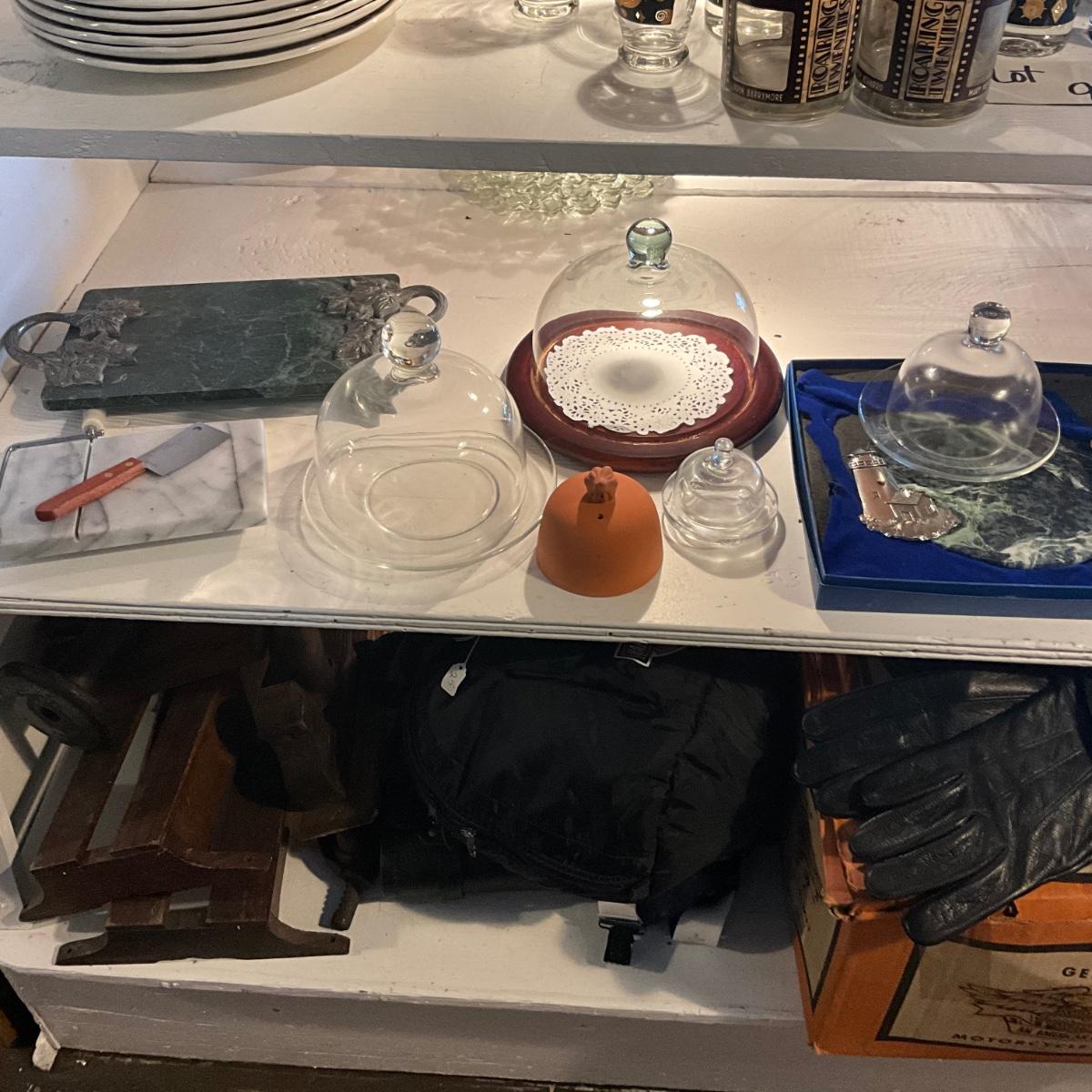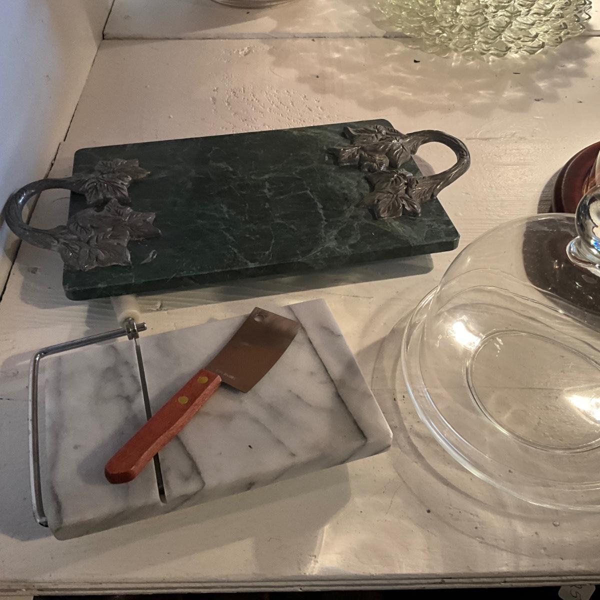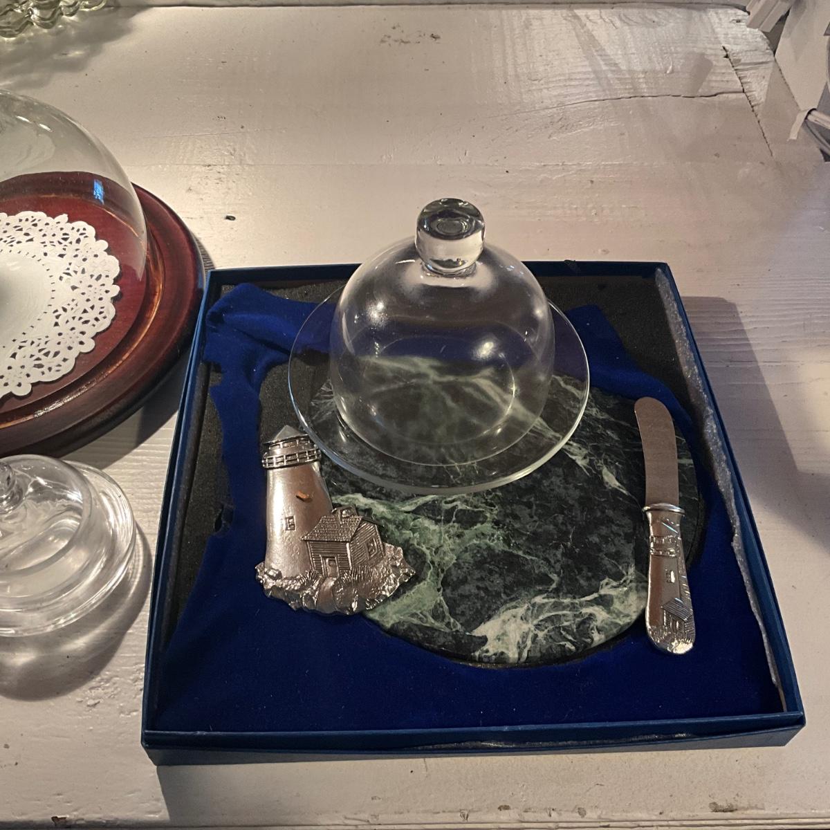 Various marble cheese boards with knives and glass clear dome cheese covers