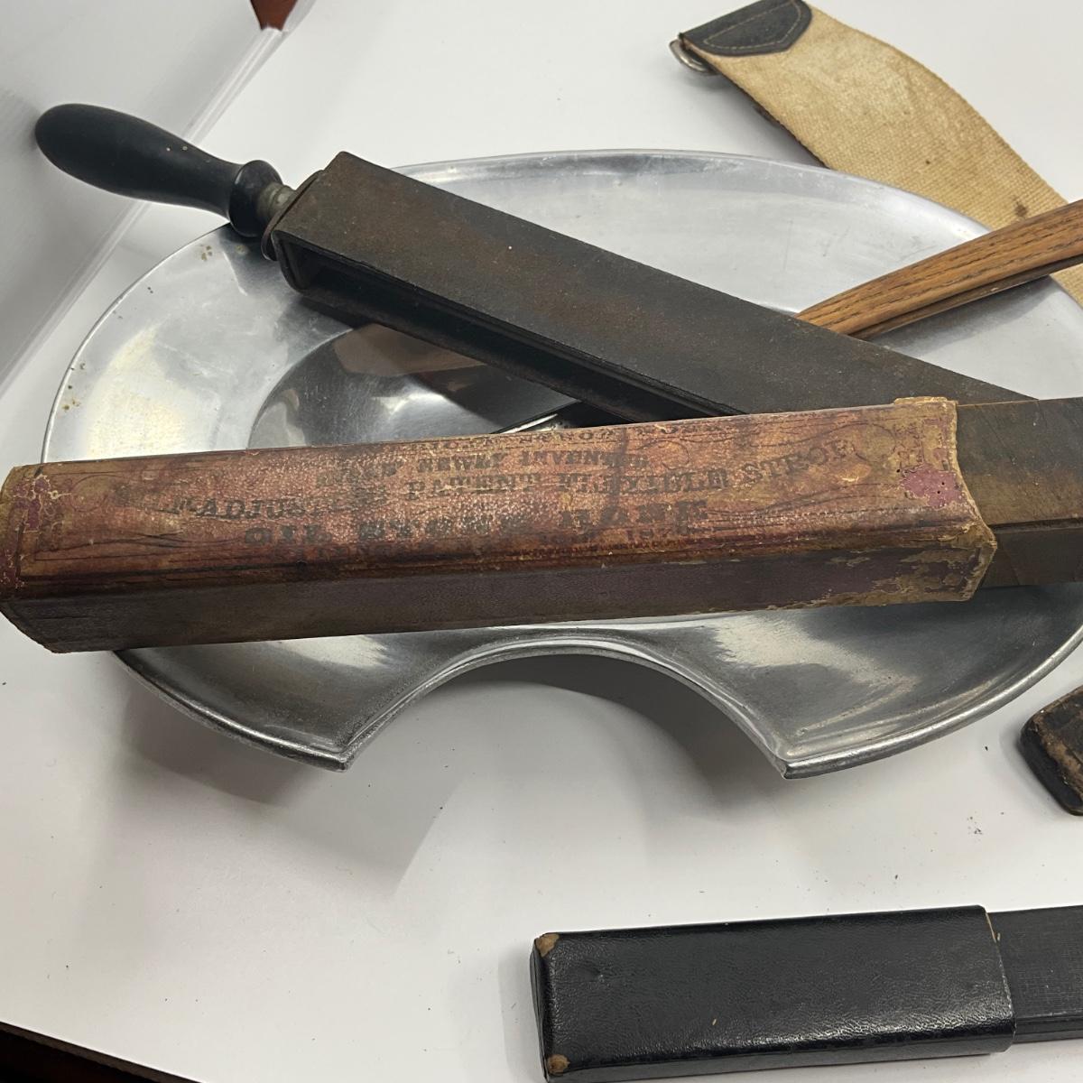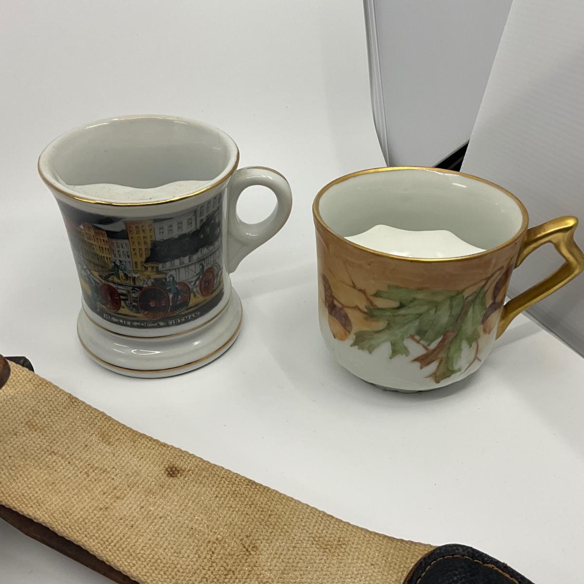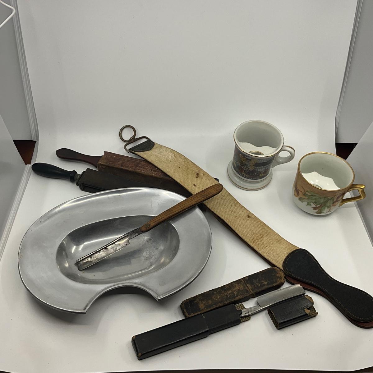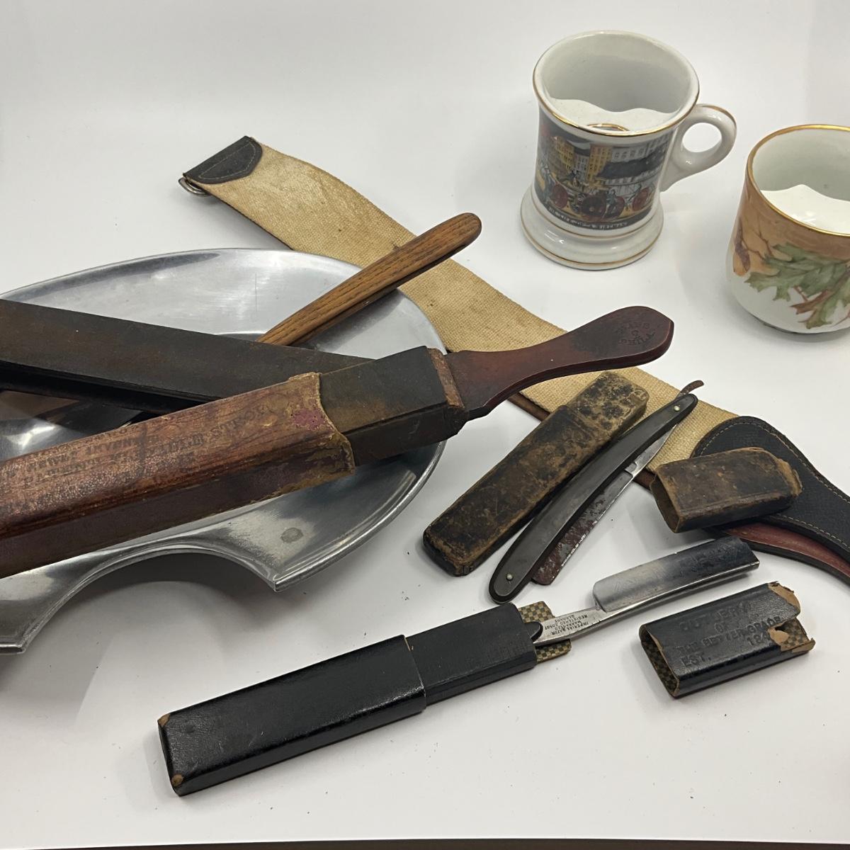 Pewter shaving tray, hand painted porcelain mustache mugs, leather strap sharpener and two razors.