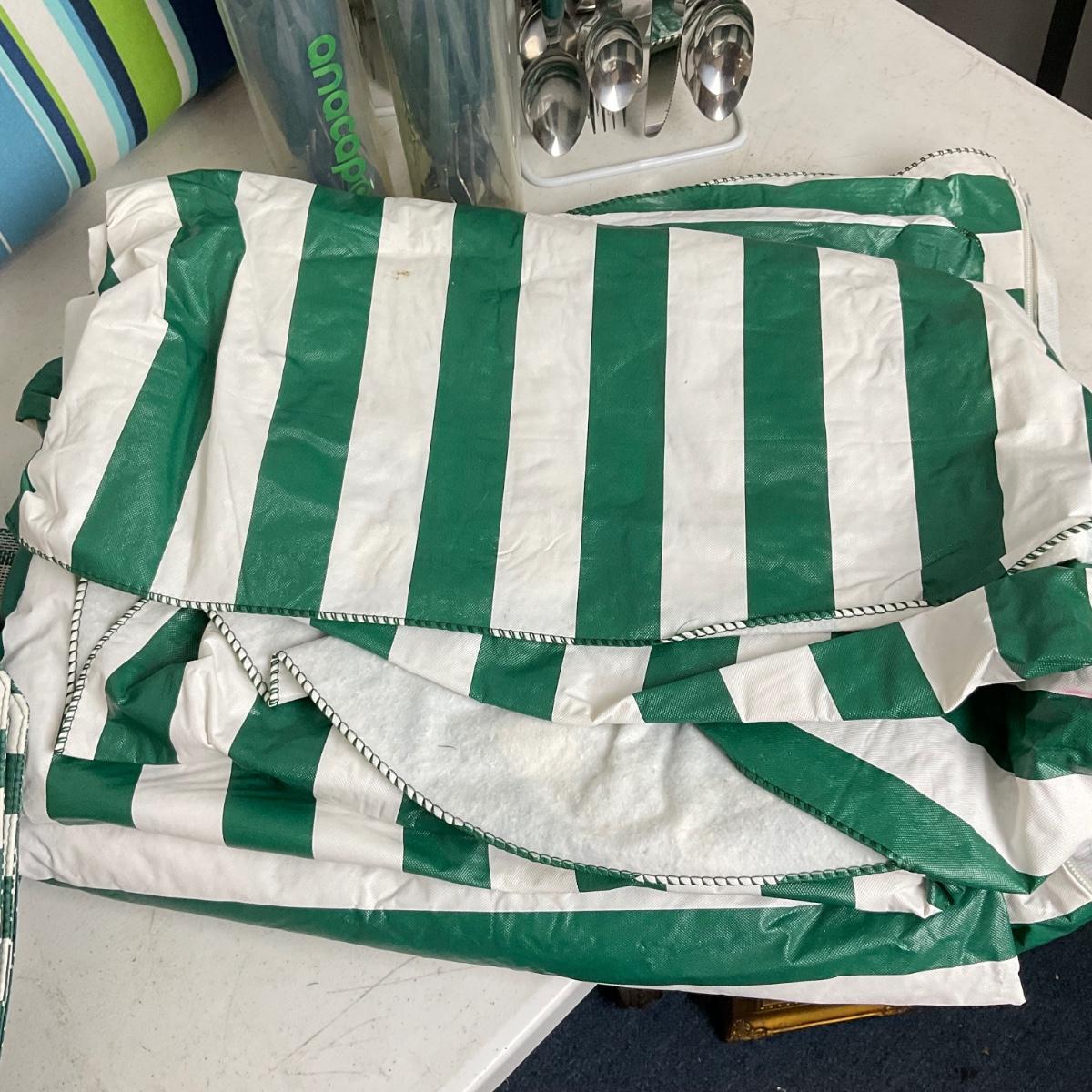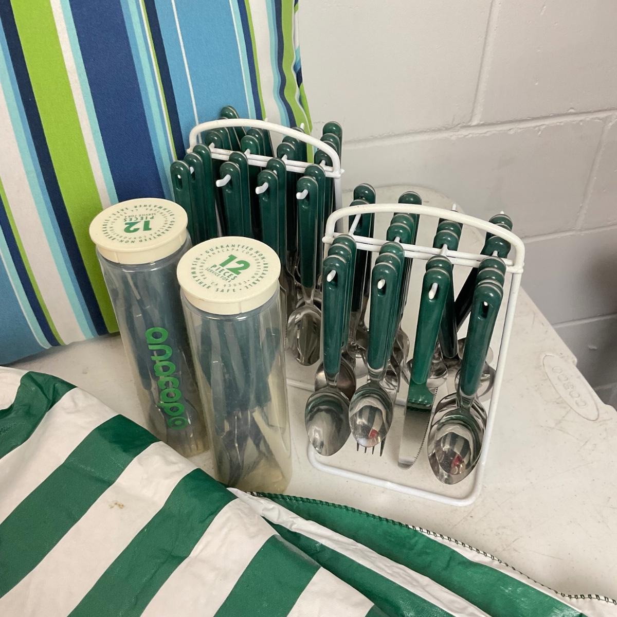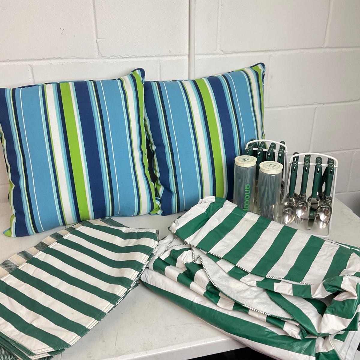 green striped table cover , placemats, 2 pillows, 4 sets of 12 ( 1 missing spoon)