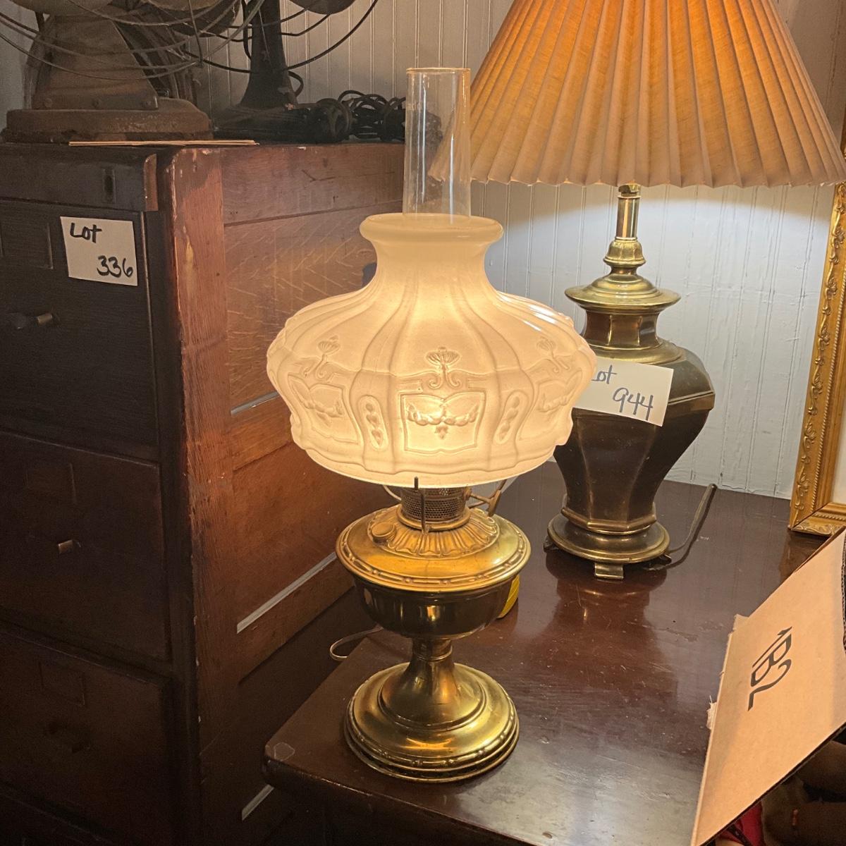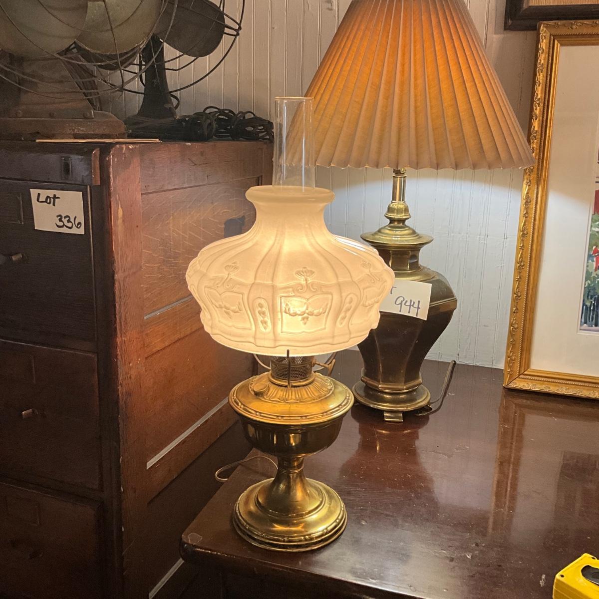 975 Antique Brass Electrified Oil Lamp with Milk Glass Shade
