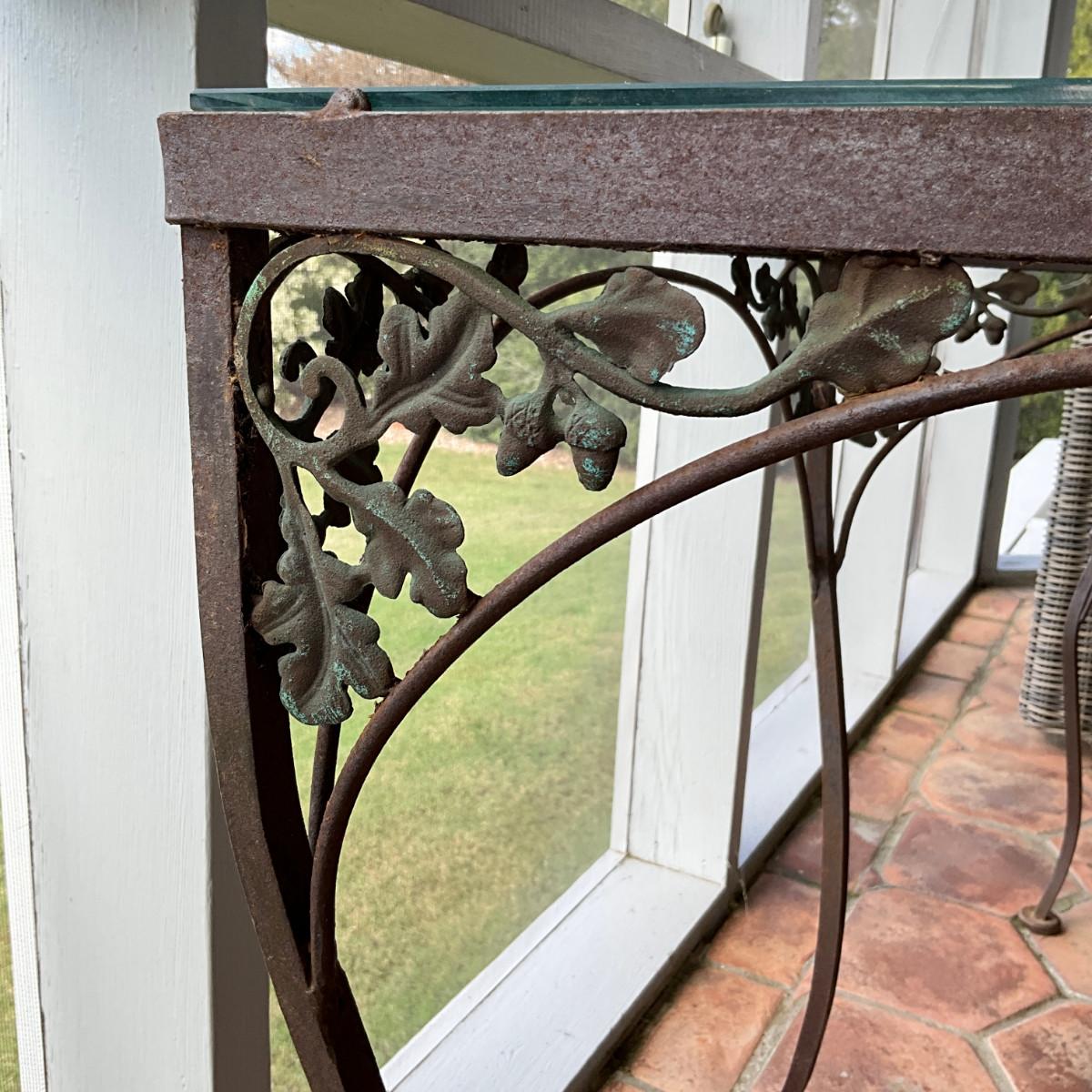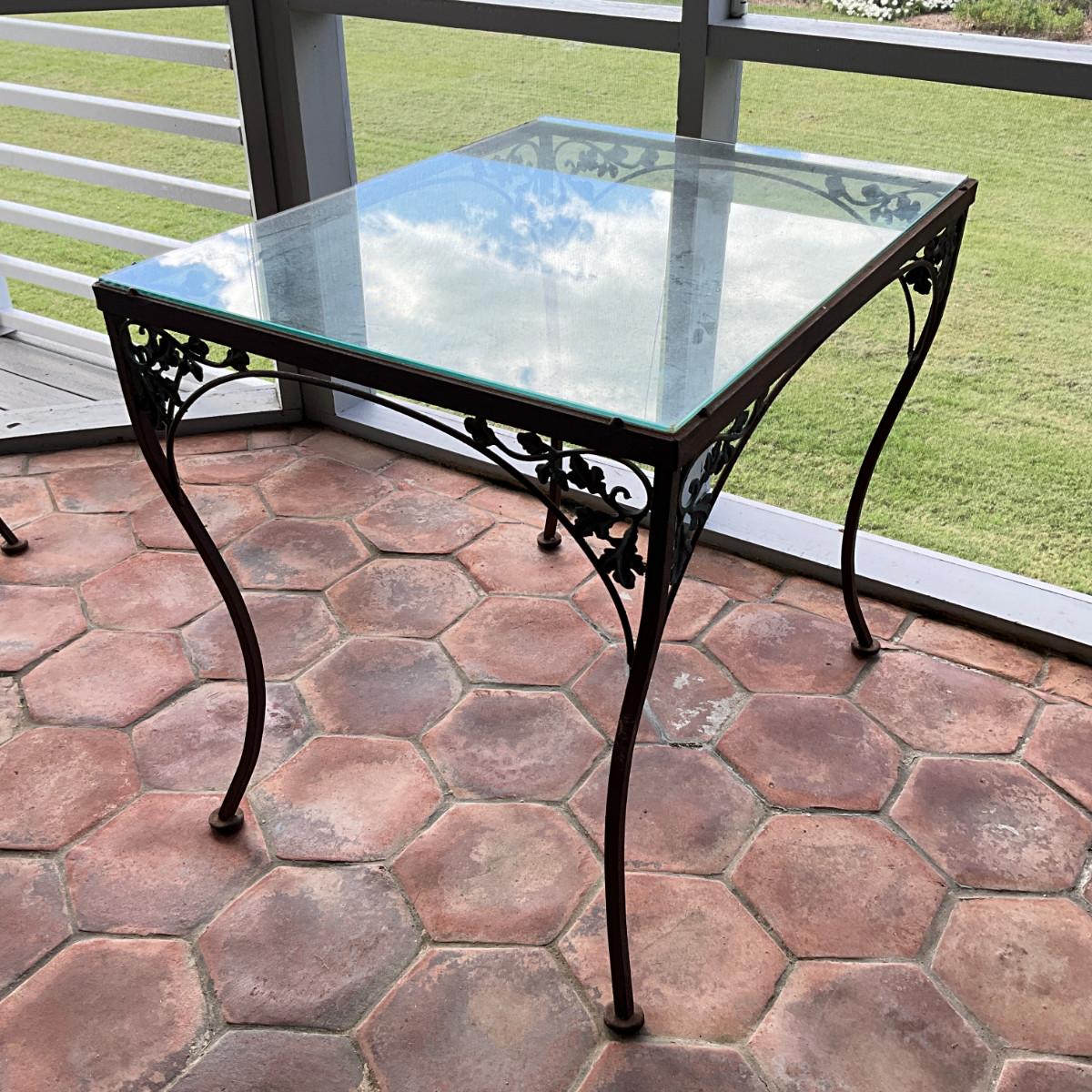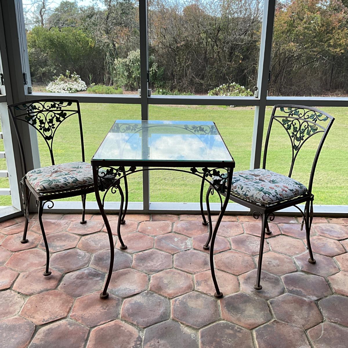 975 Vintage Woodard Wrought Iron Painted Wrought Iron Glass Top Table With Matching Two Chairs