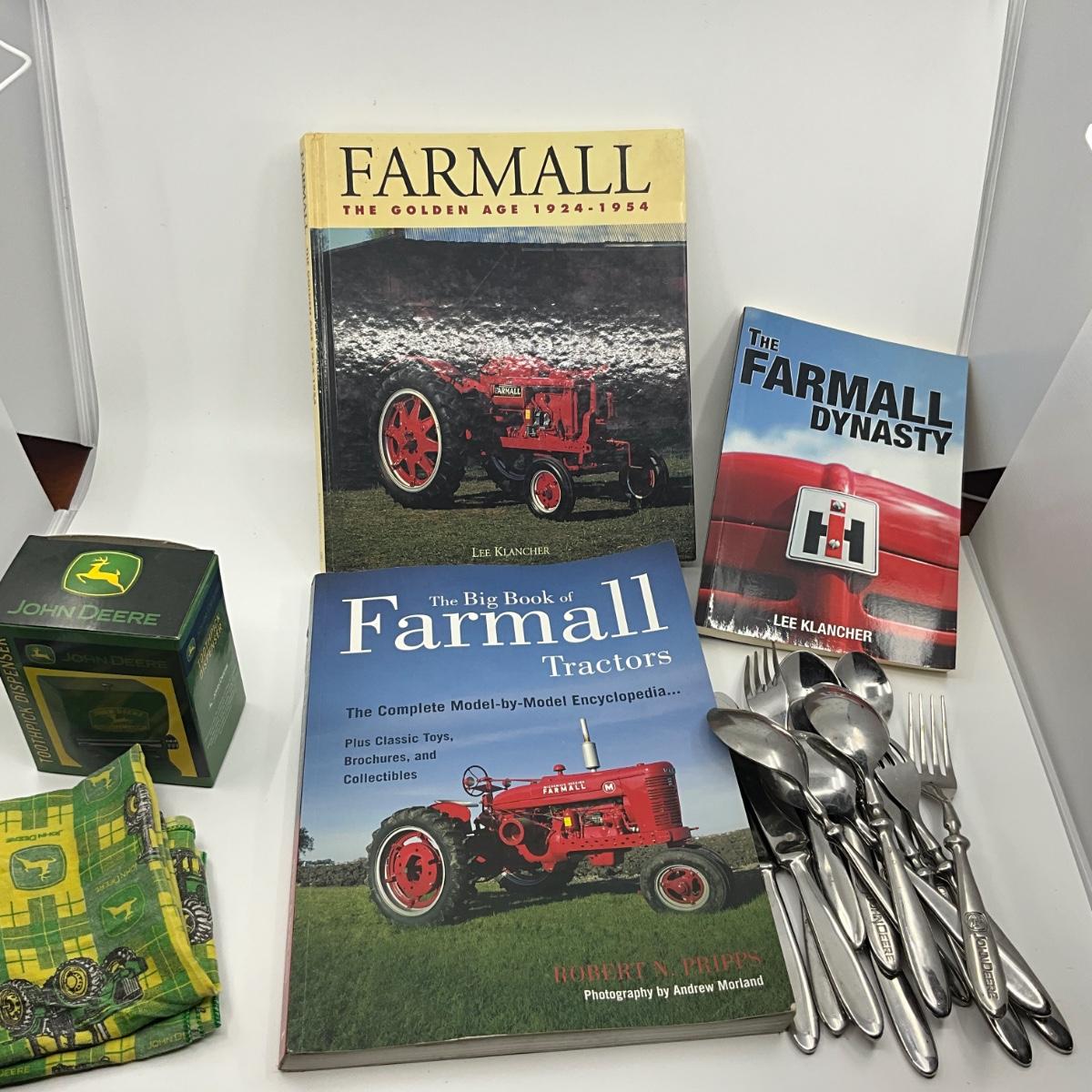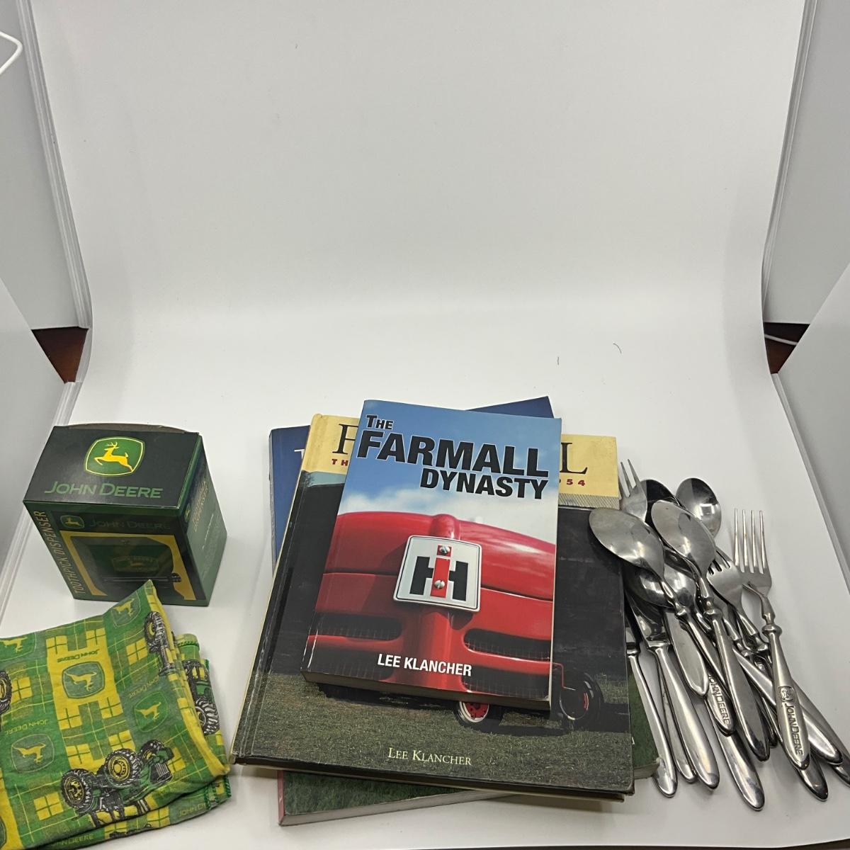 Vintage flatware with John Deere, Scarf and brush holder, three books on Farmall Tractors
